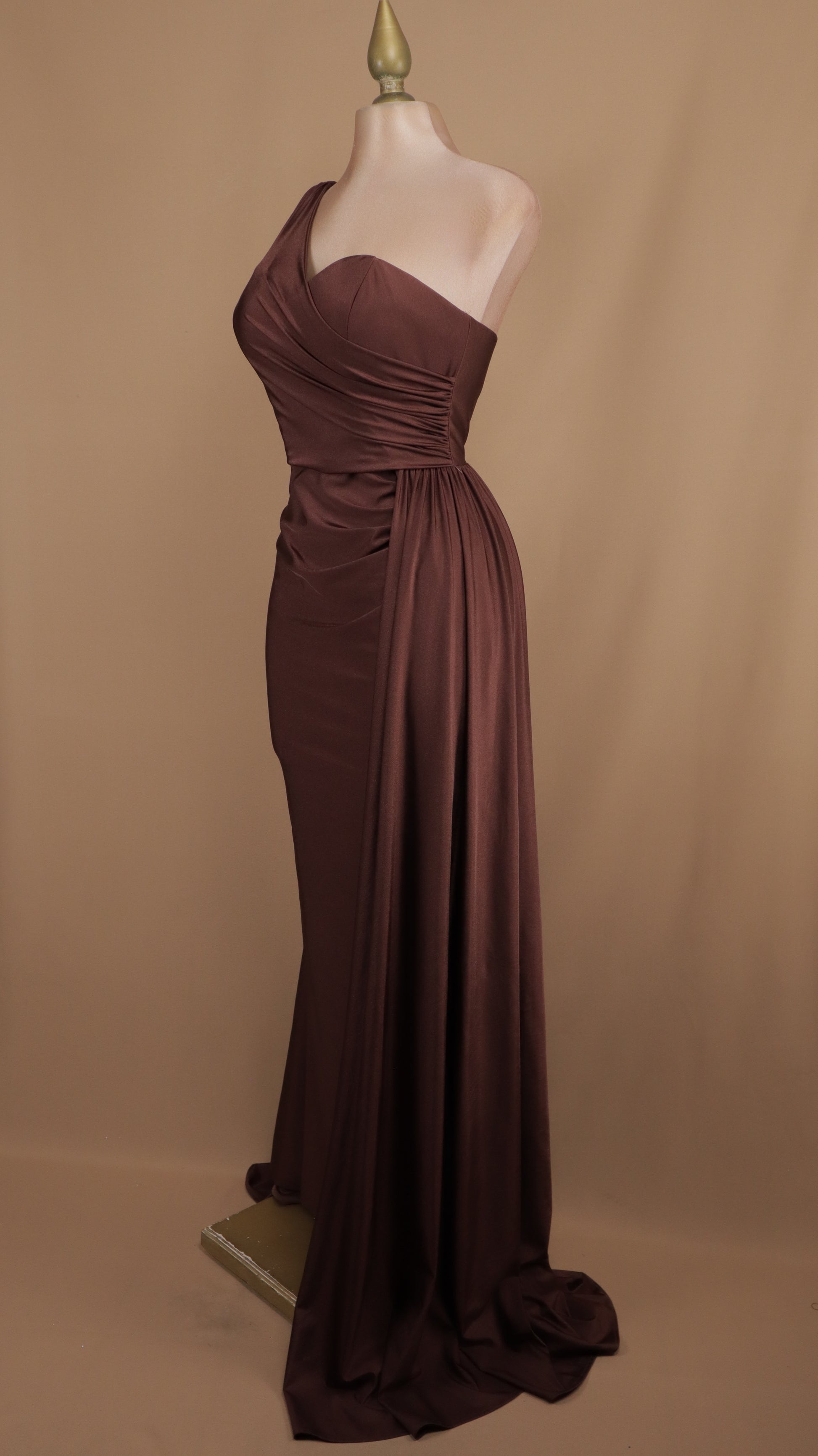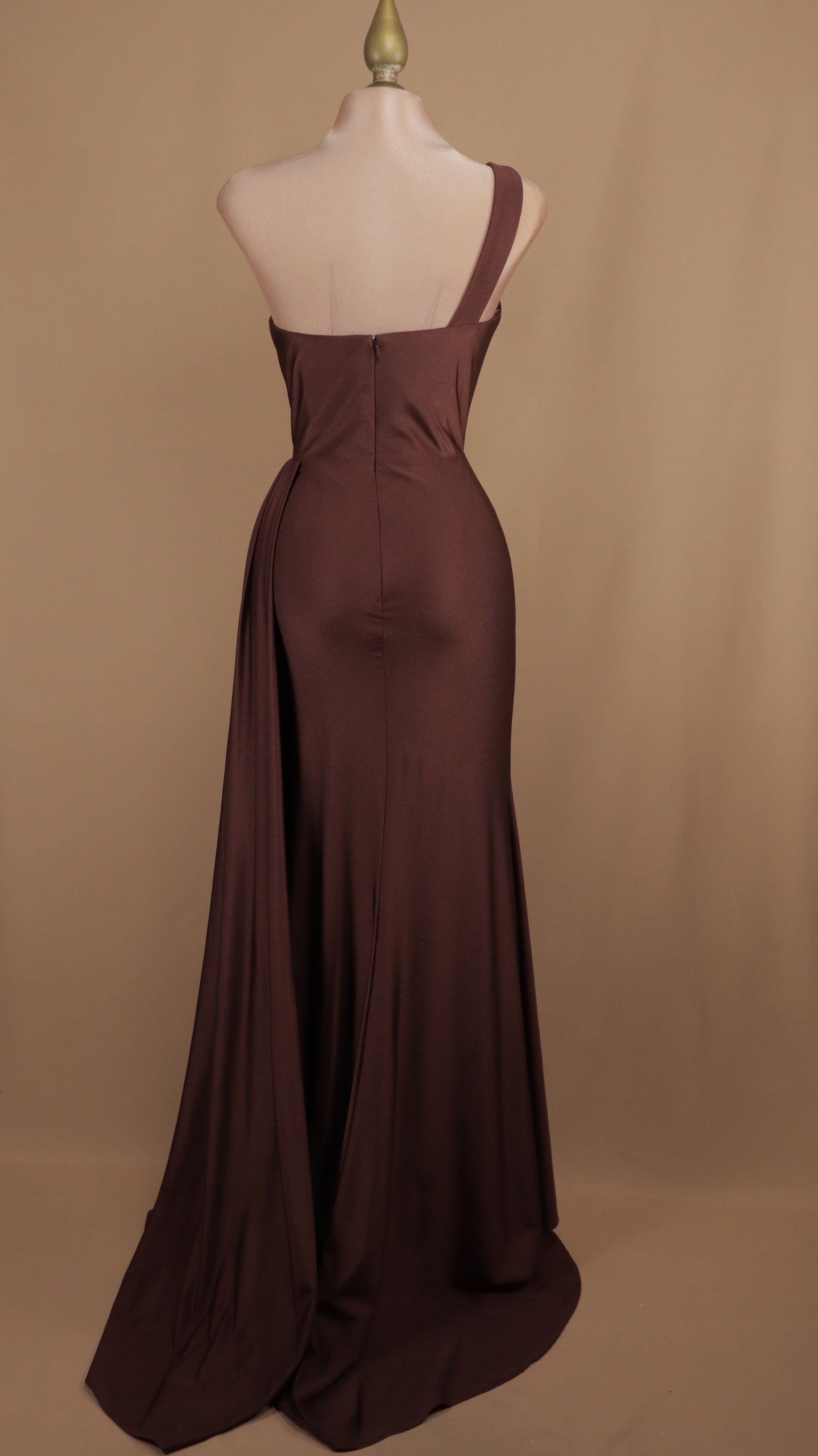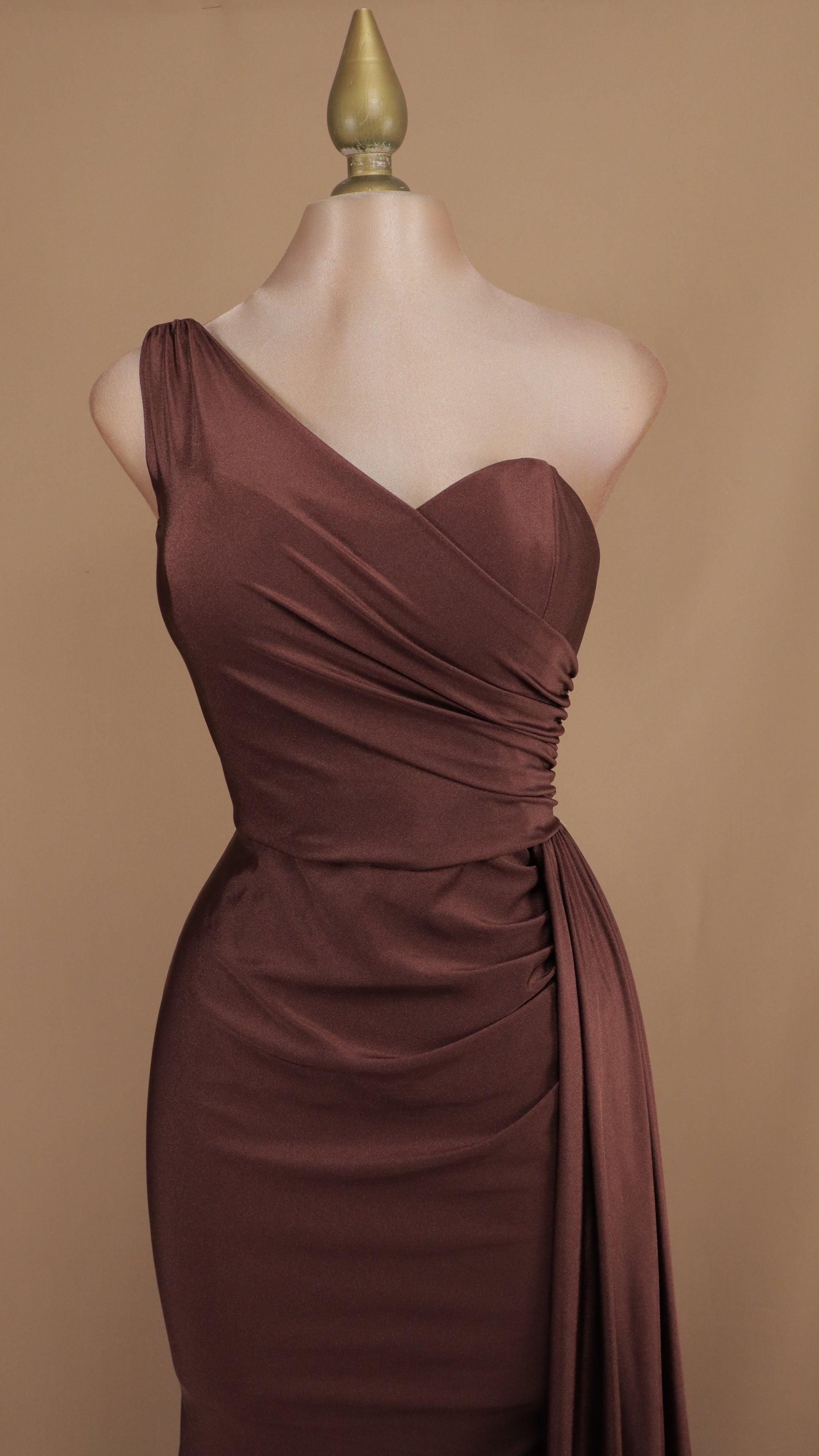 ¡Realza tu estilo con nuestro elegante vestido largo de licra ajustada! Con un escote asimétrico y una estola en la falda, te verás y te sentirás sofisticada para cualquier ocasión.
