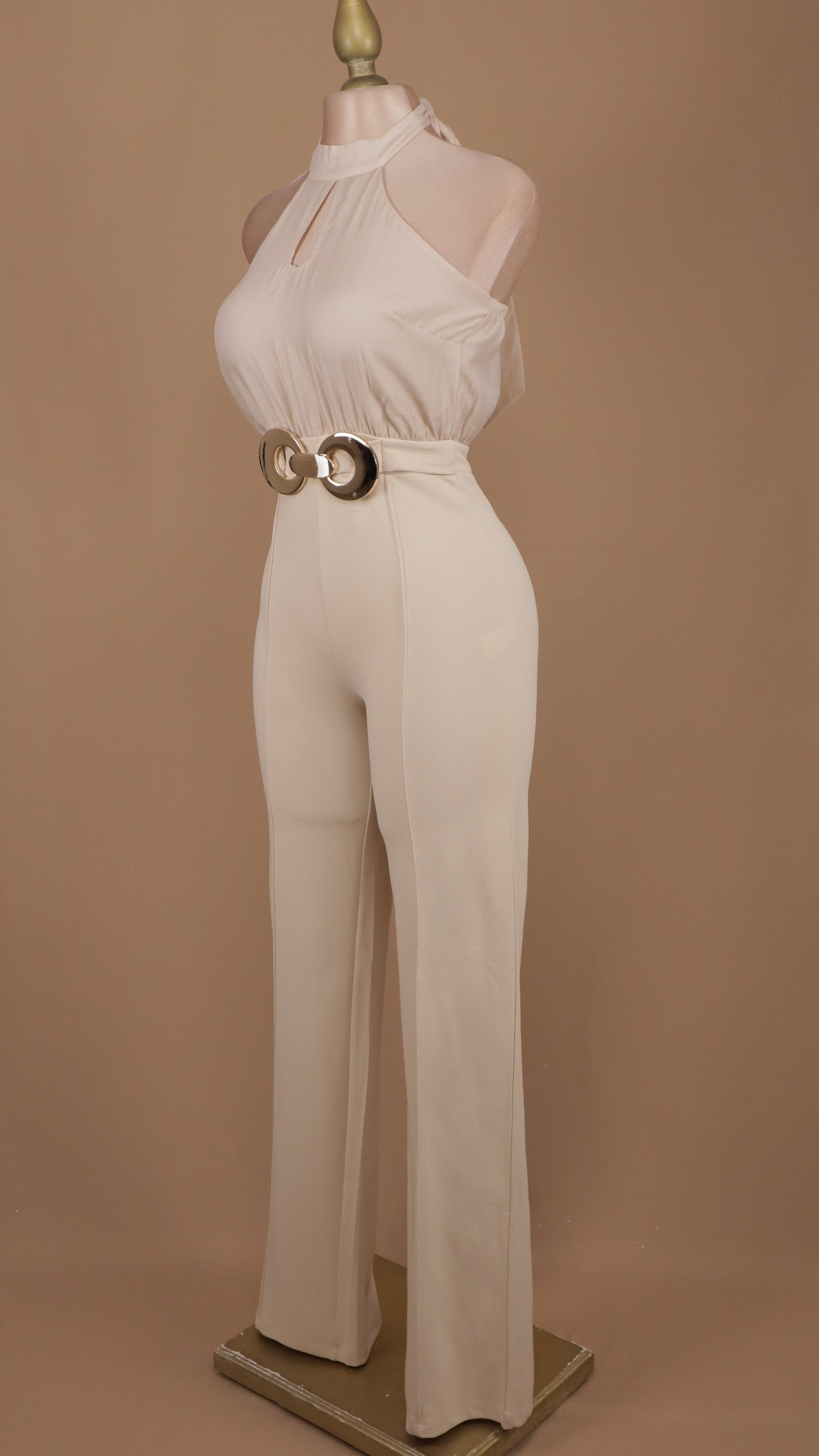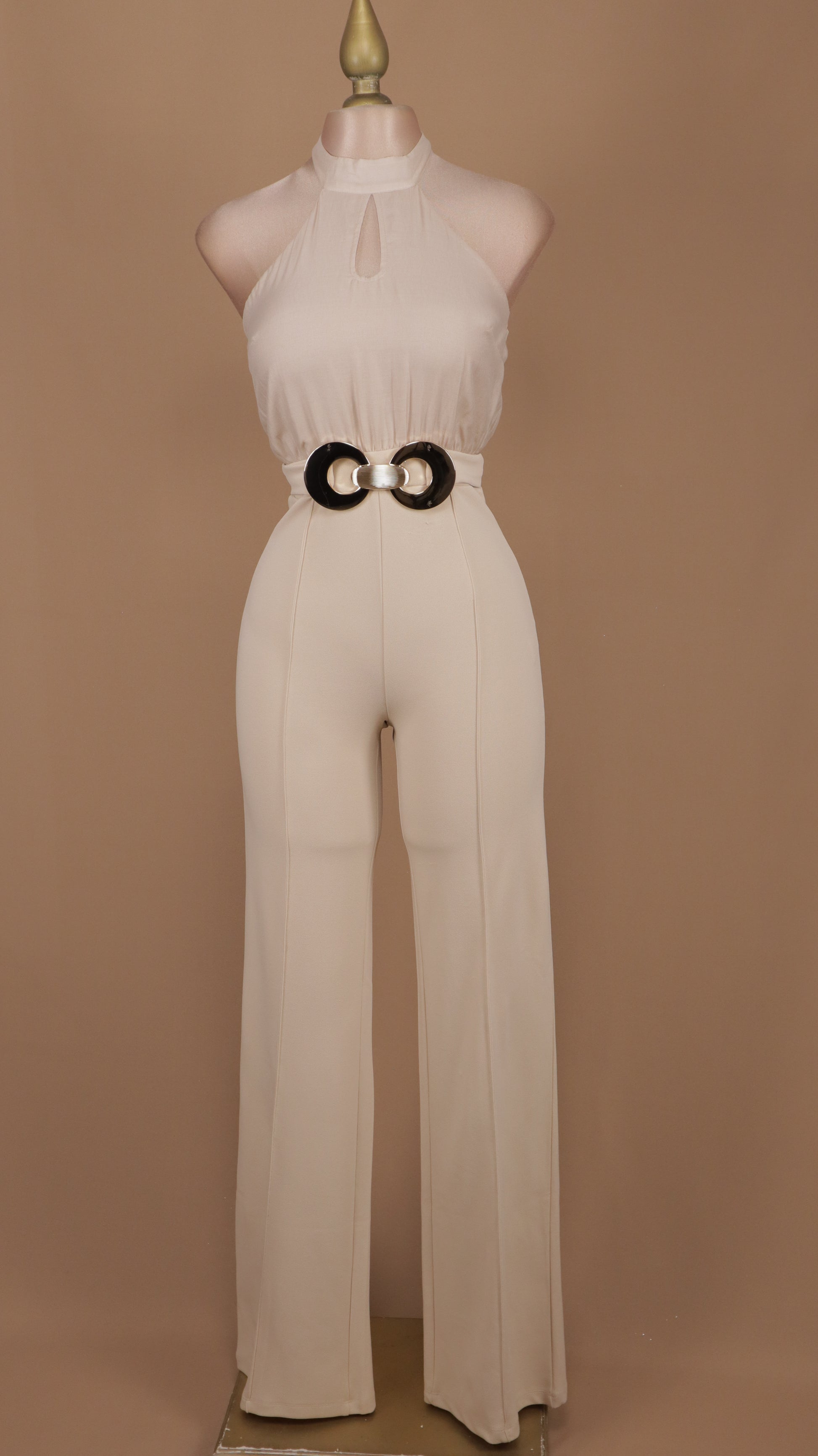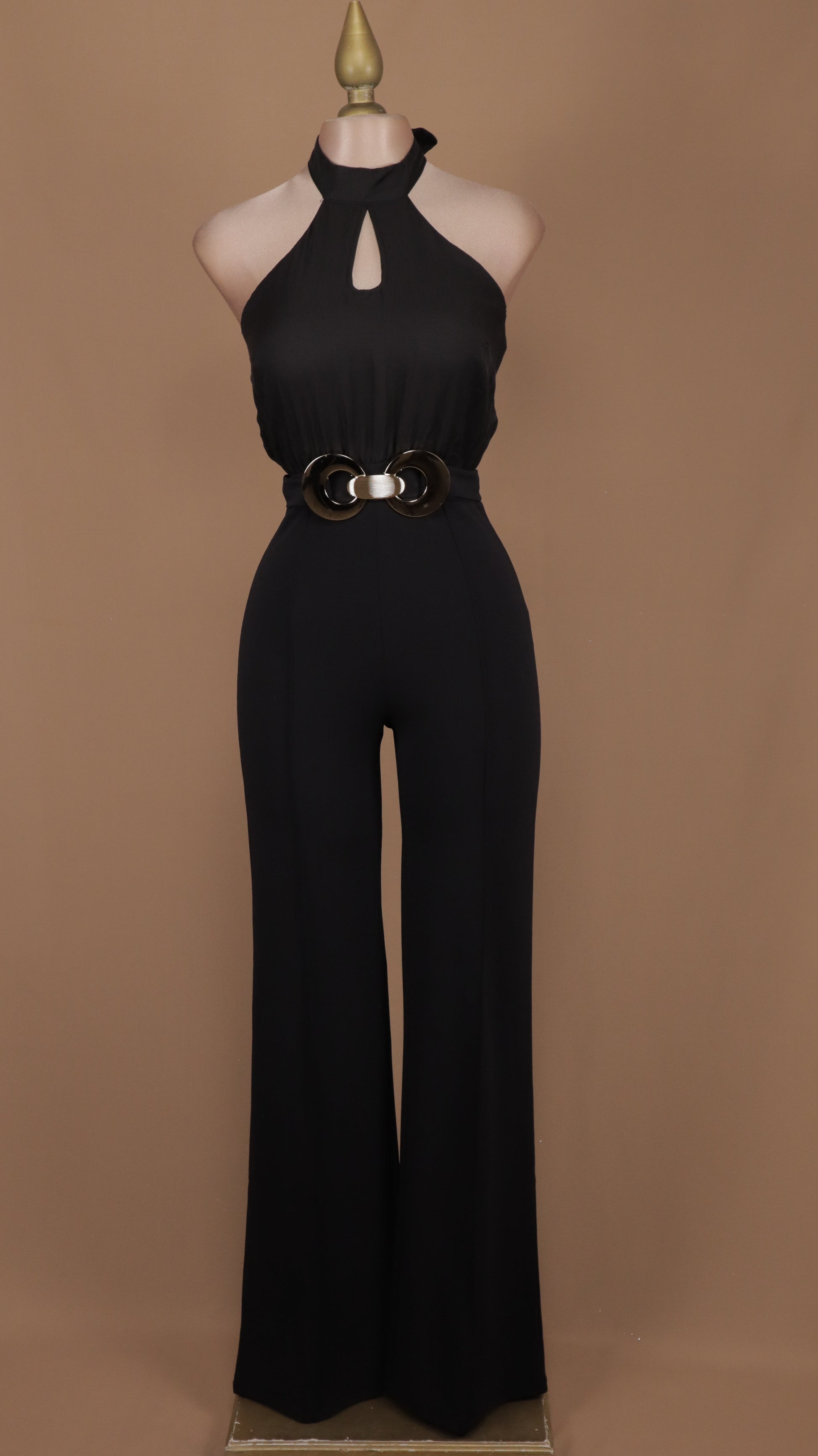Este palazzo con cuello halter y hebilla en la cintura combina estilo y comodidad para cualquier ocasión. Su diseño favorecedor realza la figura mientras la hebilla ajustable asegura un fit perfecto. Ideal para lucir elegante y sentirte segura todo el día.