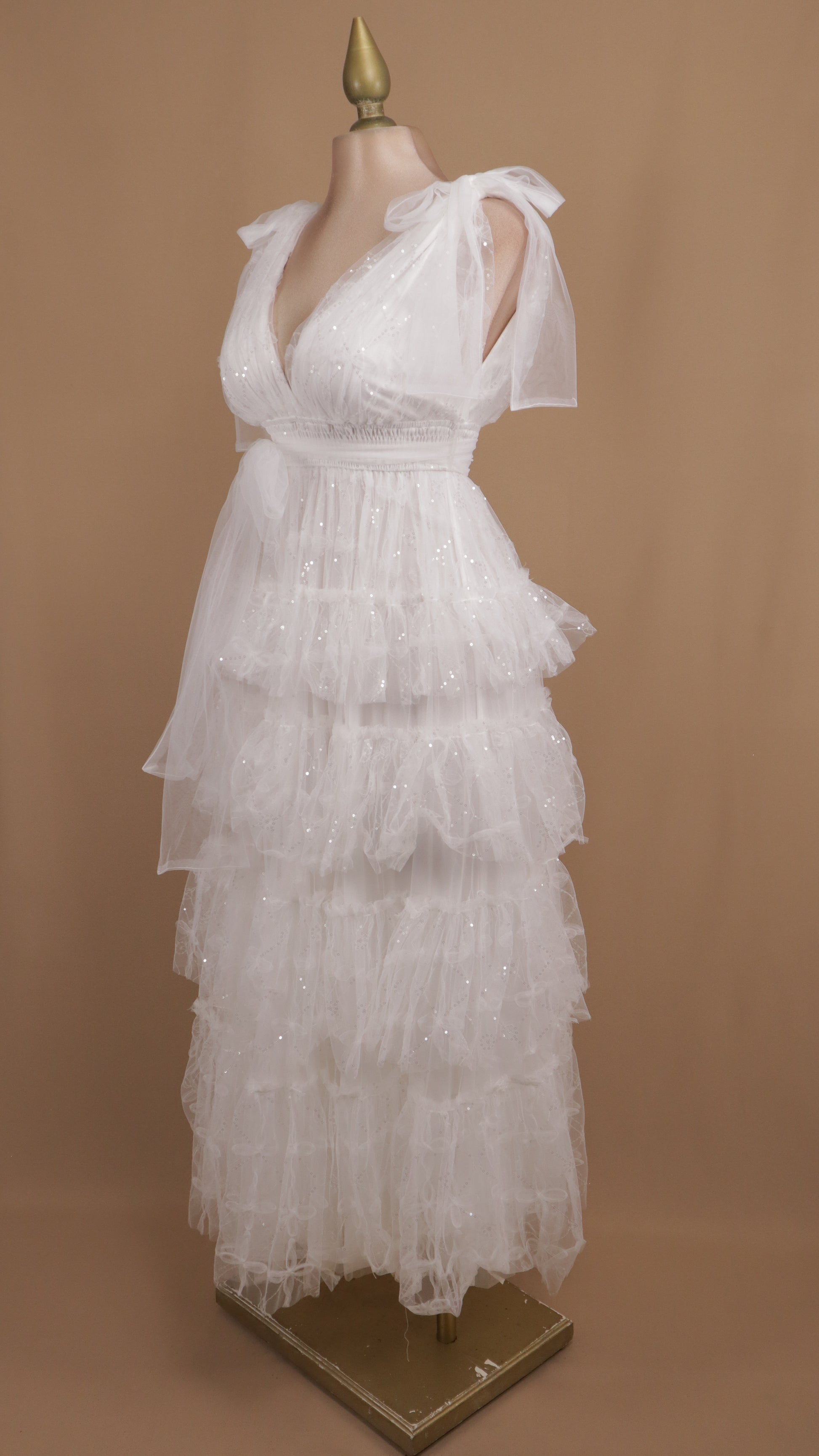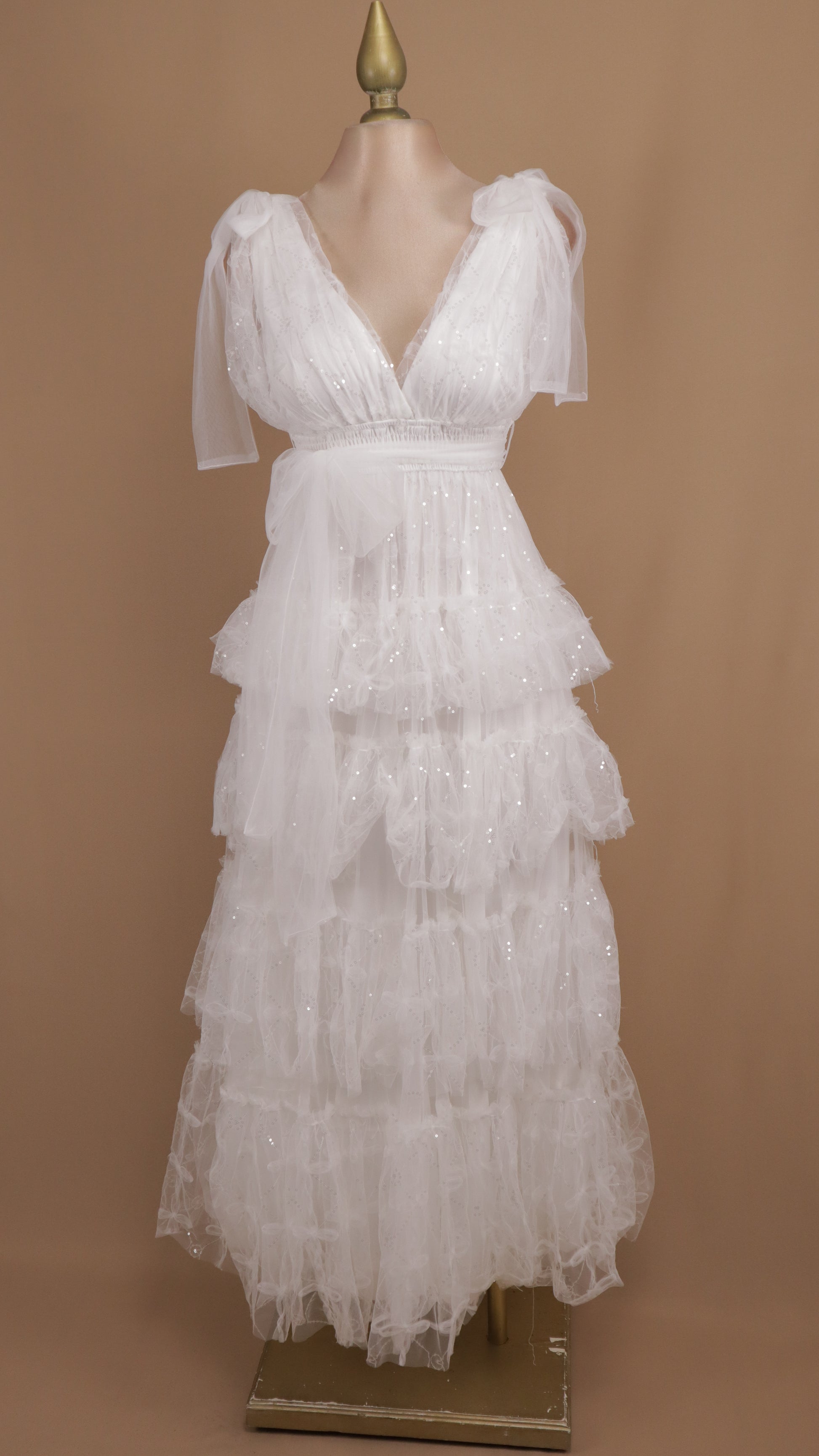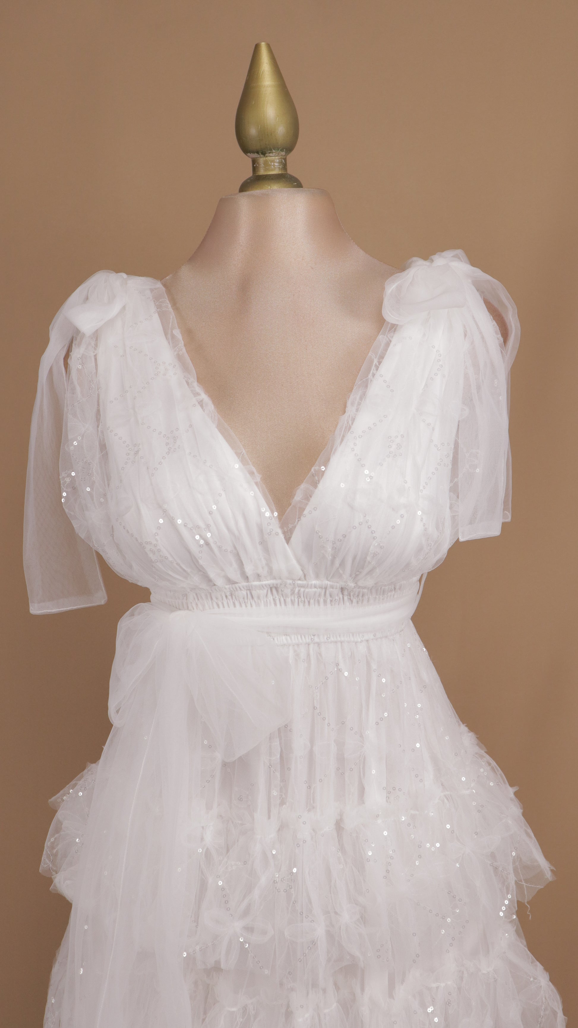 Descubre la elegancia en su forma más pura con este vestido blanco que combina sofisticación y movimiento. El escote en V realza tu figura de manera favorecedora, mientras que los volantes añaden un toque de dinamismo y feminidad a cada paso. Perfecto para ocasiones especiales, cenas o eventos donde desees lucir radiante. La tela fluida se adapta cómodamente a tu cuerpo, brindándote libertad de movimiento sin sacrificar el estilo. Un básico versátil que se convierte en tu aliado para crear looks memorables.