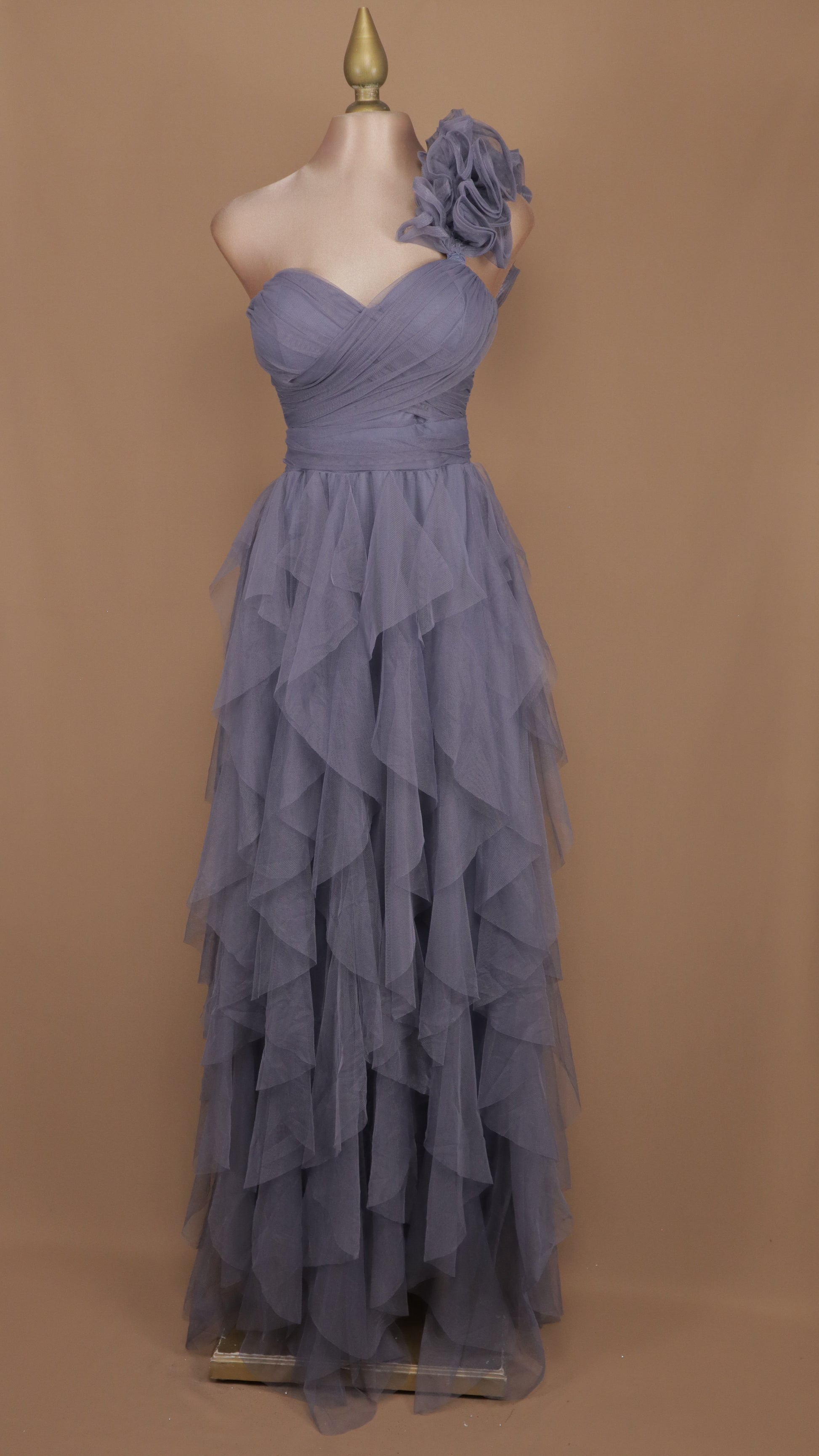 Vestido asimétrico con escarola en hombro y falda