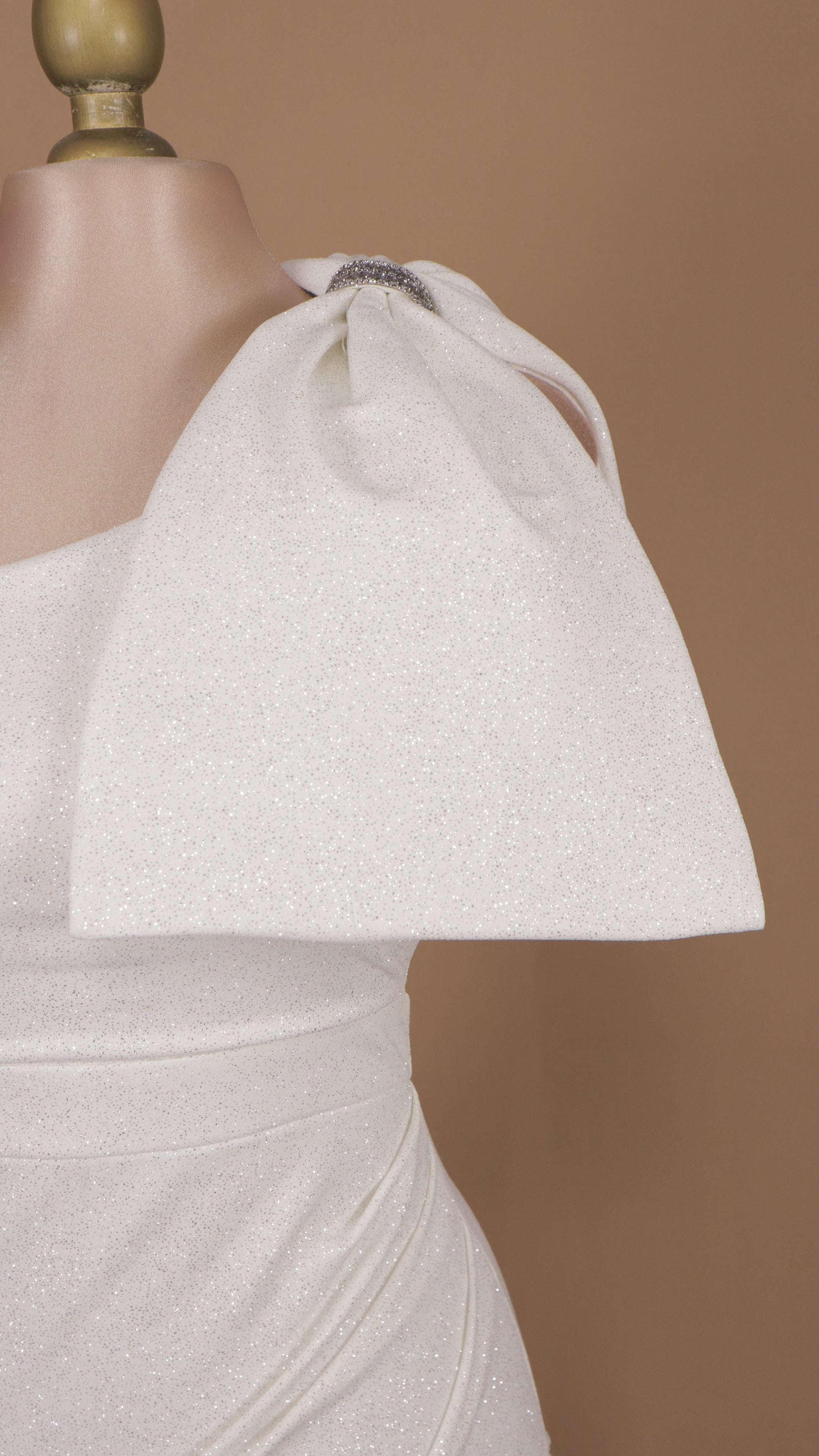 ¡Muestra tu estilo con este vestido corto con un elegante moño en el tirante! El escote asimétrico y los brillantes lo hacen perfecto para una salida nocturna. ¡Luce radiante y atractiva con este vestido único!