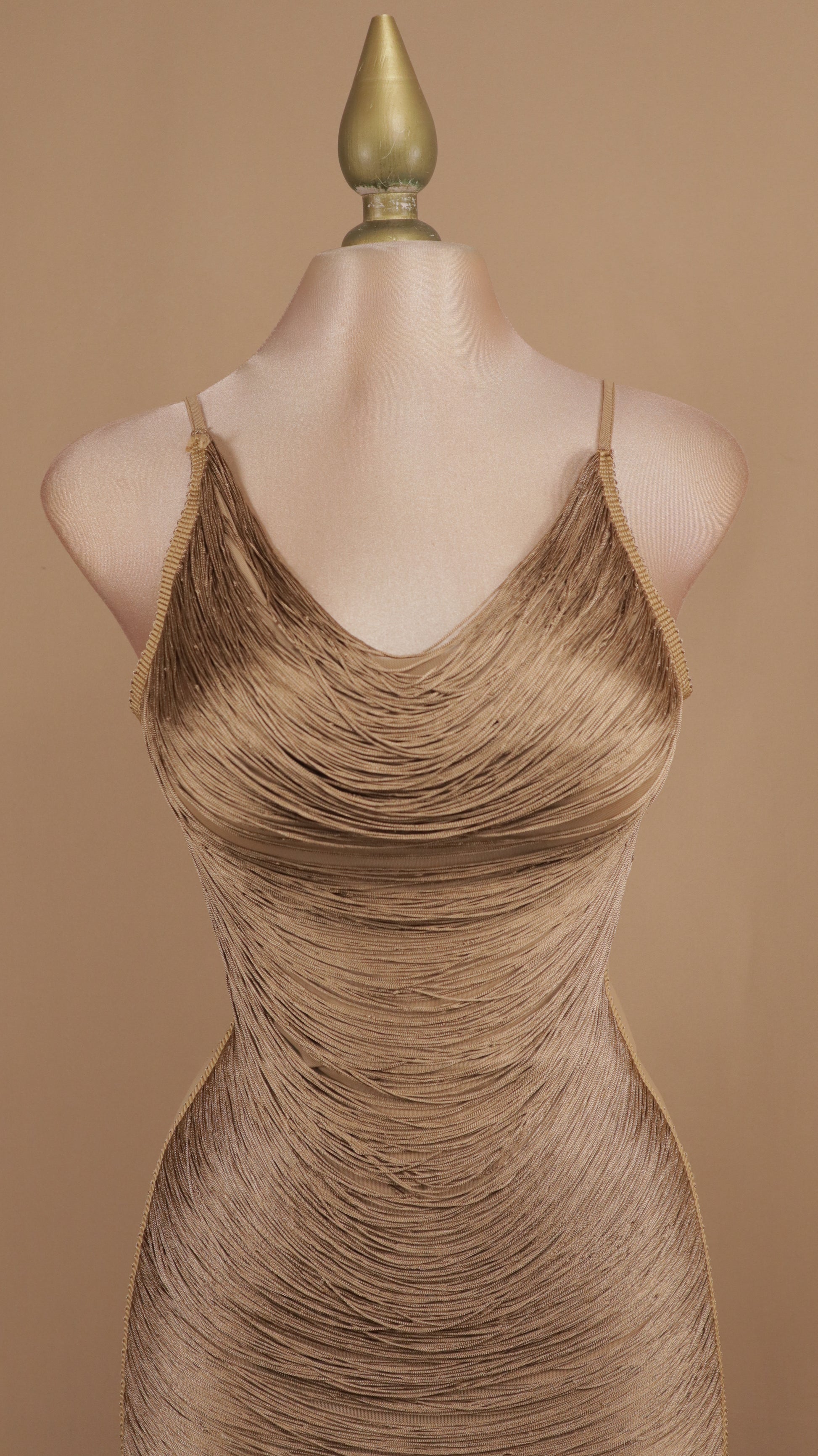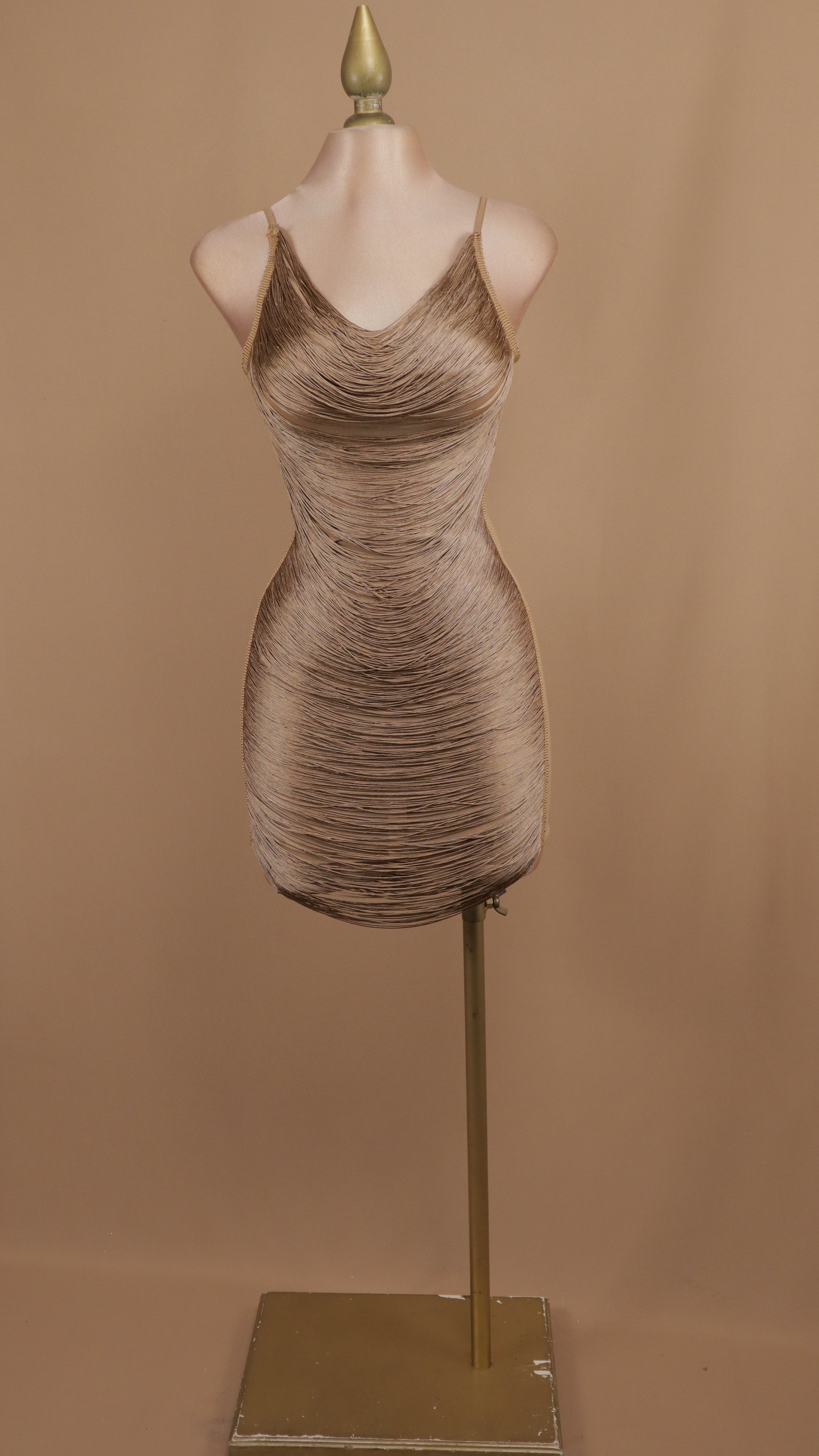 Vestido corto con diseño de flecos en movimiento que crean una onda elegante y dinámica. Cuenta con un escote profundo en la espalda que añade sensualidad y sofisticación al look. Perfecto para fiestas, eventos especiales o noches de celebración donde quieras destacar. El corte corto favorece la silueta mientras que los flecos se mueven con cada paso, creando un efecto visual cautivador. Una pieza versátil que combina estilo y confianza en una sola prenda.
