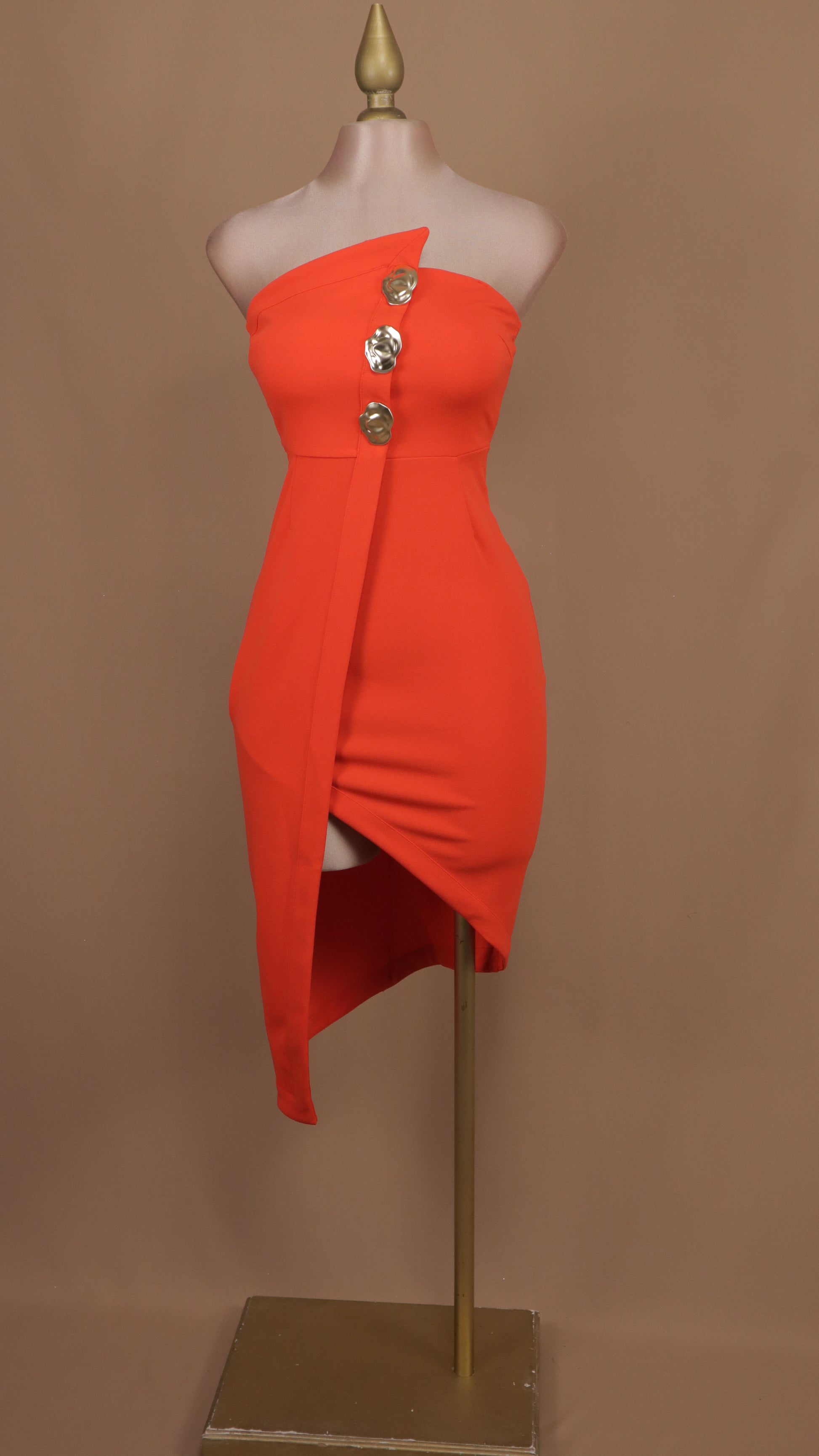 ¡Siéntete elegante y a la moda con nuestro vestido corto straple con botones dorados y abertura en pierna! Este vestido te hará lucir sofisticada y glamurosa en cualquier ocasión. Su diseño único y detalles en dorado te harán destacar de la multitud. ¡No te lo pierdas!