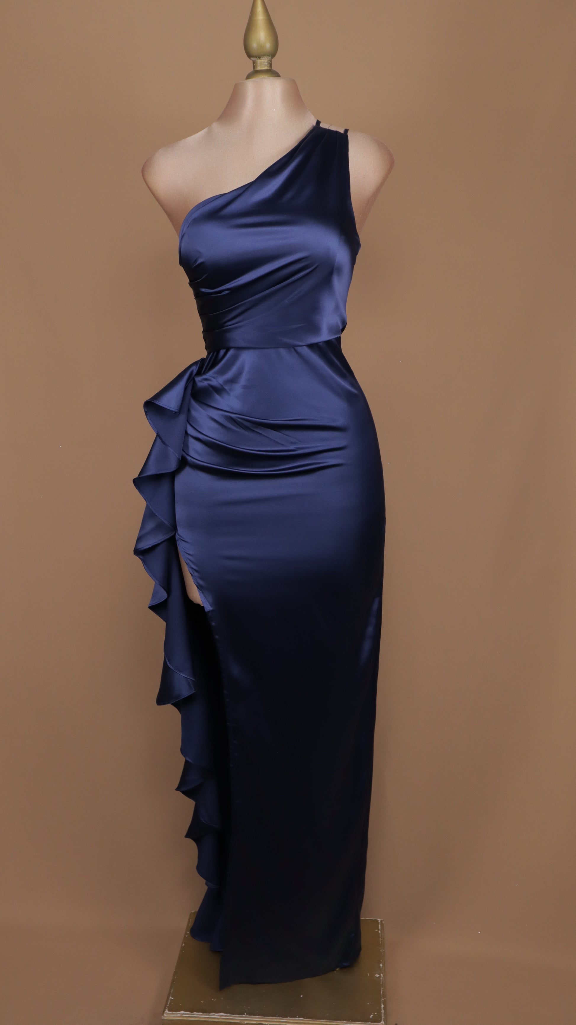 Vestido largo asimétrico con escarola en costado
