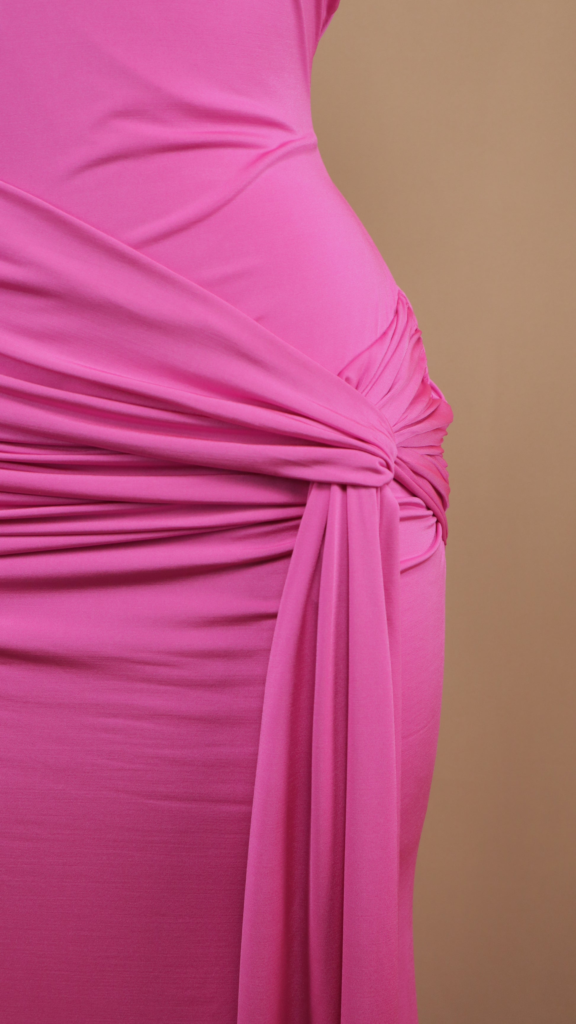Luce elegante y sofisticada con este vestido largo que combina diseño y feminidad. El escote al hombro resalta tu figura de manera sensual, mientras que el plizado estratégico en la cadera crea una silueta favorecedora y dinámica. Detalles de lujo como el broche dorado añaden un toque de distinción que eleva cualquier ocasión. Perfecto para eventos especiales, cenas o momentos donde deseas brillar con estilo. Un básico versátil que se adapta a tu personalidad y garantiza comodidad sin sacrificar la elegancia.