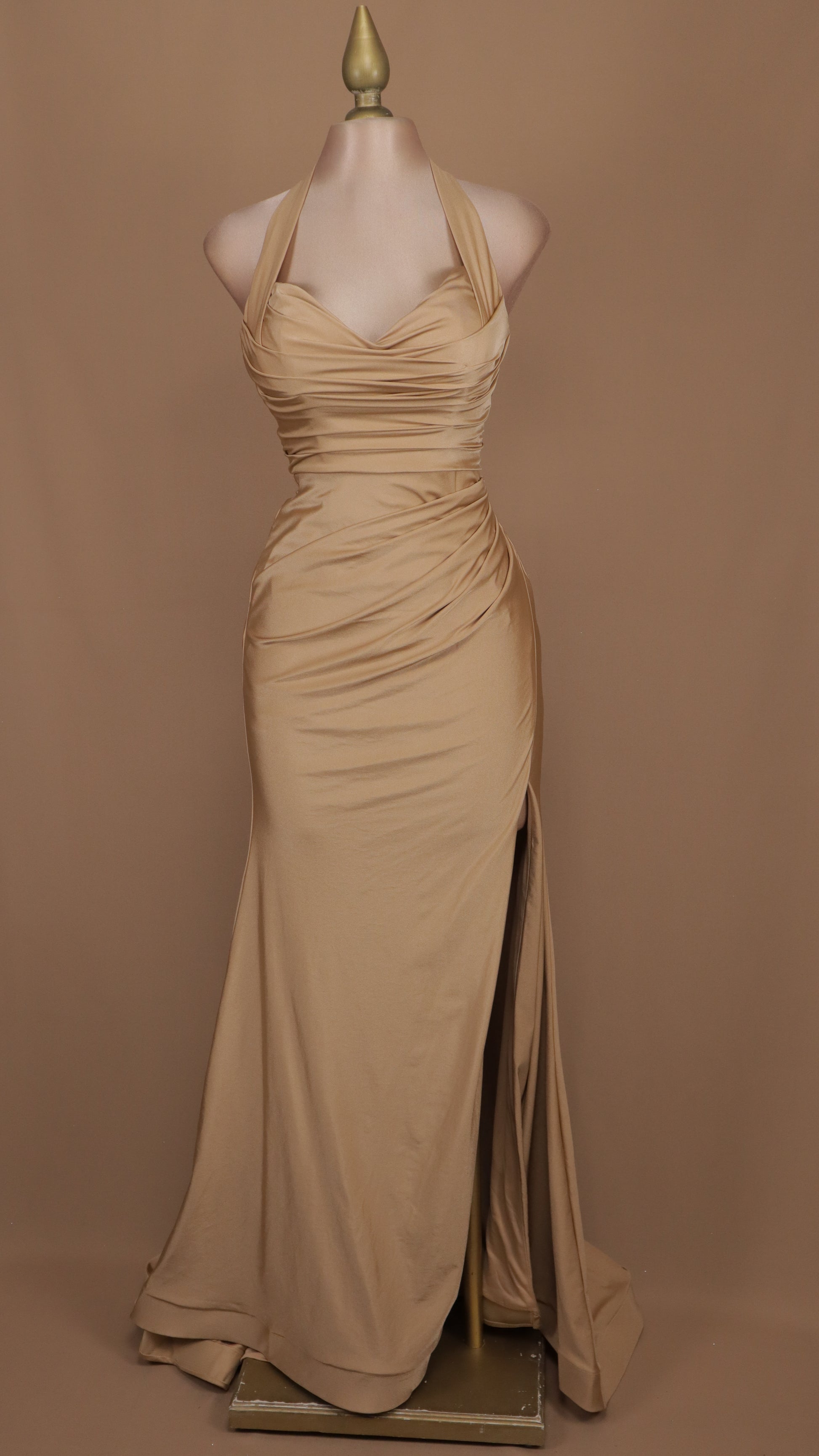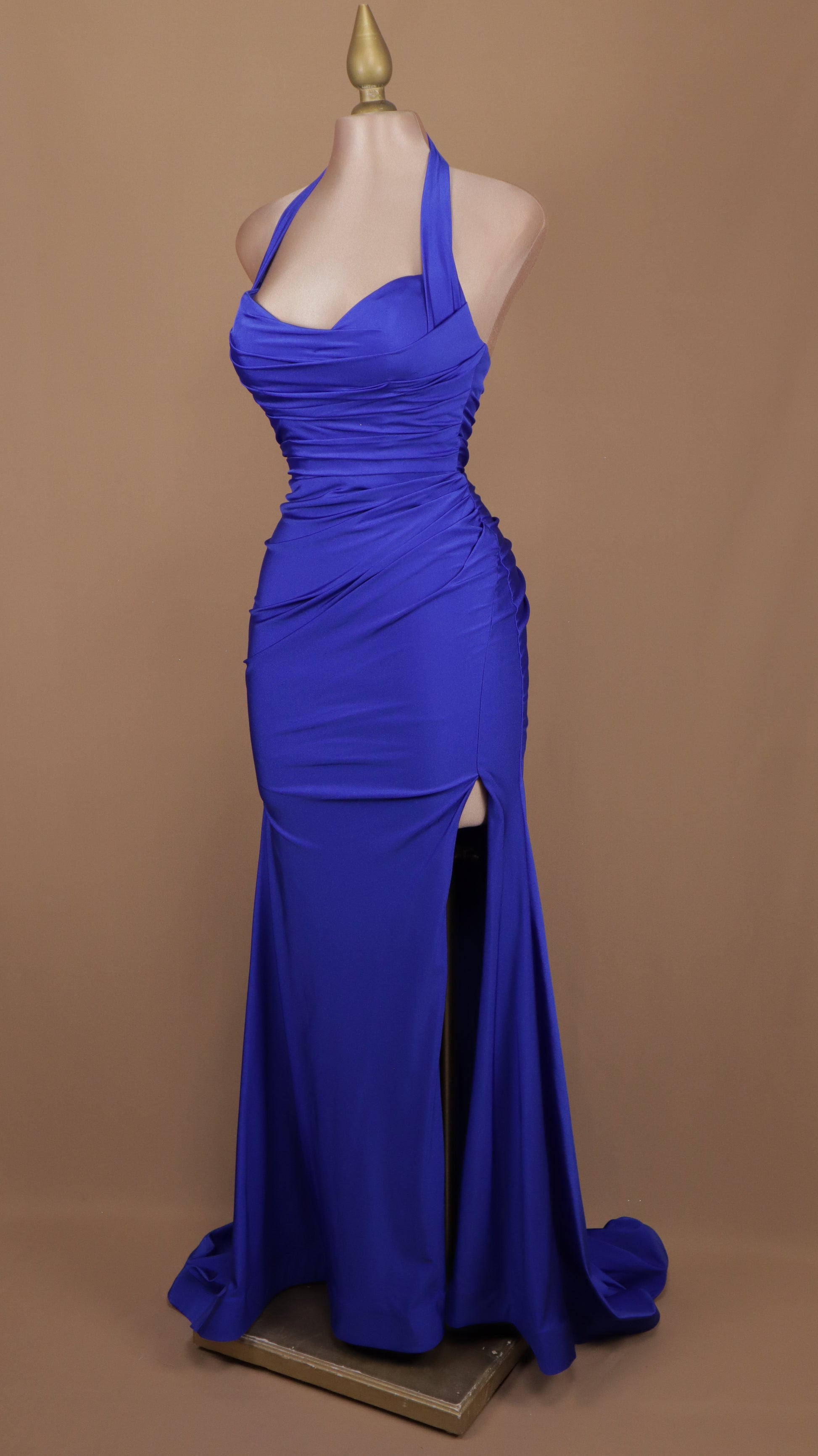 Este vestido largo de licra cuenta con un elegante escote en la espalda y un cuello halter. Su abertura en la pierna ofrece comodidad y versatilidad en cualquier ocasión. Con un diseño clásico pero moderno, este vestido es perfecto para lucir sofisticada y a la moda.