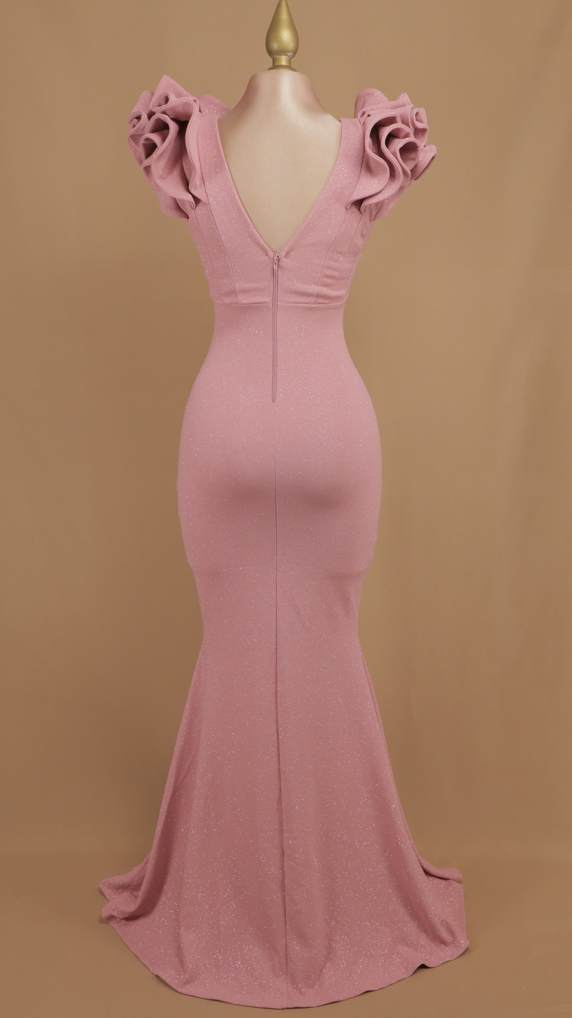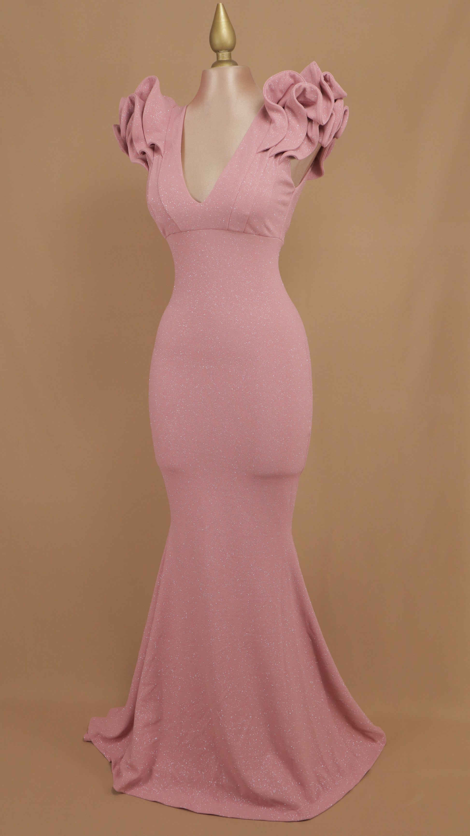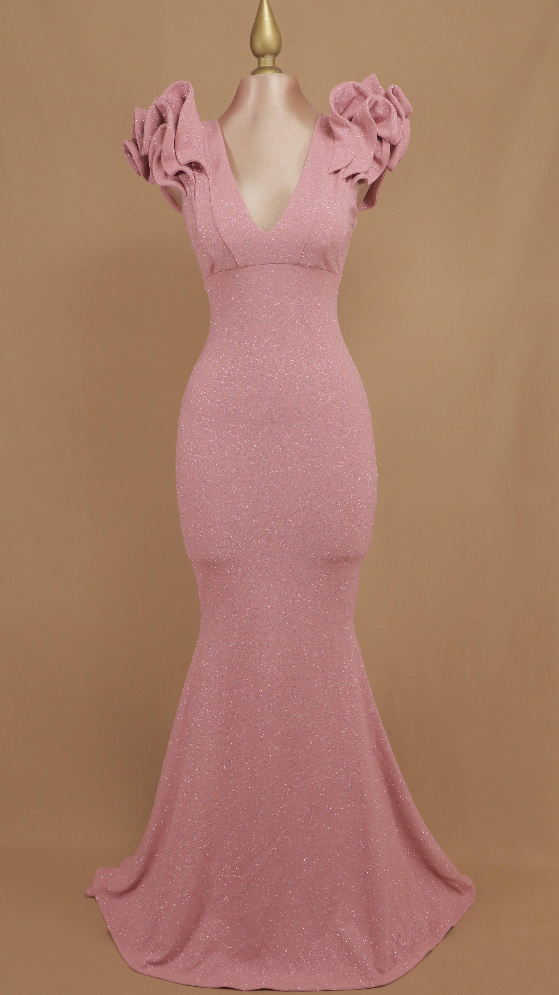 Este vestido largo es una pieza impresionante con un elegante diseño de escarola en los hombros y destellos brillantes. Hecho con materiales de alta calidad, es perfecto para cualquier ocasión especial. Añade un toque de glamour a tu guardarropa con este vestido único.