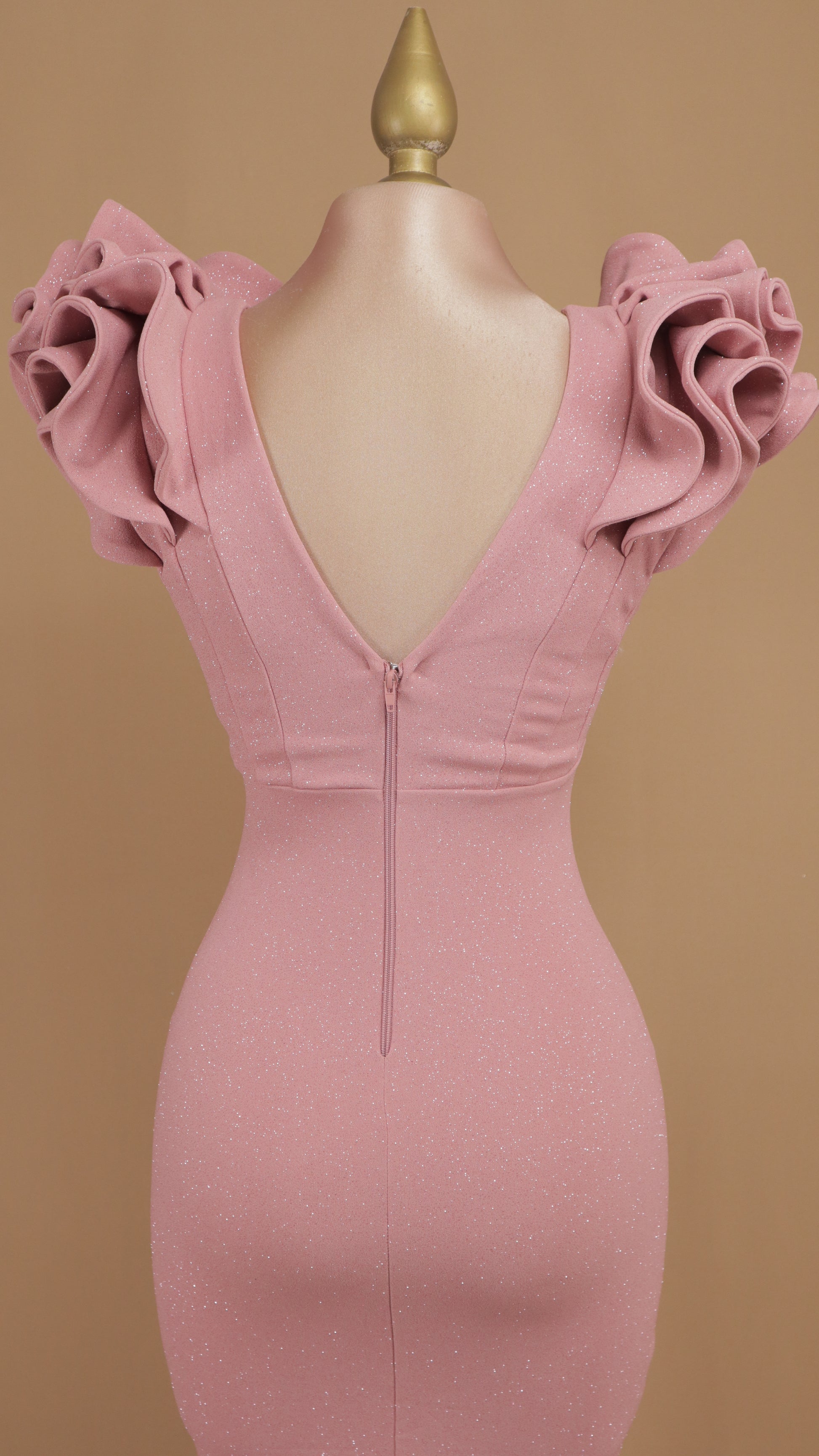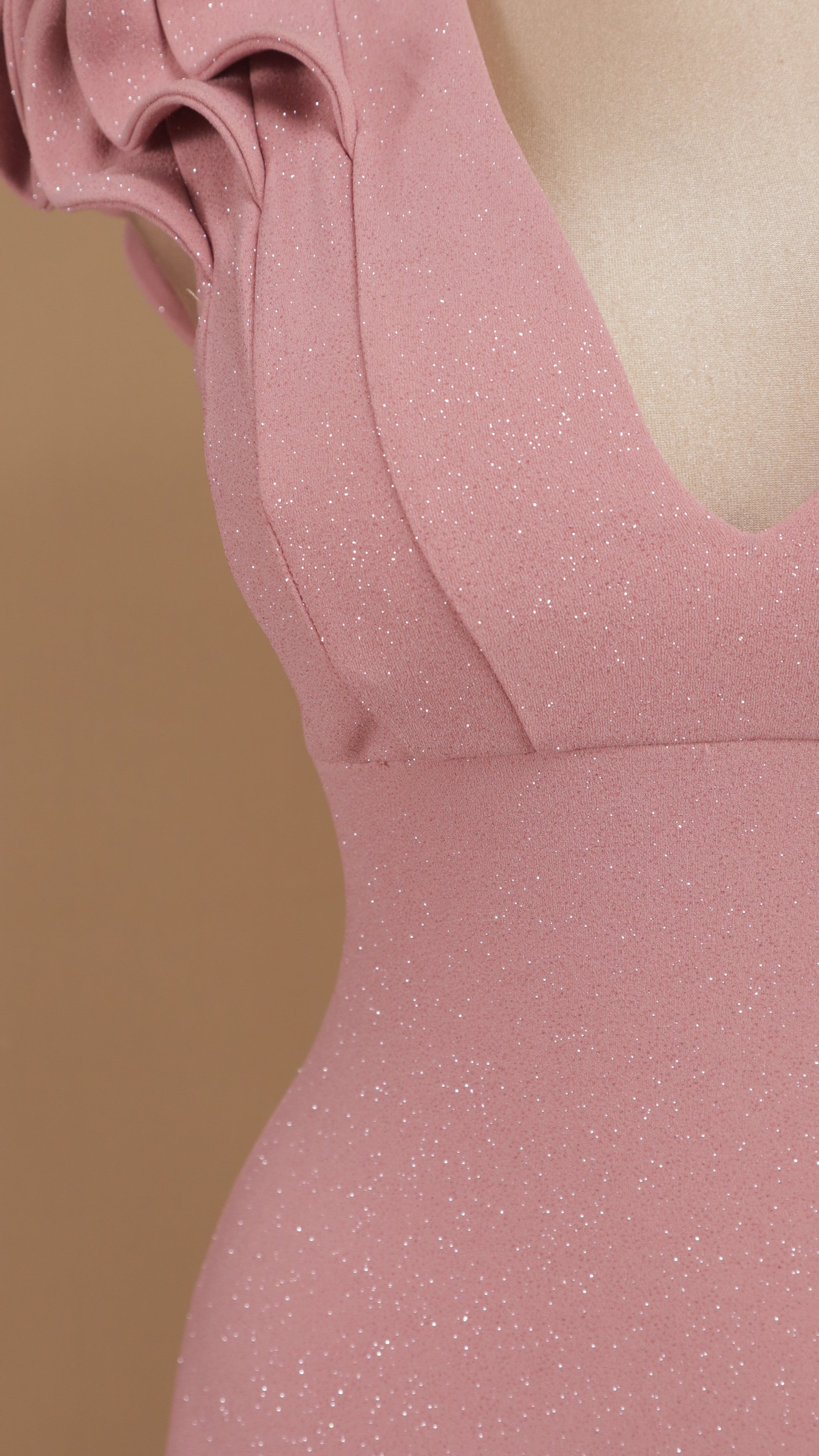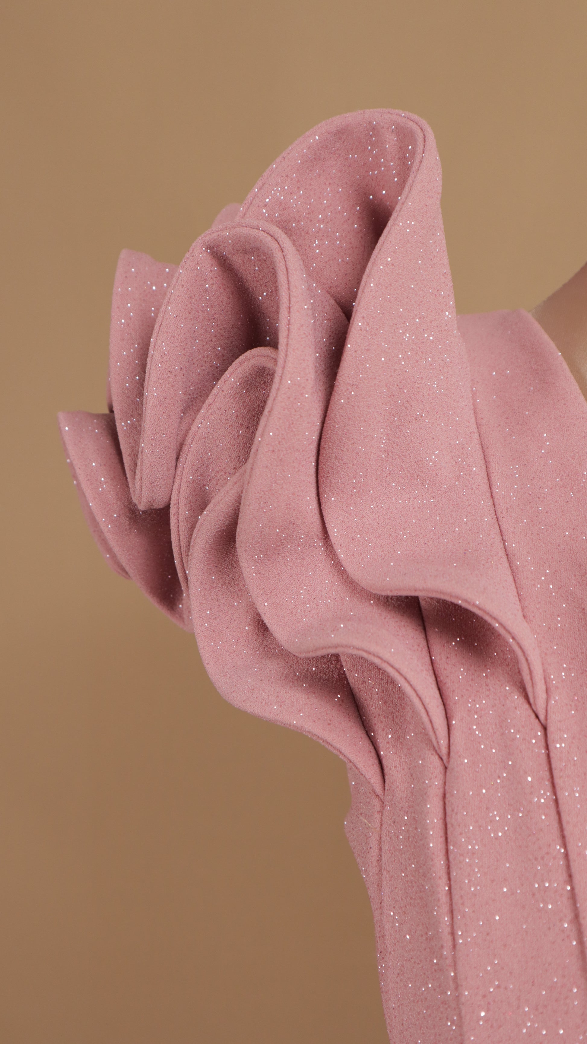 Este vestido largo es una pieza impresionante con un elegante diseño de escarola en los hombros y destellos brillantes. Hecho con materiales de alta calidad, es perfecto para cualquier ocasión especial. Añade un toque de glamour a tu guardarropa con este vestido único.