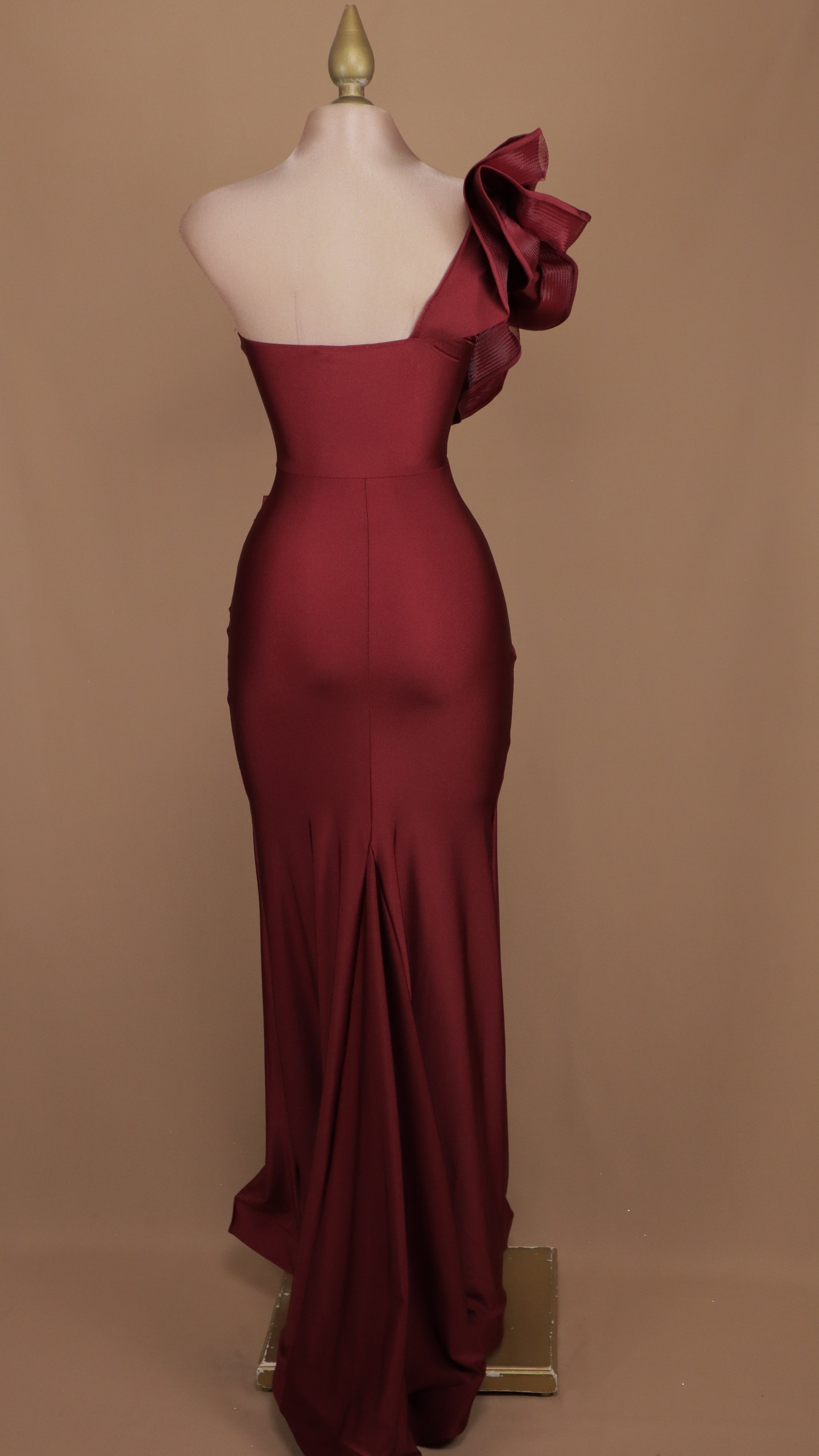 ¡Atrévete con este vestido largo de escarola en hombro, asimétrico y de licra!