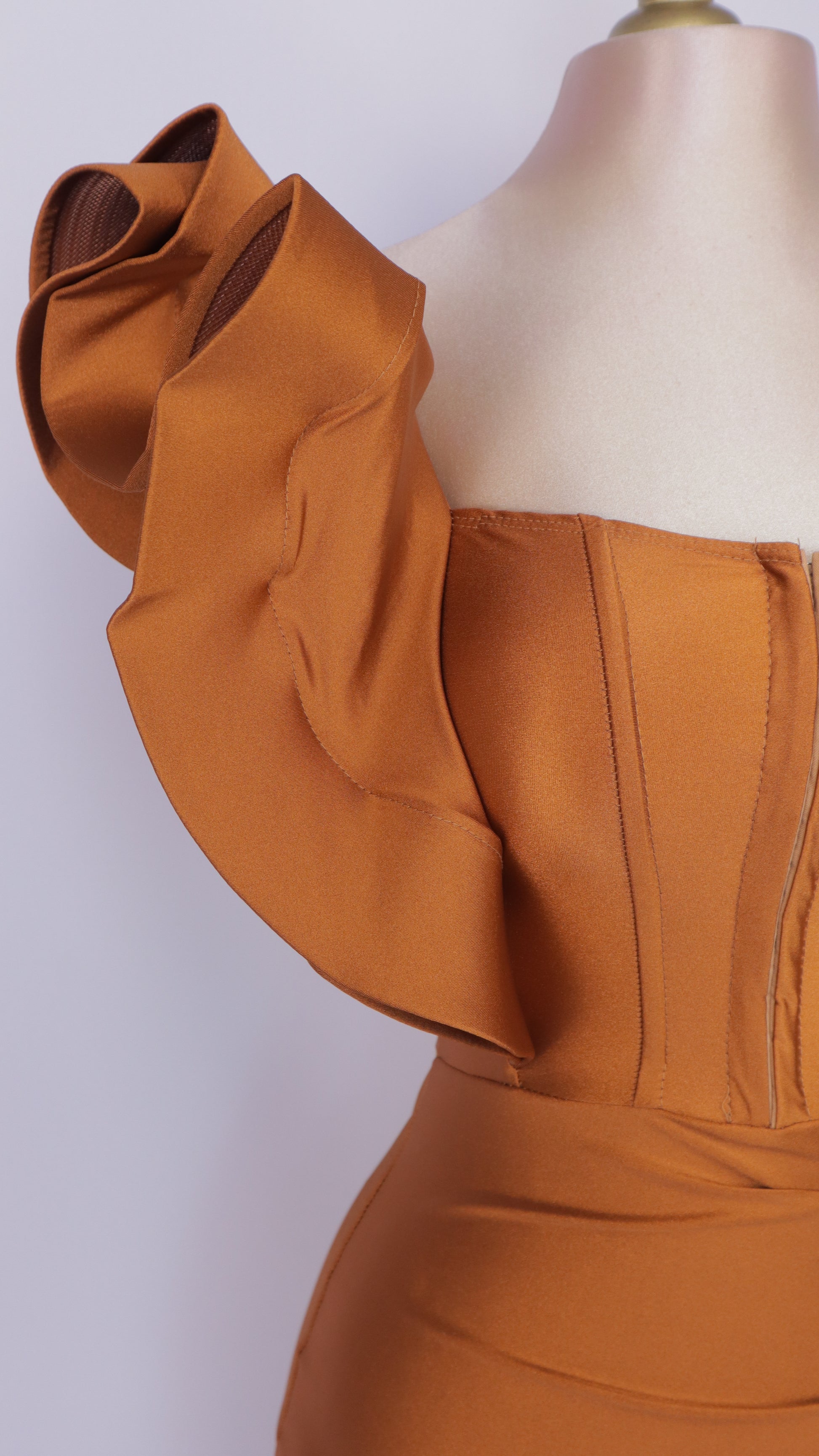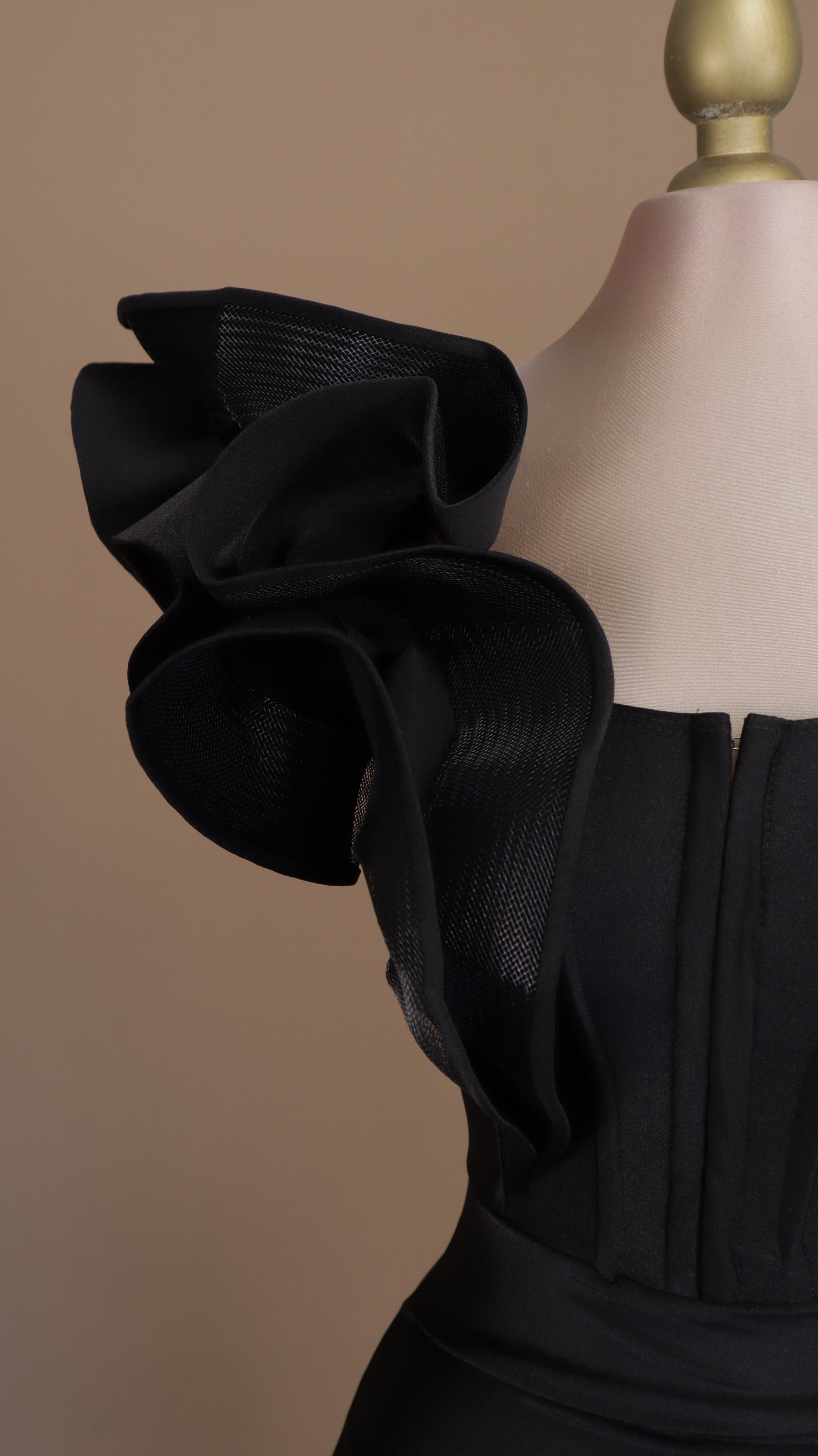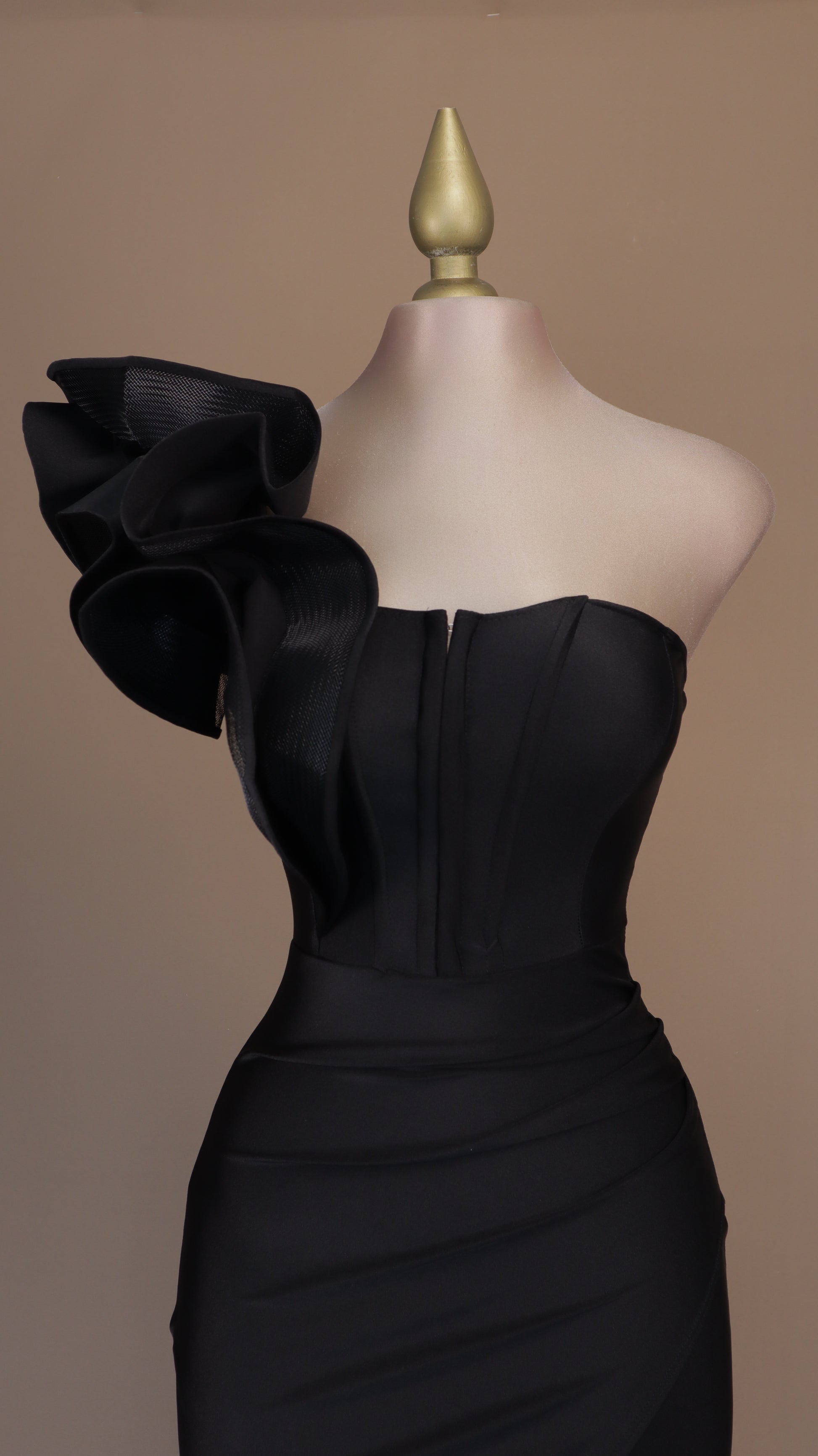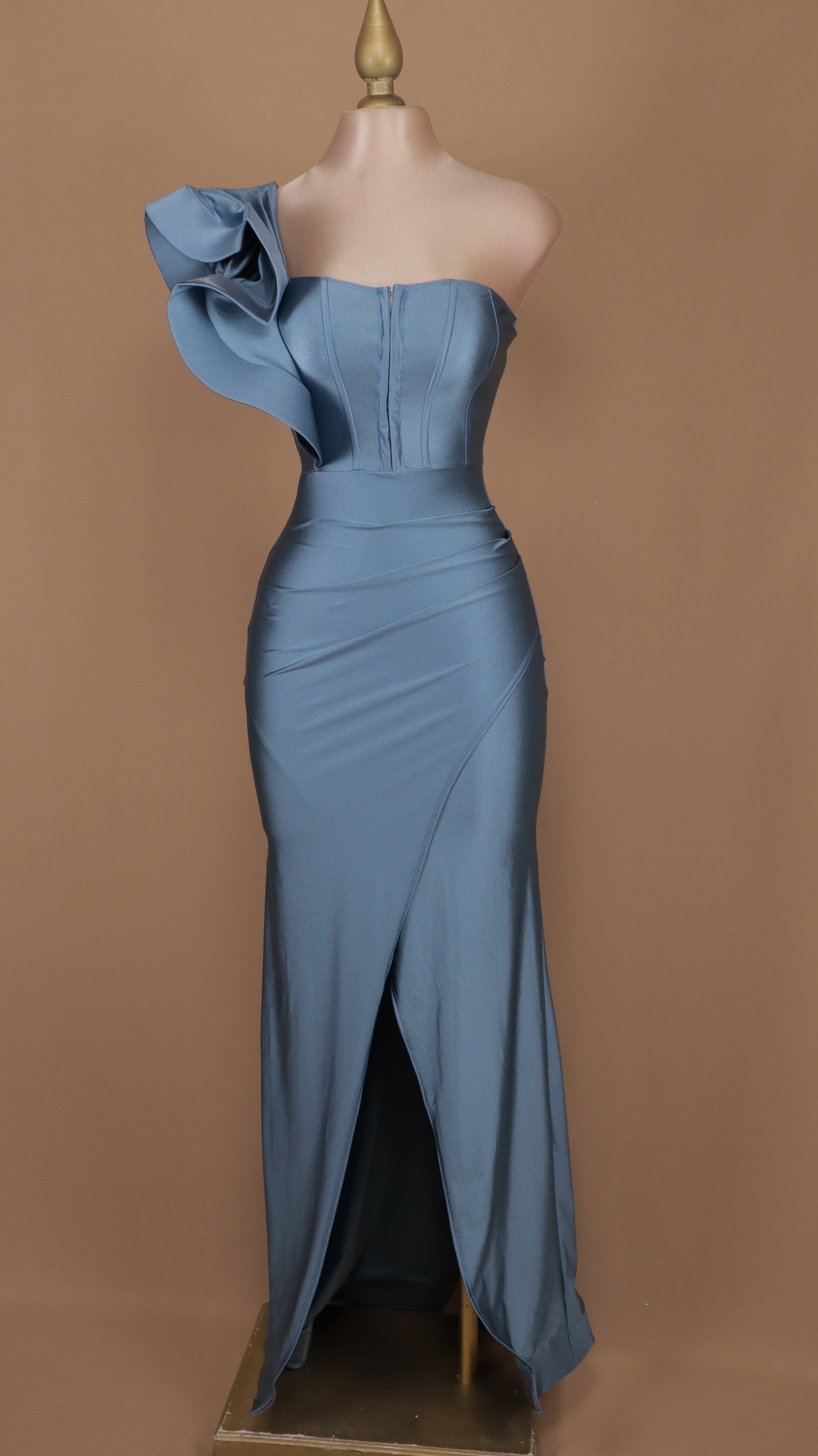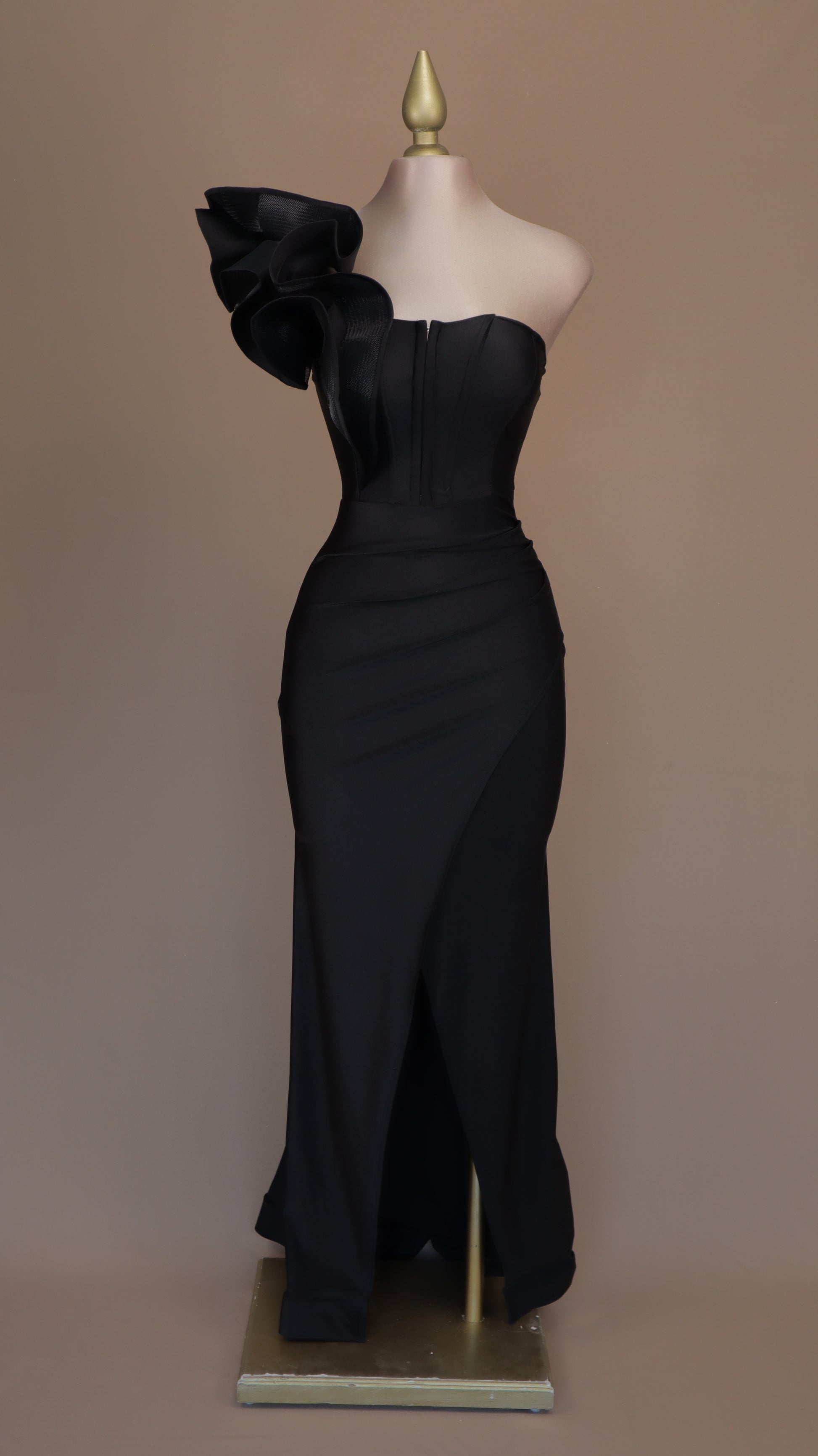 ¡Atrévete con este vestido largo de escarola en hombro, asimétrico y de licra!