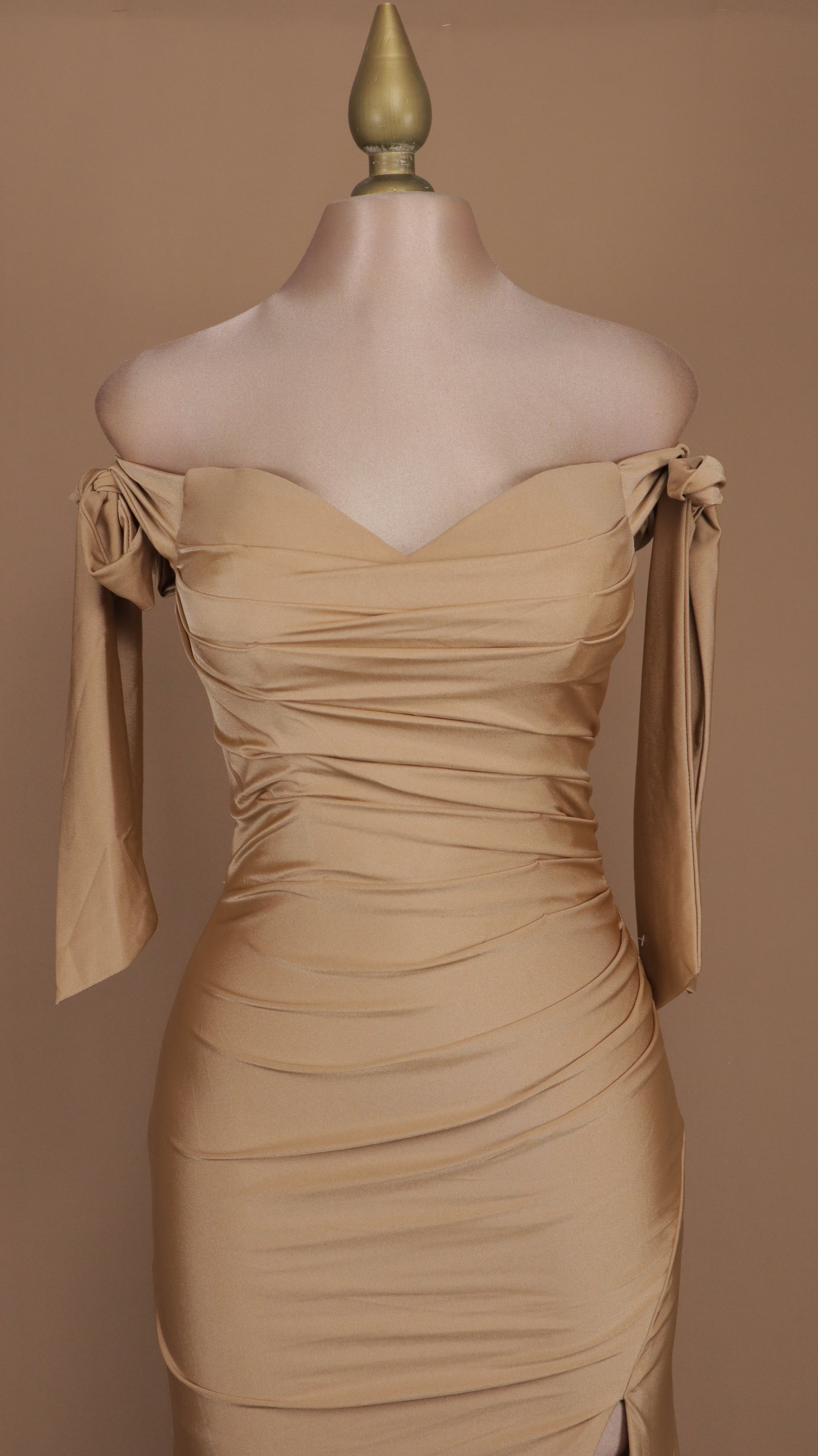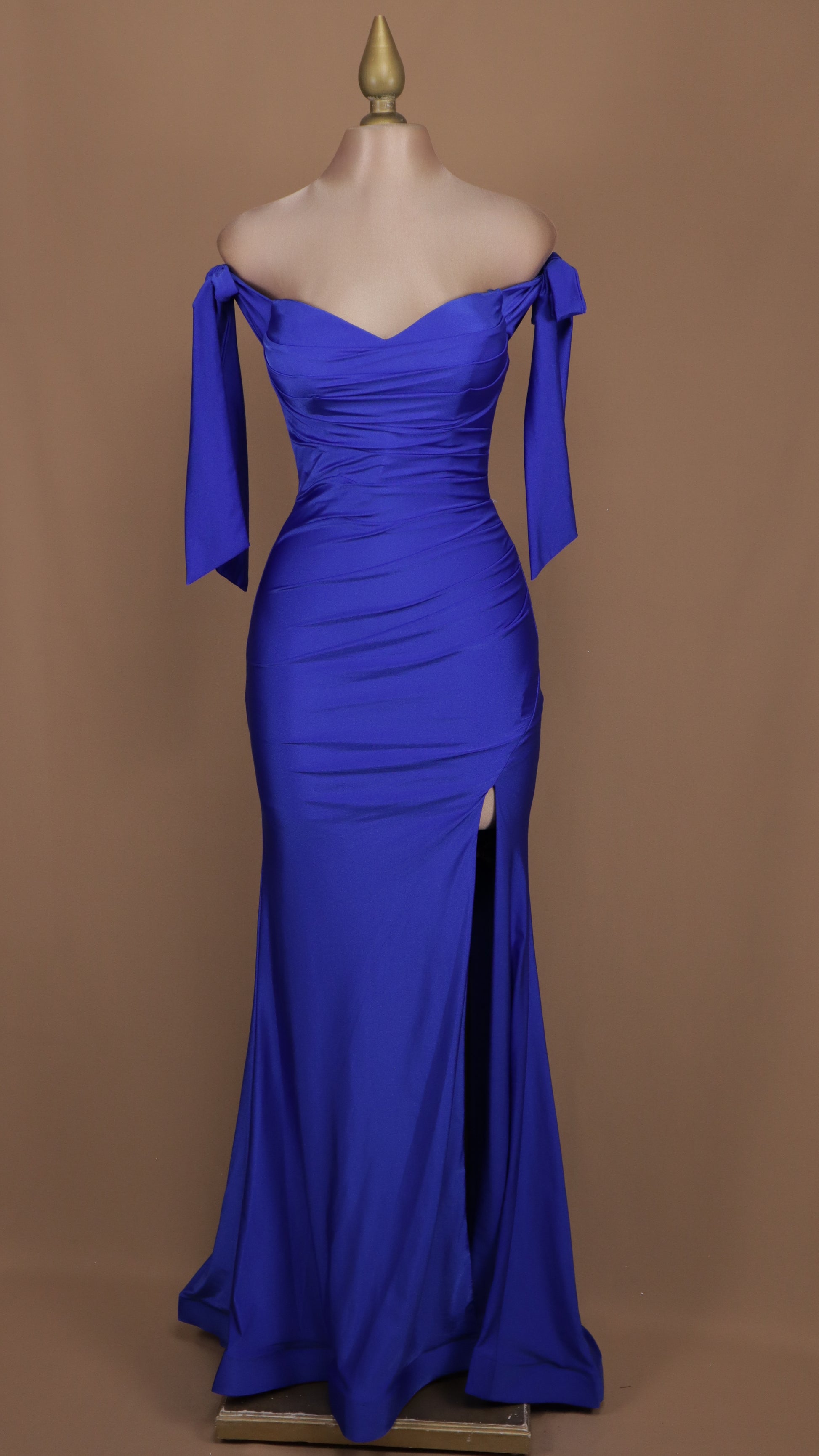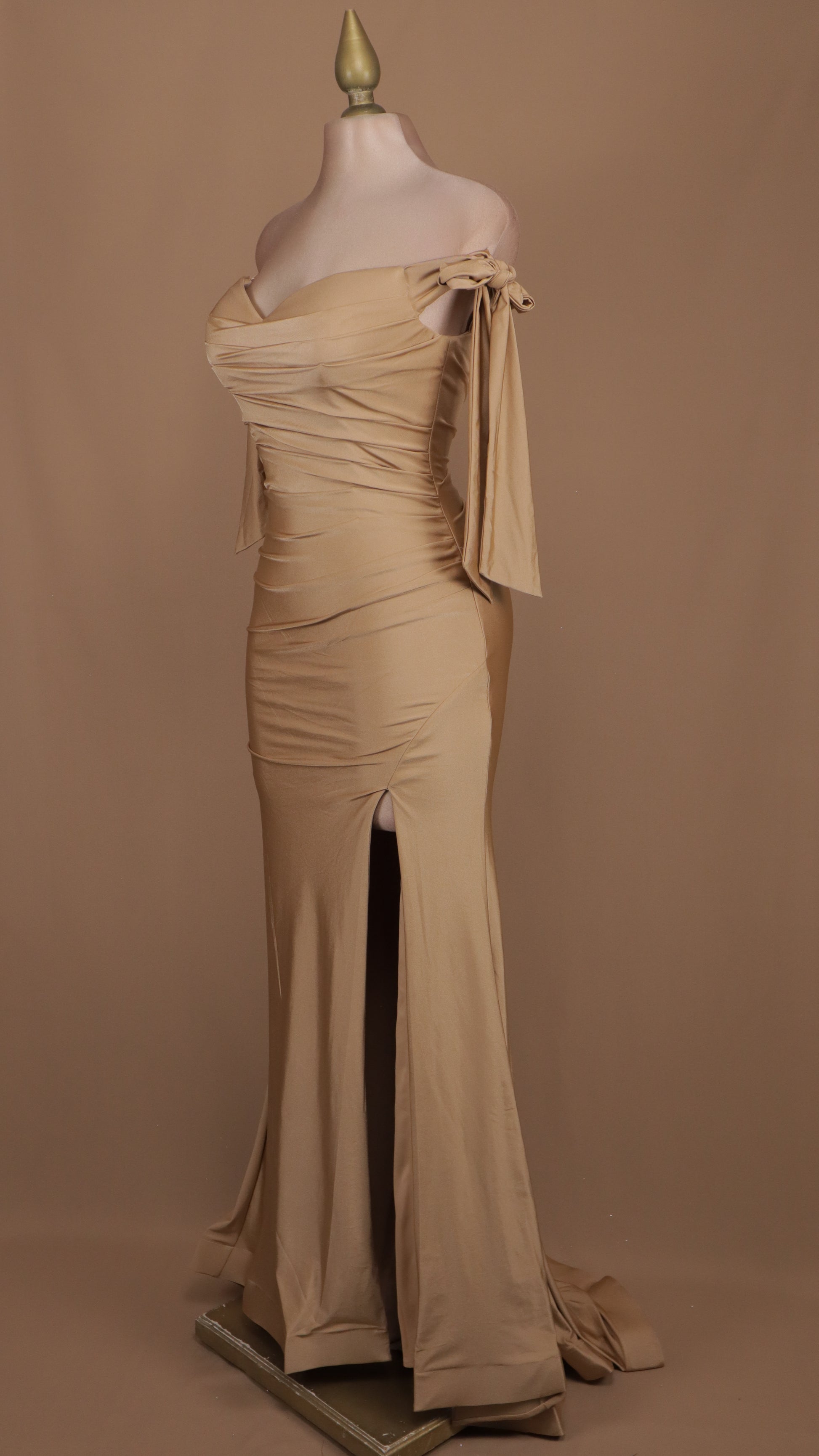 Vestido largo con escote al hombro y abertura en pierna