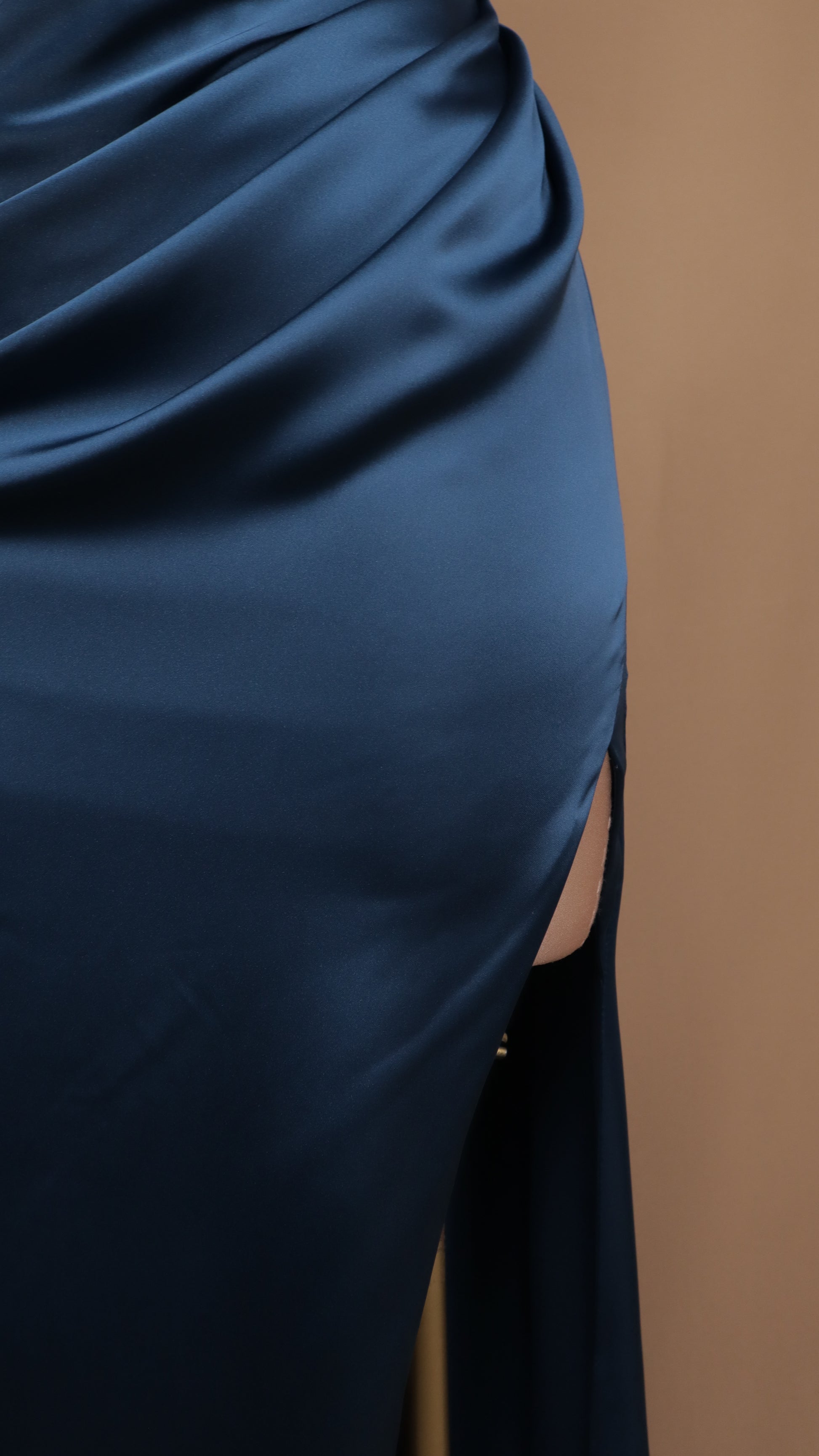 Este vestido largo destaca por su elegante escote asimétrico que aporta un toque moderno y sofisticado. La cauda que se extiende en la espalda añade dramatismo y movimiento, ideal para ocasiones especiales donde quieres lograr una presencia inolvidable. Su diseño único resalta la figura y ofrece una silueta estilizada, perfecto para sentirte segura y deslumbrante en cada paso.