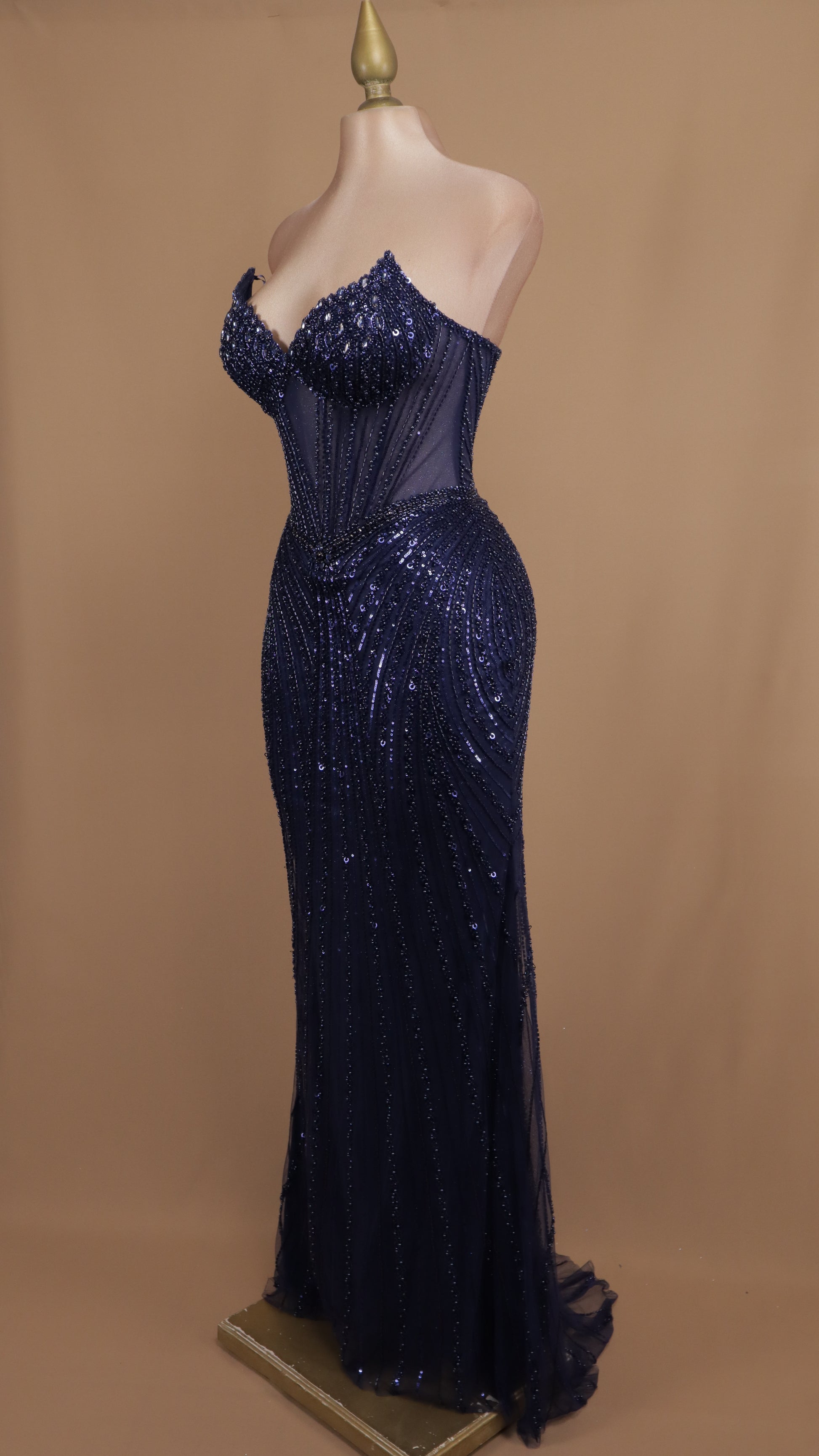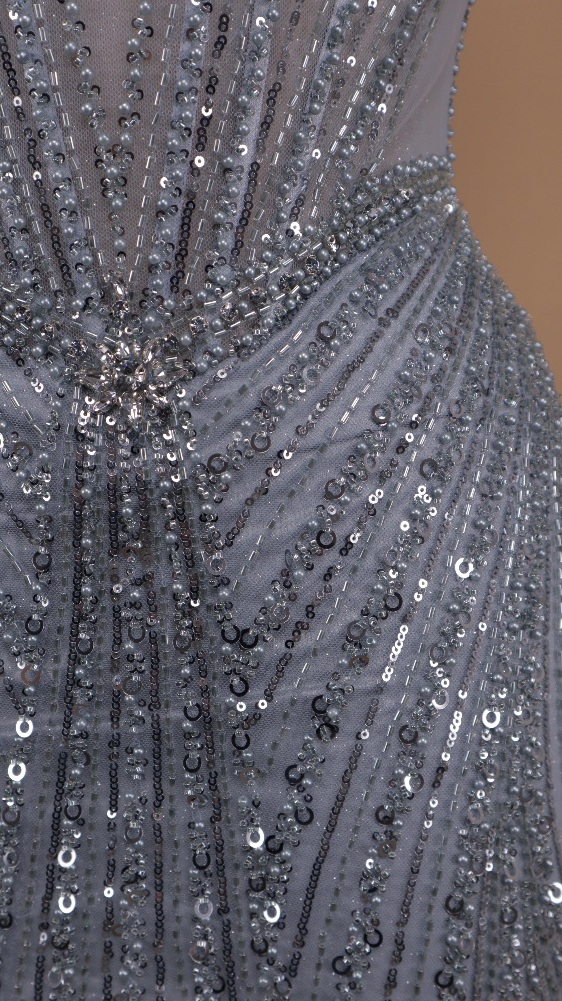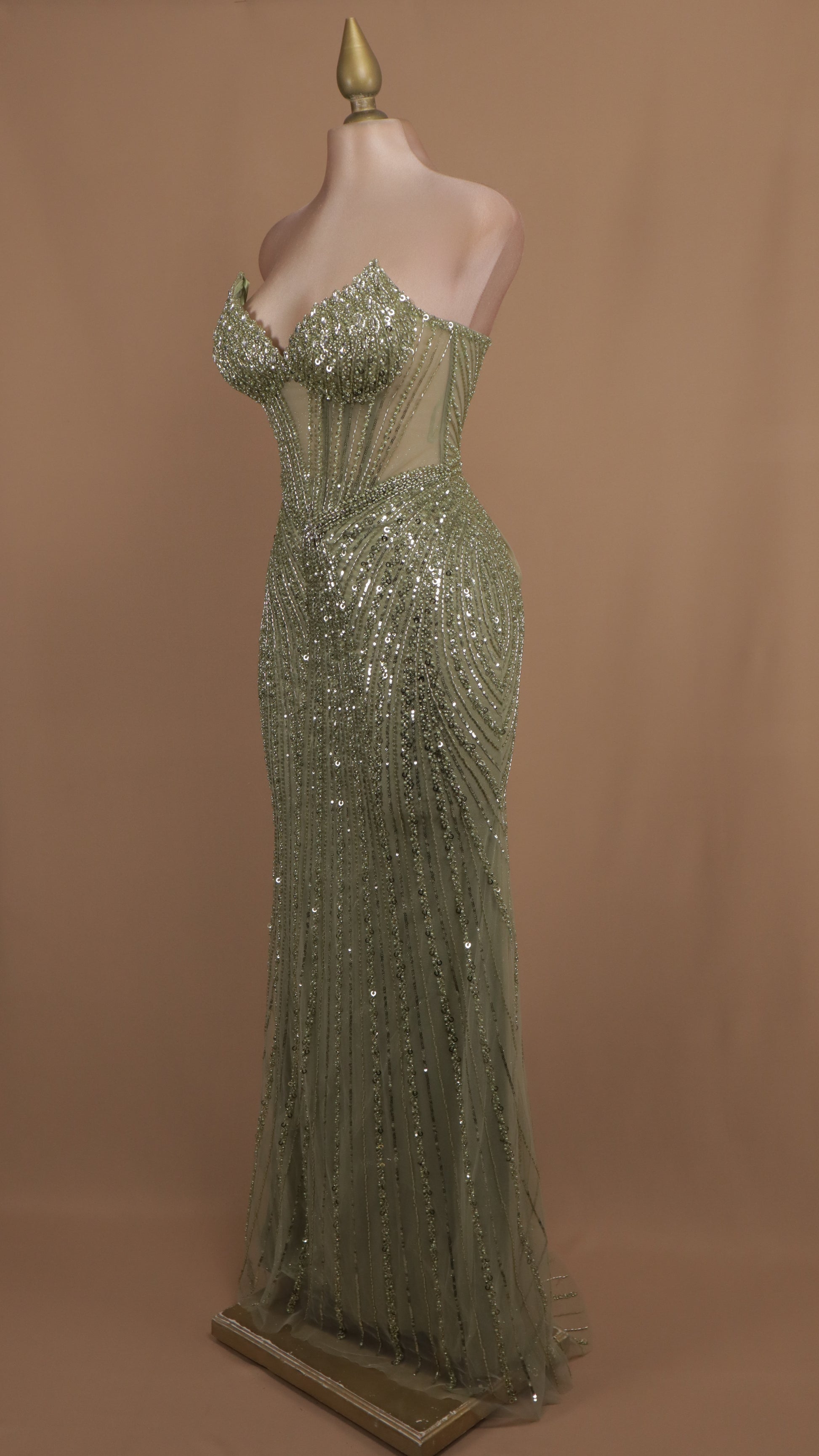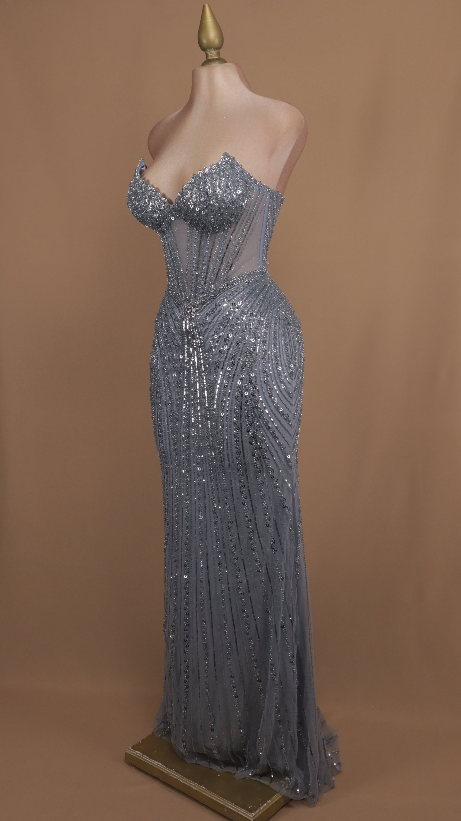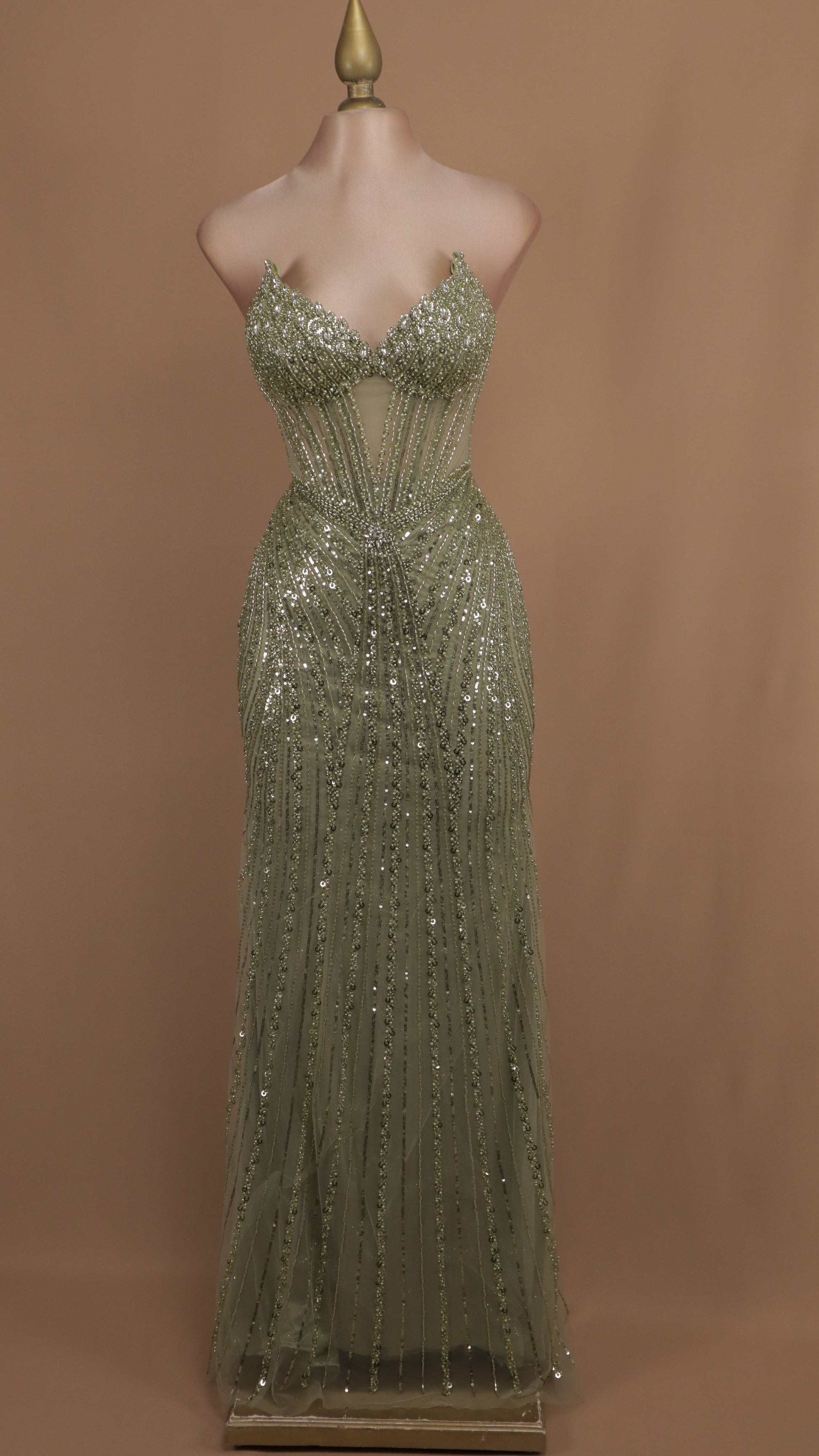 Este vestido largo con pedrería y corset realza tu figura con elegancia y sofisticación. La delicada pedrería aporta un brillo sutil que captura todas las miradas, mientras que el corset ofrece un ajuste perfecto que define la silueta. Perfecto para ocasiones especiales donde deseas destacar con estilo y glamour.