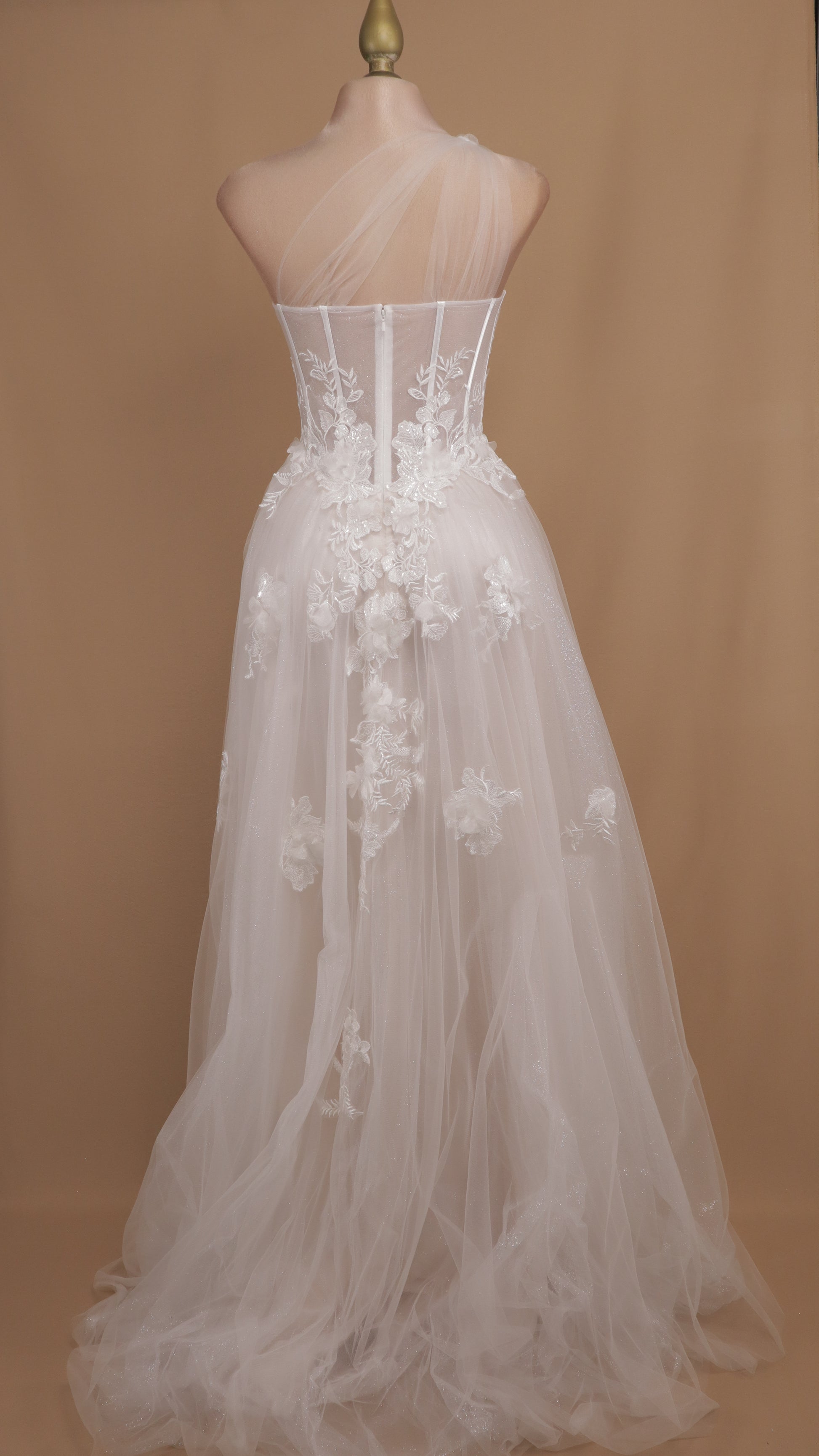 Vestido largo de novia escote asimétrico y aplicación en 3D