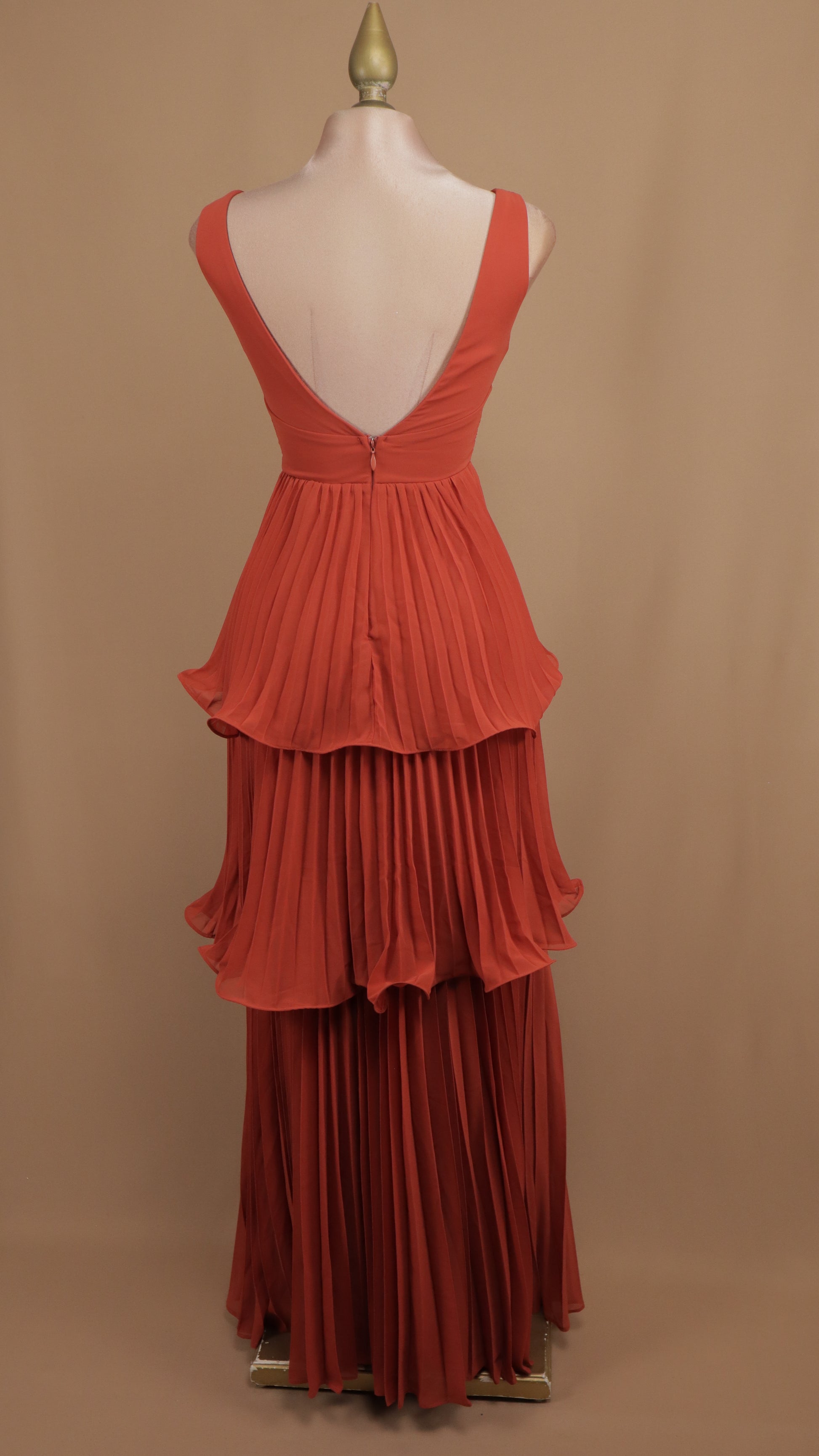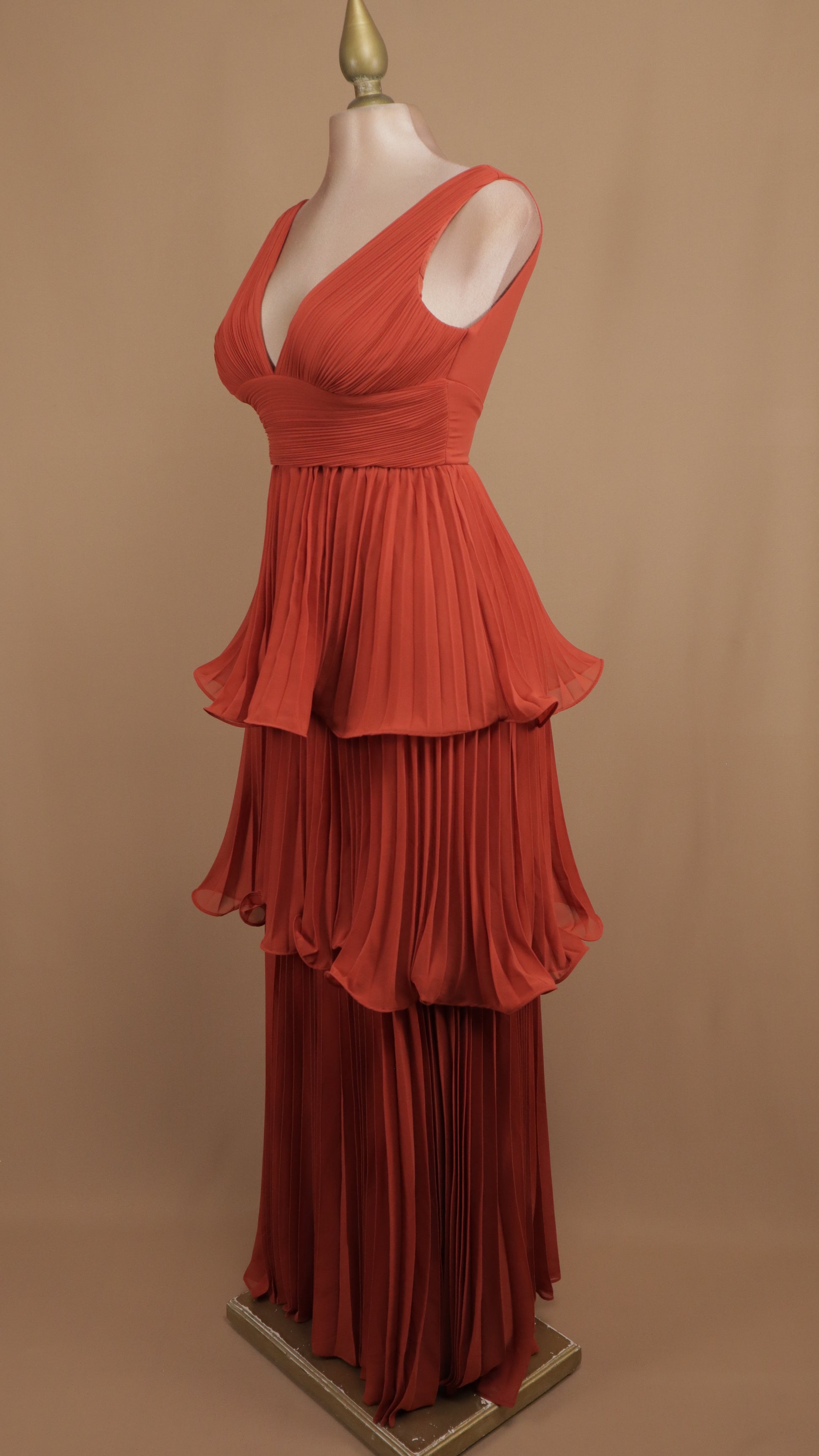 Descubre la elegancia en movimiento con este vestido largo que combina volumen y sofisticación. Los olanes estratégicamente colocados crean un efecto dinámico y femenino, mientras que el plisado estructurado define tu silueta con gracia. Perfecto para ocasiones especiales, cócteles o eventos donde desees destacar con estilo. La caída fluida del tejido te permite moverte con libertad y confianza. Un diseño versátil que transforma cualquier momento en una oportunidad para brillar con elegancia atemporal.
