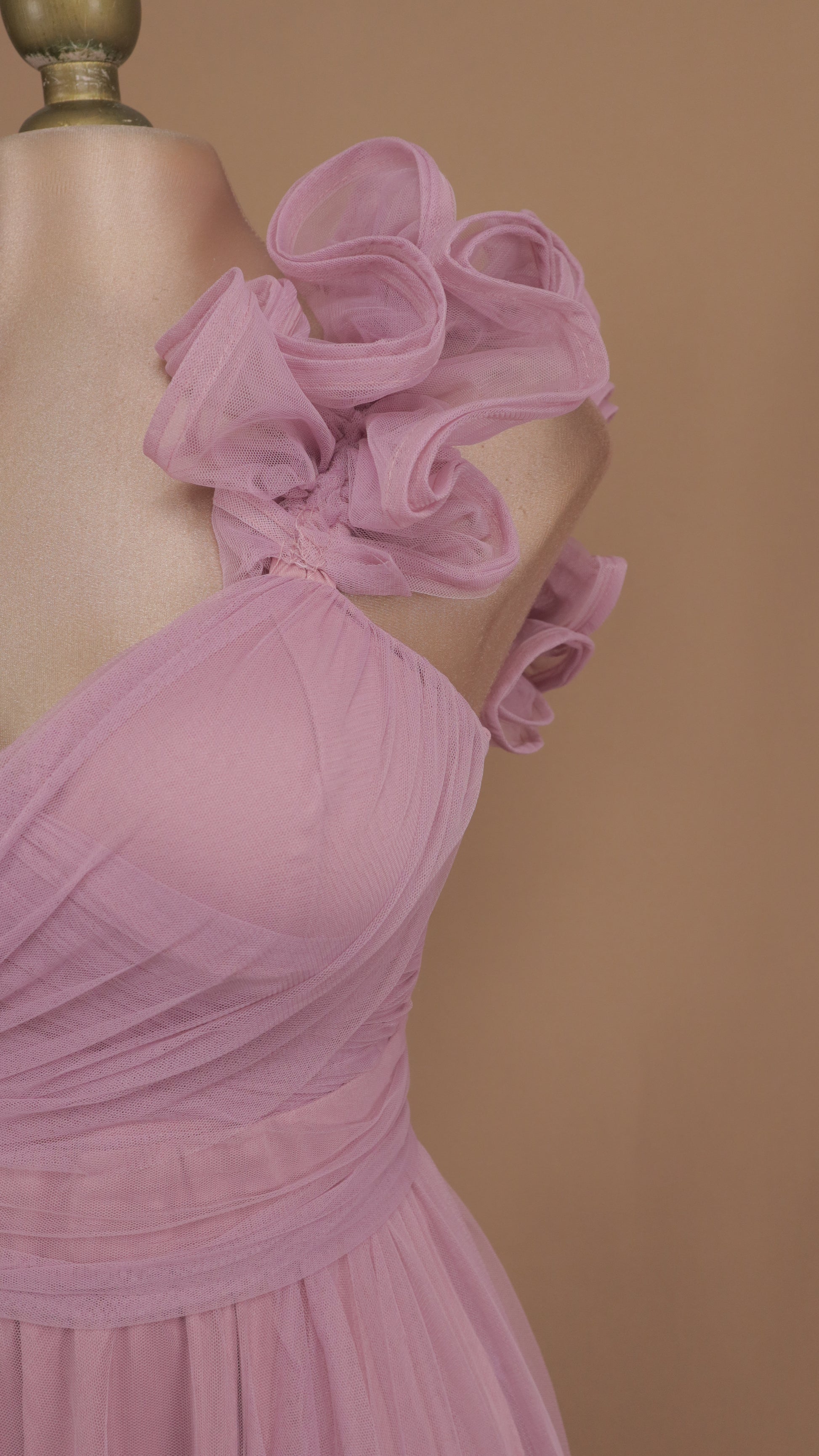 Este vestido largo de tul es una elegante y versátil opción para cualquier ocasión. Con un hombro y agujetas en la espalda, este vestido ofrece un toque moderno y femenino. El tul añade un toque de sofisticación a cualquier look. Perfecto para cualquier mujer segura de sí misma.