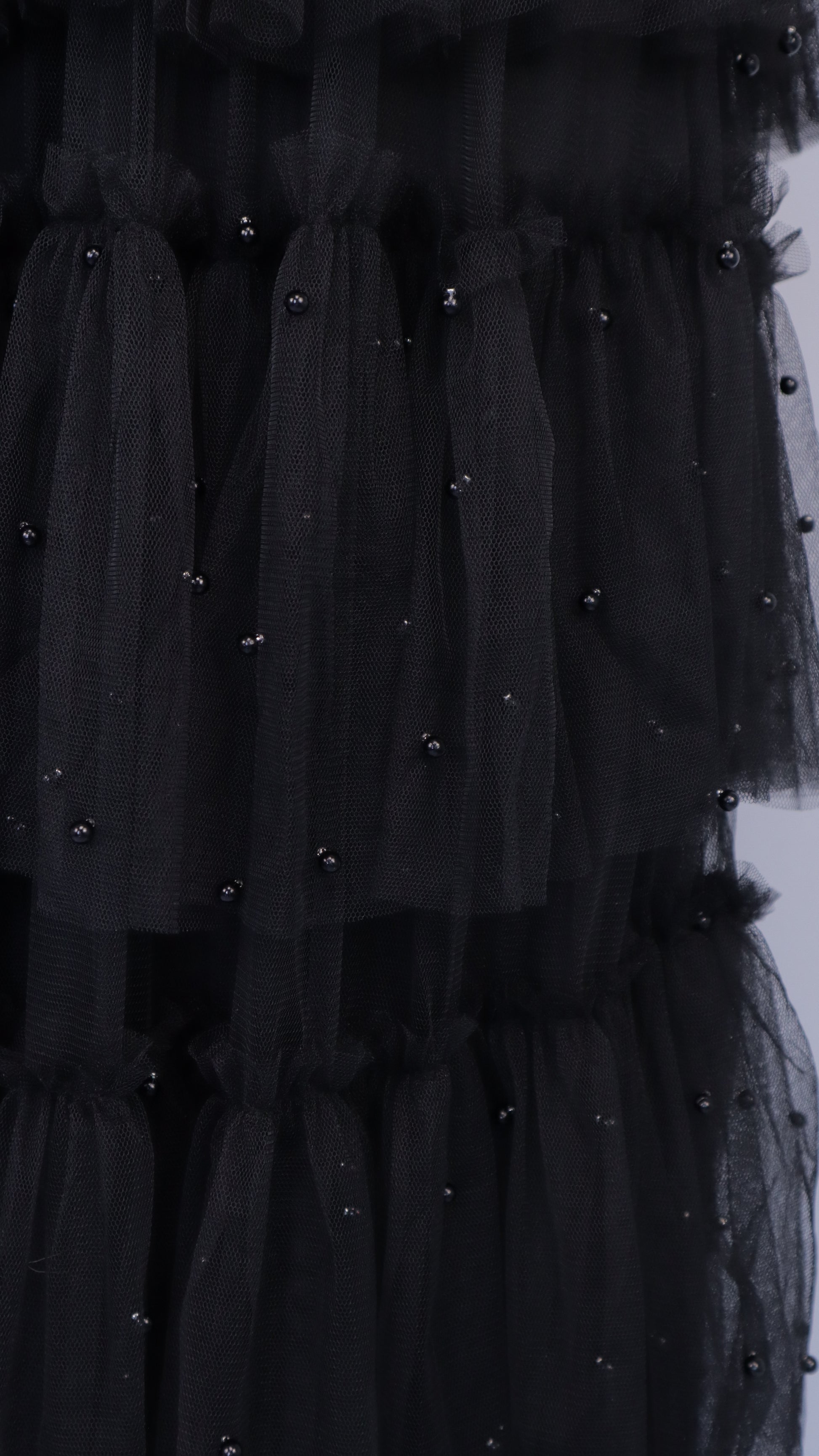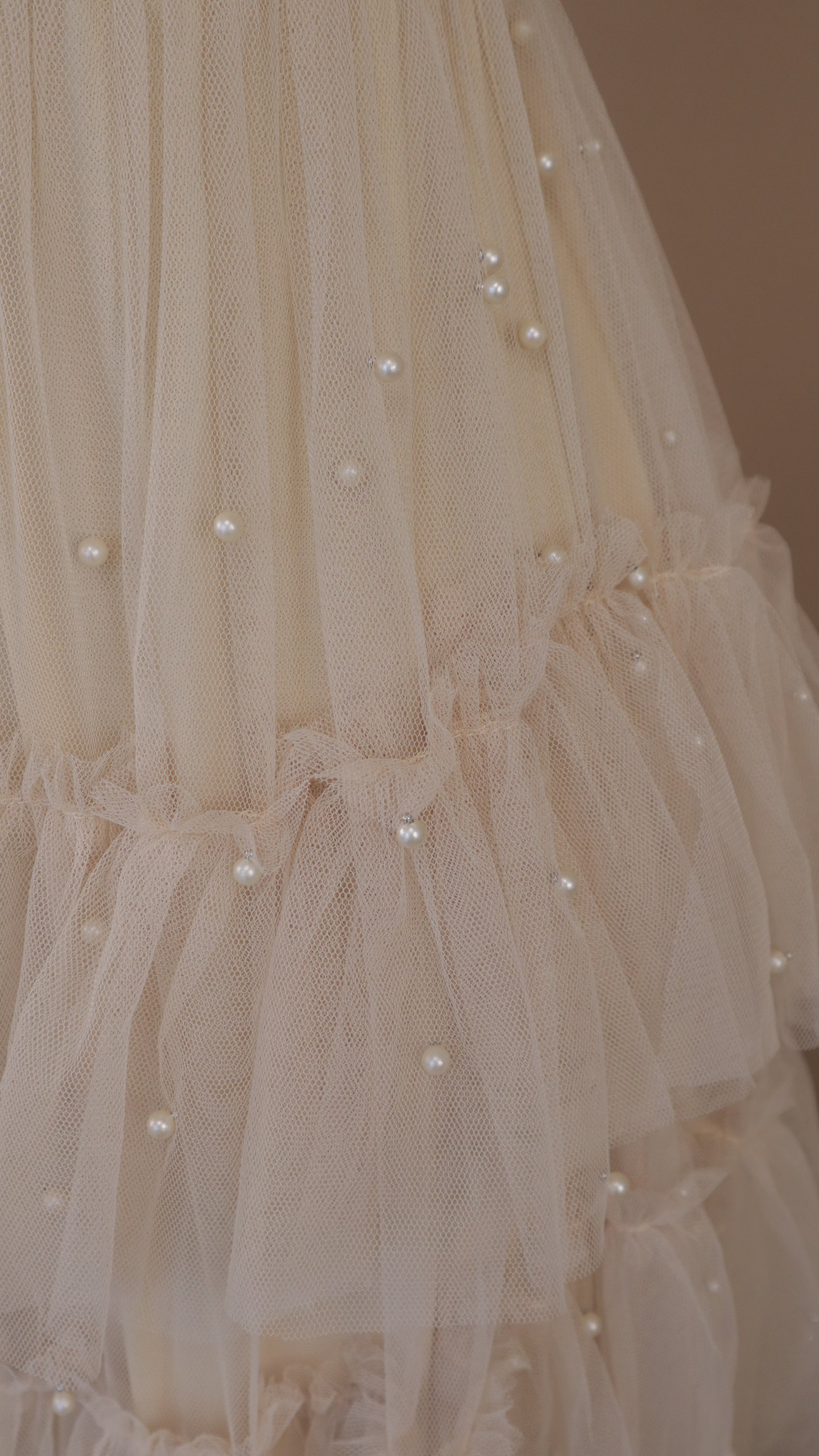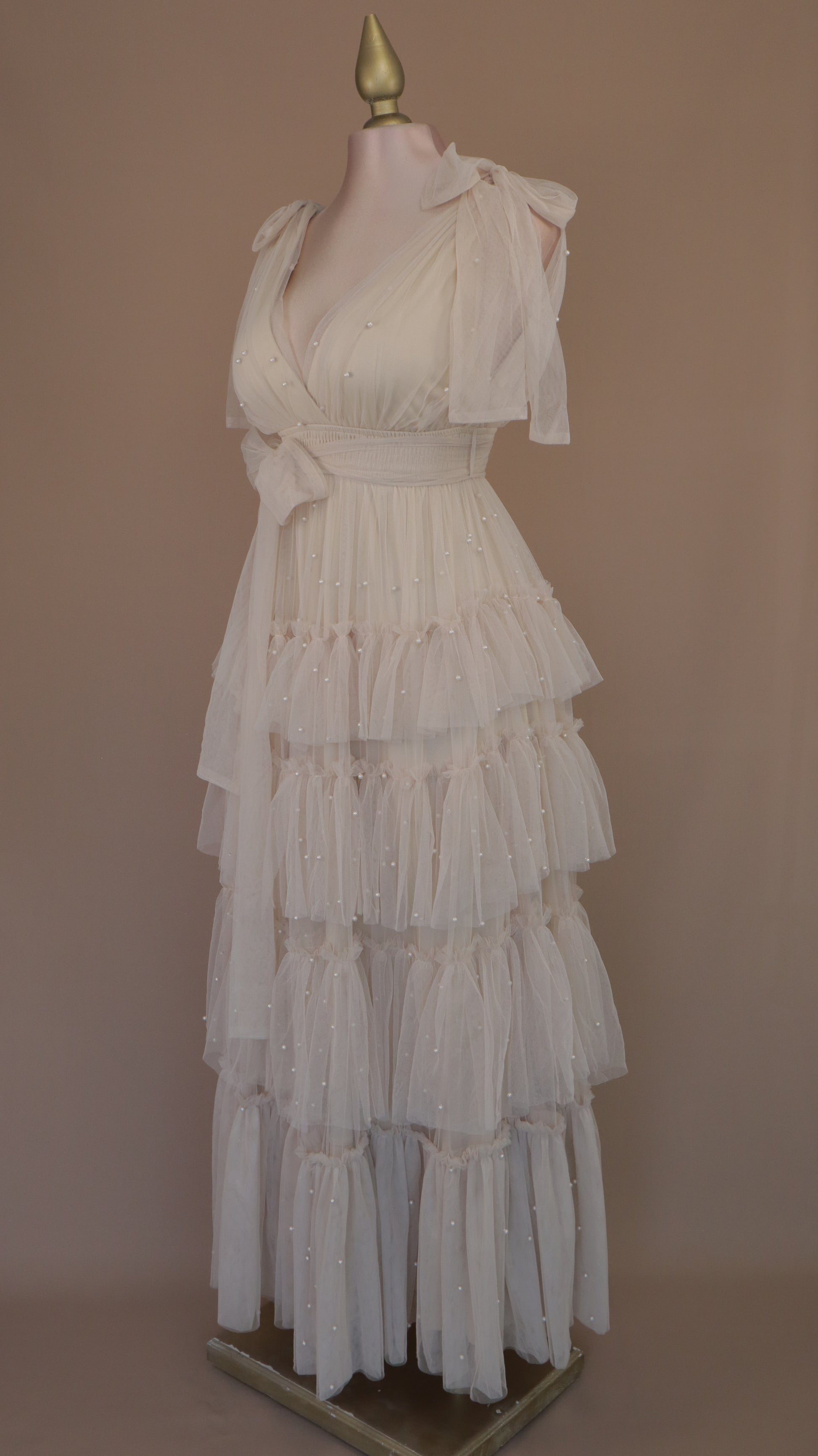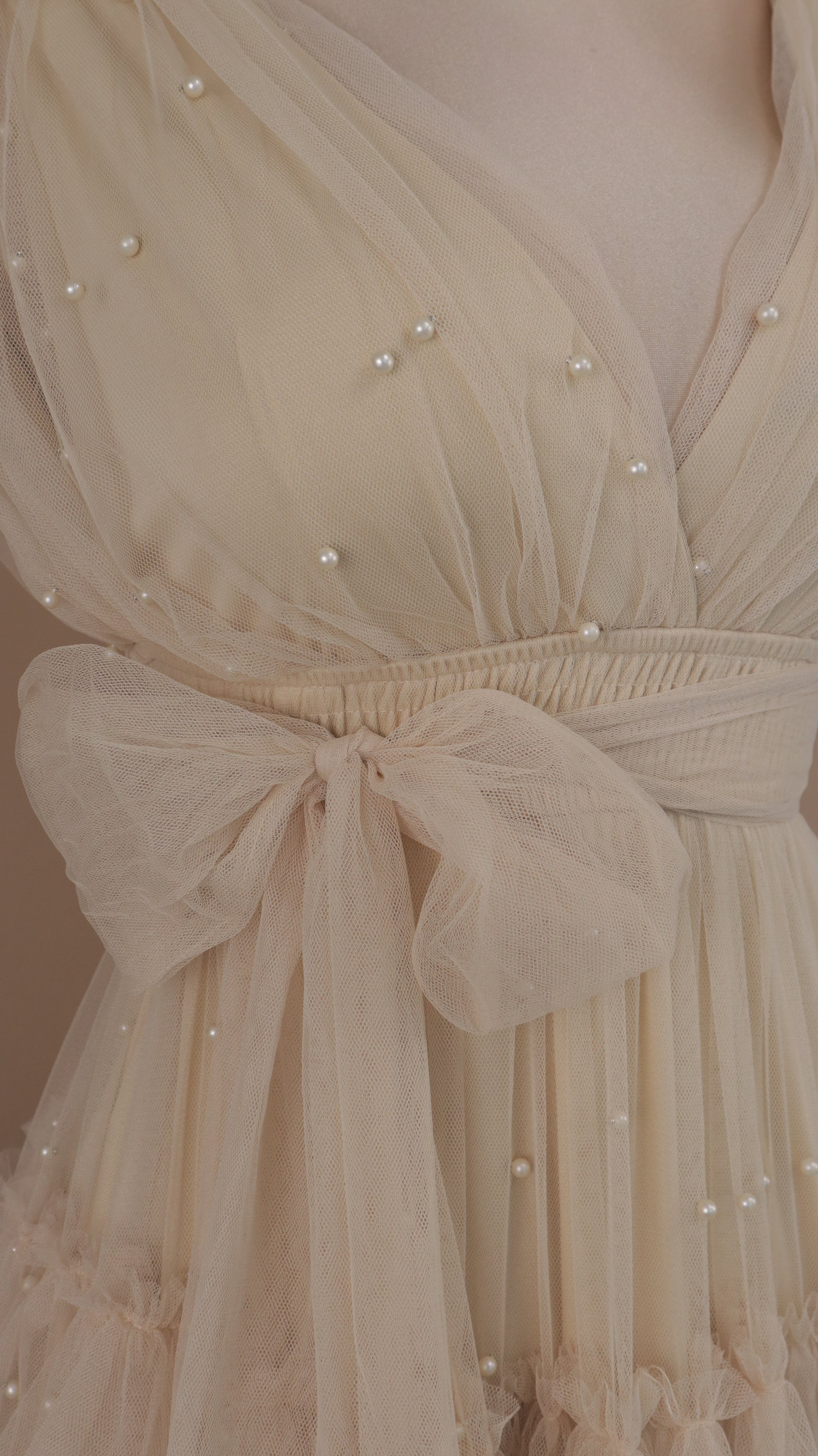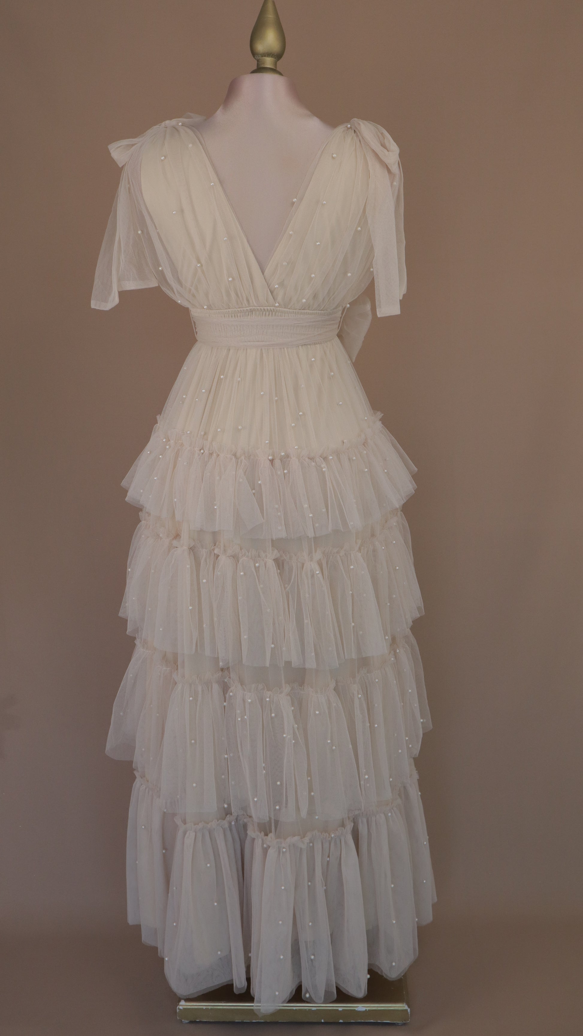 Este vestido lujoso y atemporal combina la belleza del tul con la riqueza de perlas y olanes. El escote en V y la caída en cascada de la falda añaden un toque femenino de estilo único. La línea limpia y elegante es perfecta para cualquier ocasión especial.
