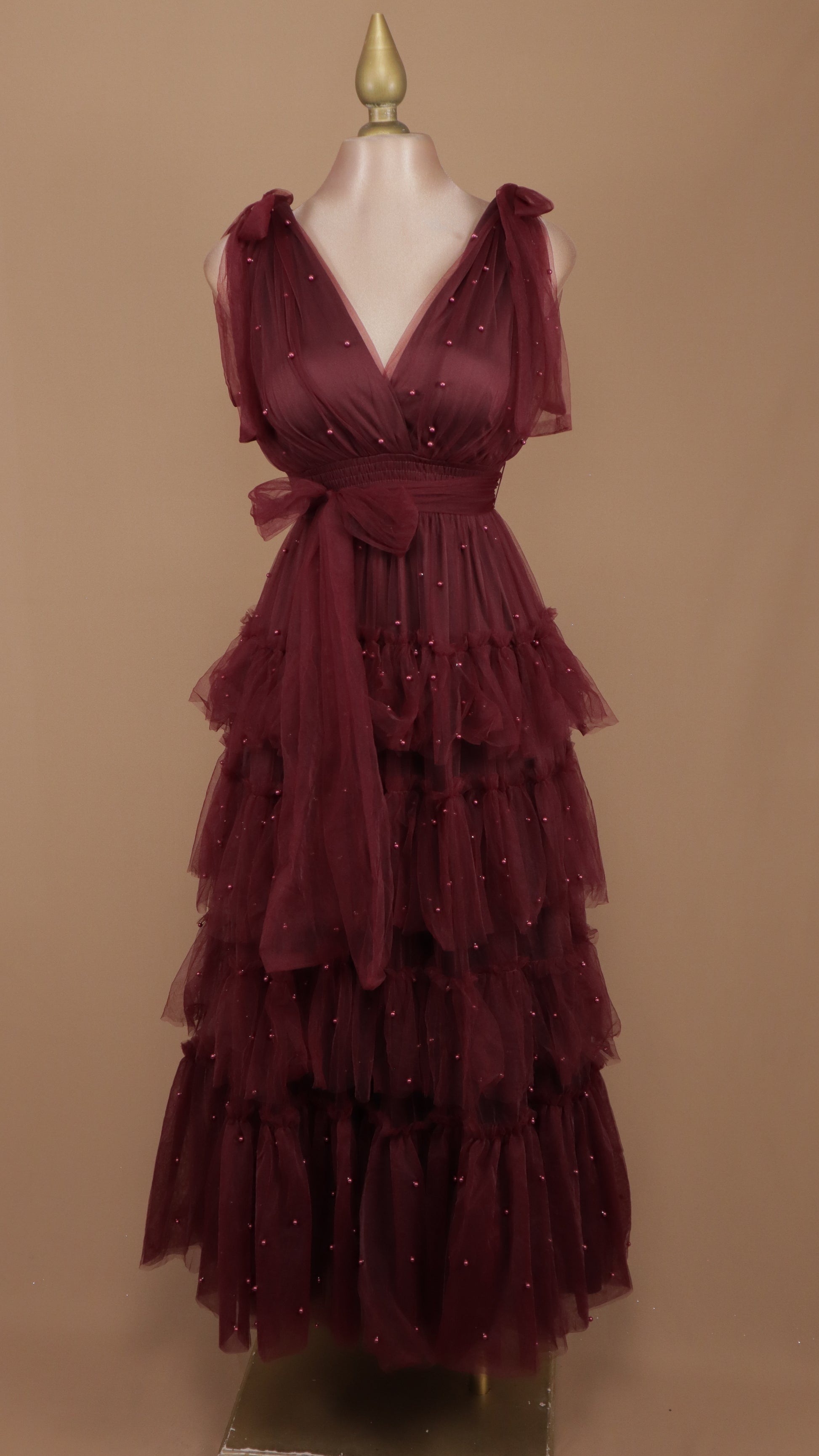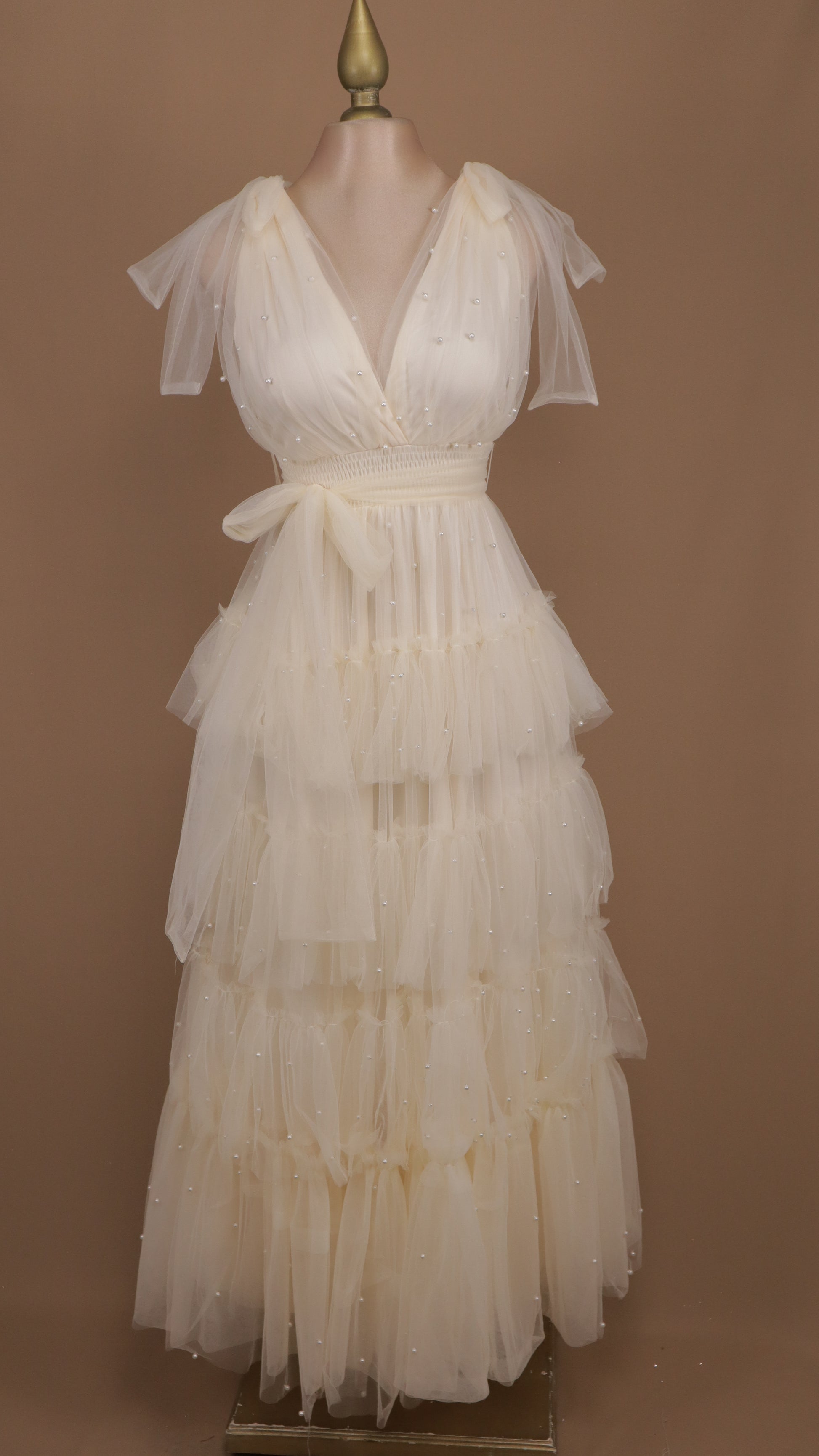Este vestido lujoso y atemporal combina la belleza del tul con la riqueza de perlas y olanes. El escote en V y la caída en cascada de la falda añaden un toque femenino de estilo único. La línea limpia y elegante es perfecta para cualquier ocasión especial.