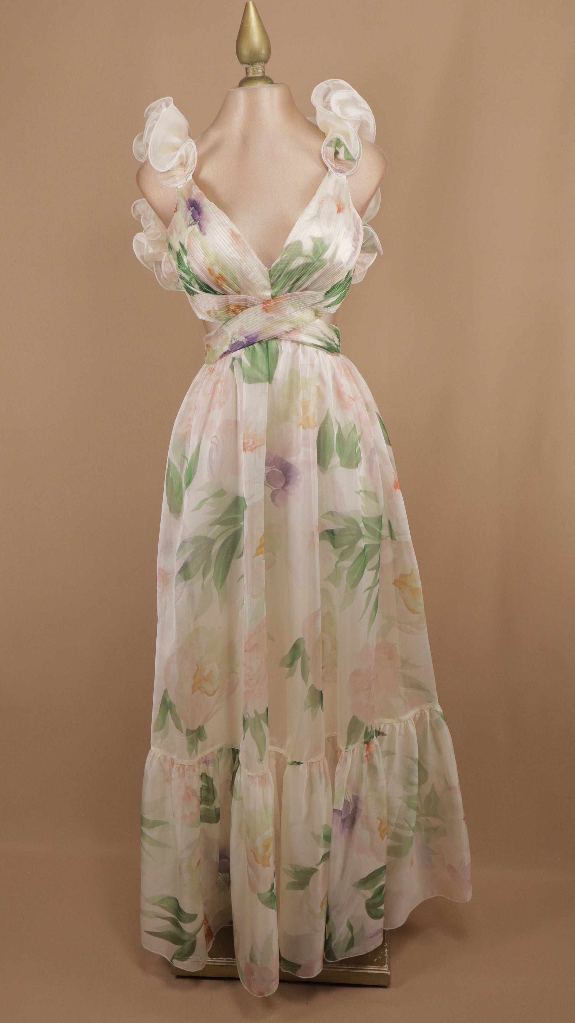 Vestido largo con estampado vibrante que combina elegancia y comodidad. Diseñado con un escote en V que favorece la silueta, complementado por escarolas voluminosas en los hombros que añaden movimiento y un toque romántico al look.