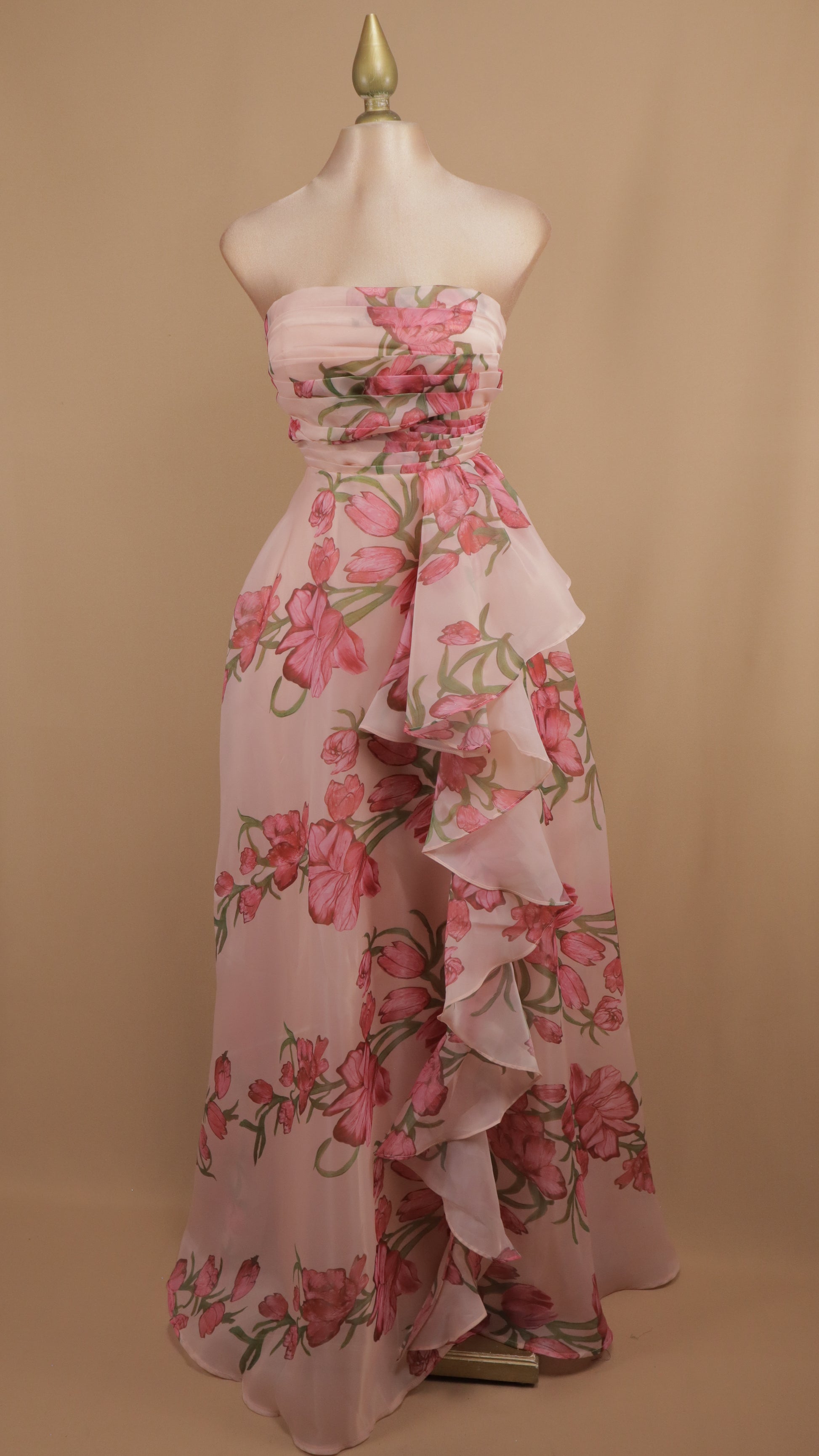 Vestido largo de corte elegante con diseño estraple que realza los hombros y la silueta. Confeccionado en tela estampada que añade movimiento y personalidad a tu look. Detalle de escarola en el bajo que proporciona un toque romántico y femenino. Perfecto para eventos especiales, cenas o cualquier ocasión donde desees lucir sofisticada. La combinación de elementos clásicos con detalles modernos lo convierte en una pieza versátil que trasciende tendencias. Cómodo de usar y fácil de combinar con accesorios minimalistas o llamativos según tu estilo personal.