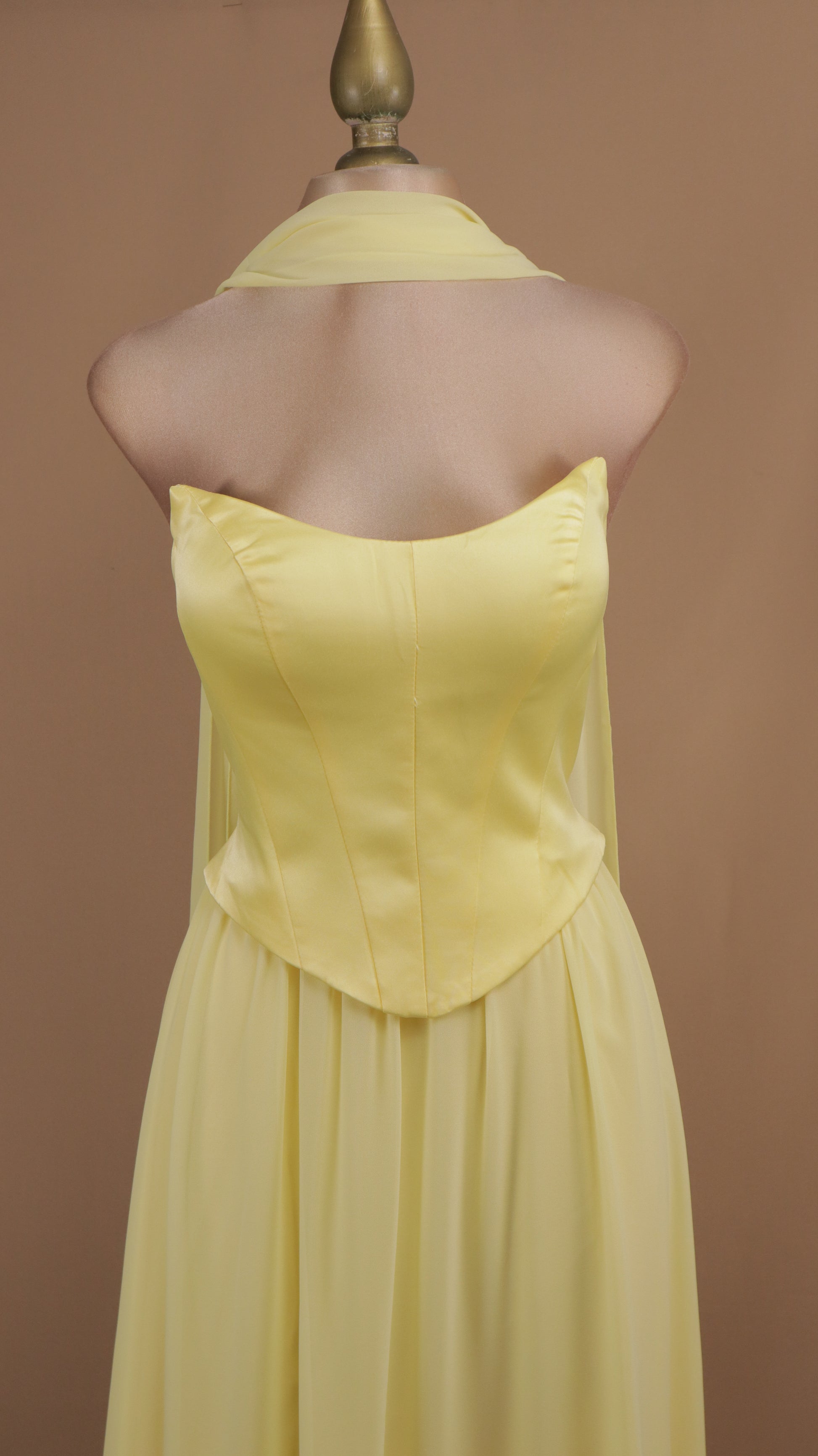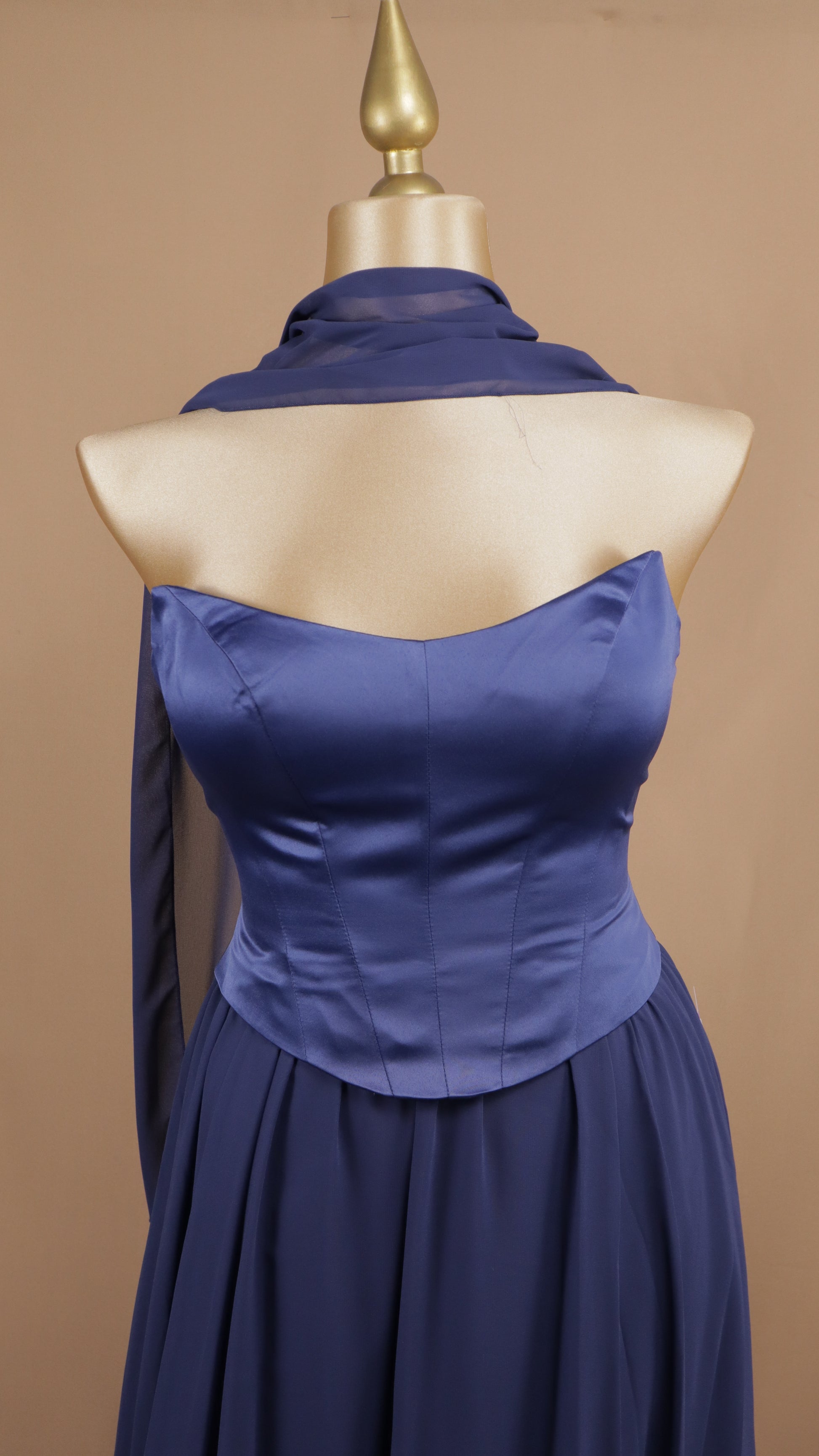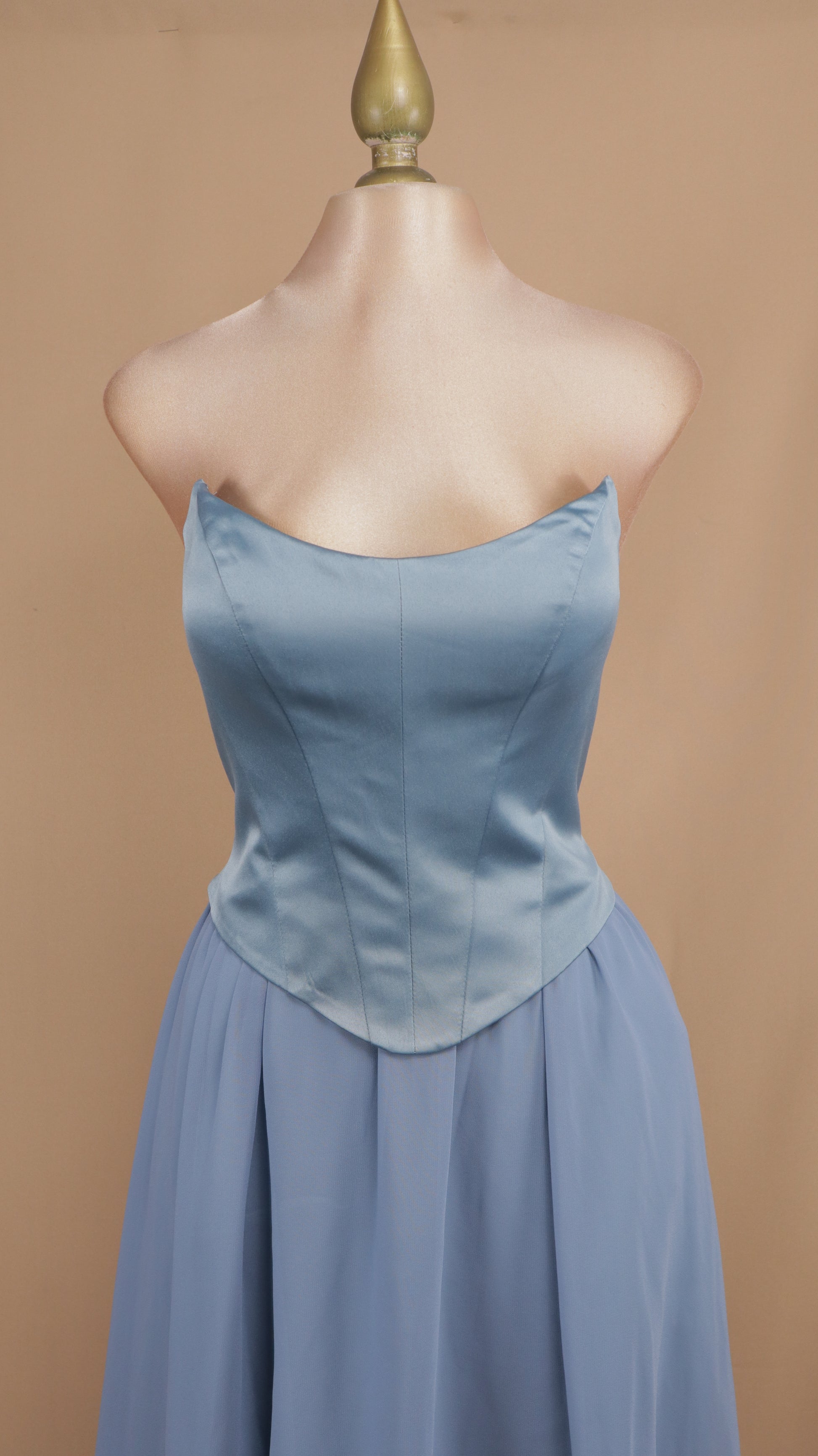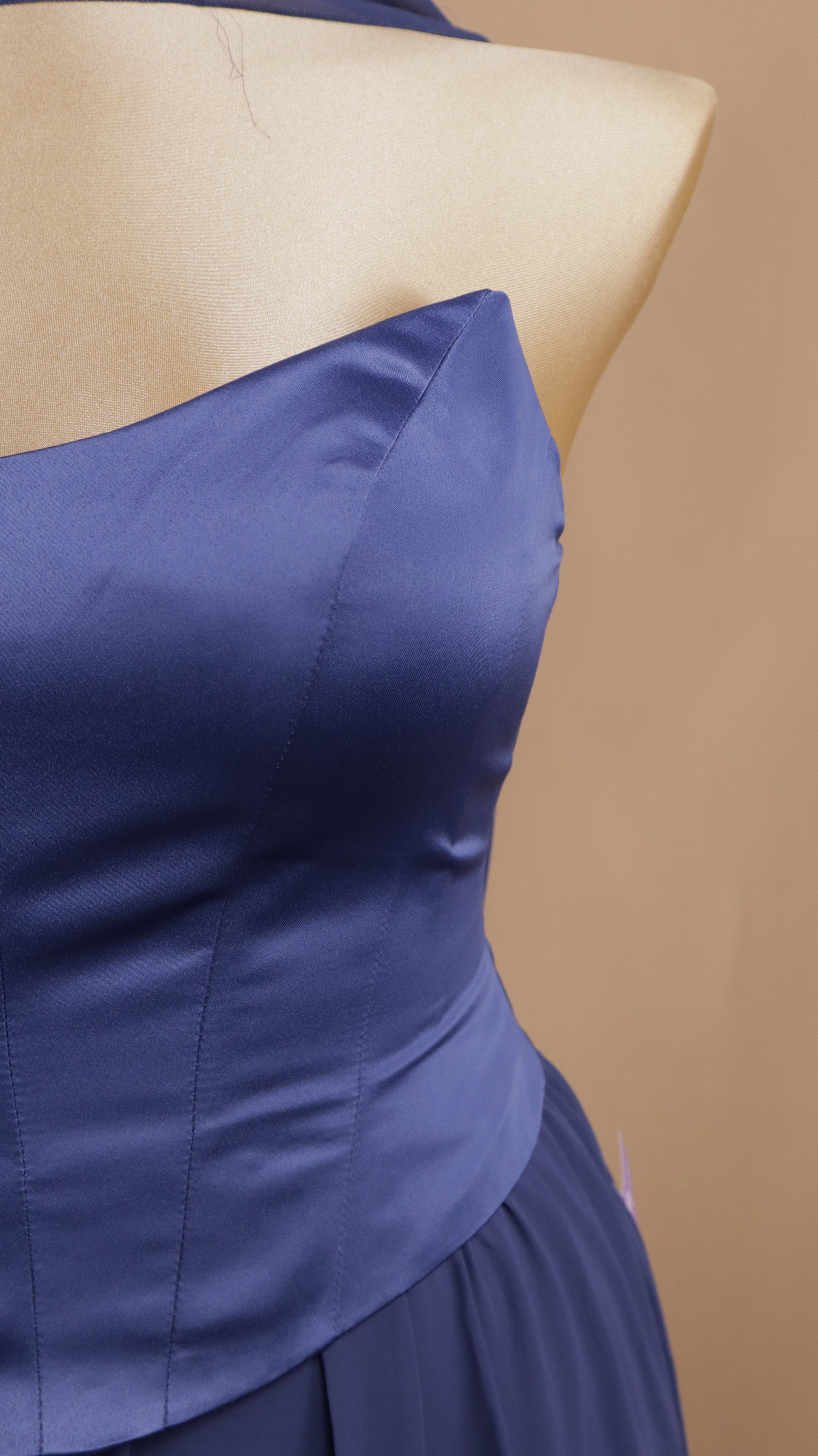 Vestido largo elegante con diseño estraple que combina un corset estructurado con una falda fluida de chiffon. El corset ajustado realza la silueta mientras que el chiffon cae suavemente creando movimiento y gracia. Perfecto para eventos especiales, bodas o noches de gala. El escote estraple ofrece un toque sofisticado y femenino.
