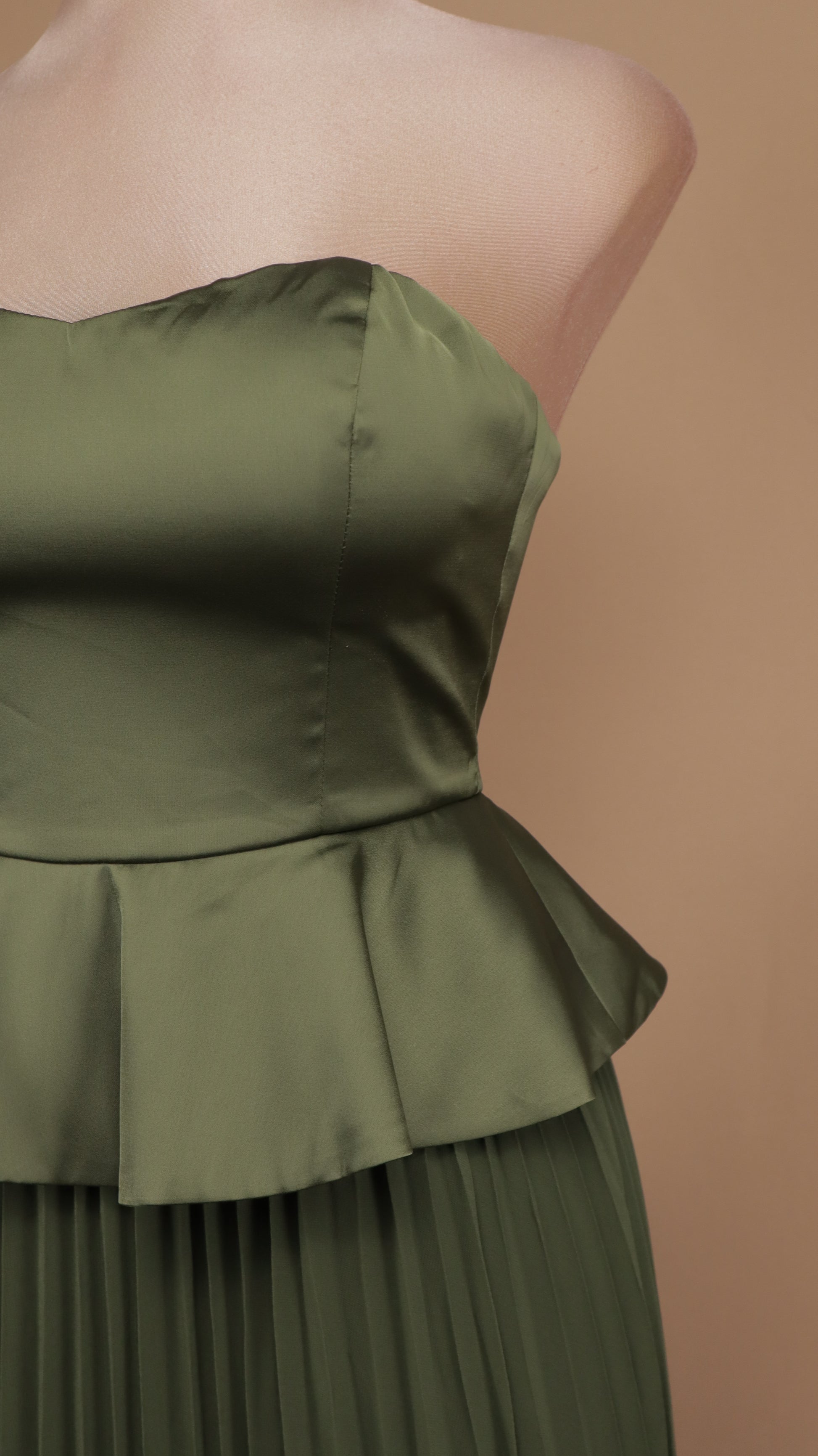 Este vestido strapless con falda plisada combina elegancia y comodidad, ideal para eventos especiales. Su diseño sin tirantes realza el escote, mientras que la falda plisada añade movimiento y sofisticación a cada paso. Perfecto para lucir un estilo femenino y moderno con facilidad.