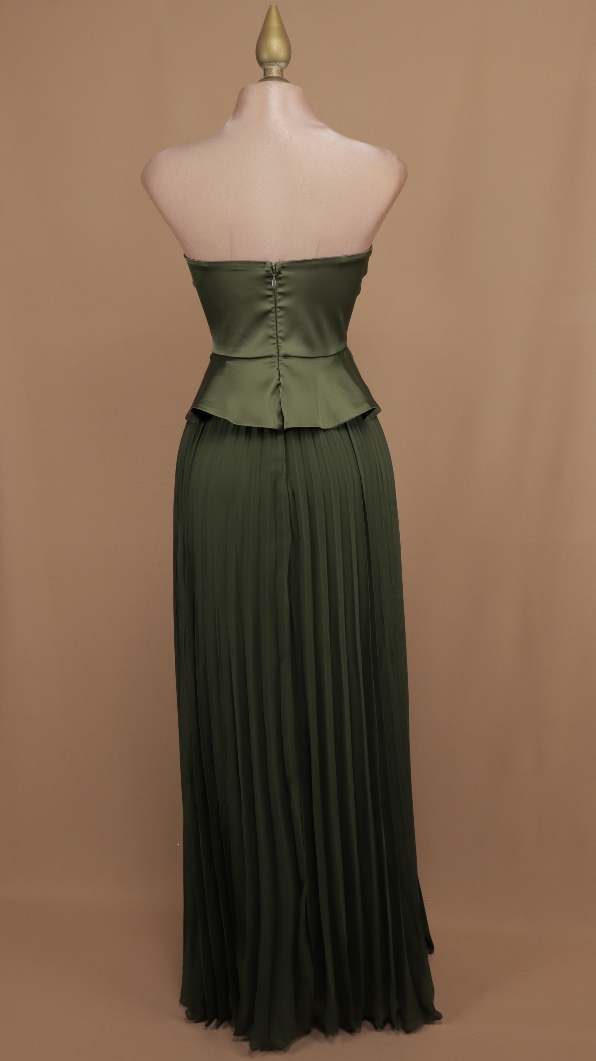 Vestido largo estraple con olan en cintura y falda plisada