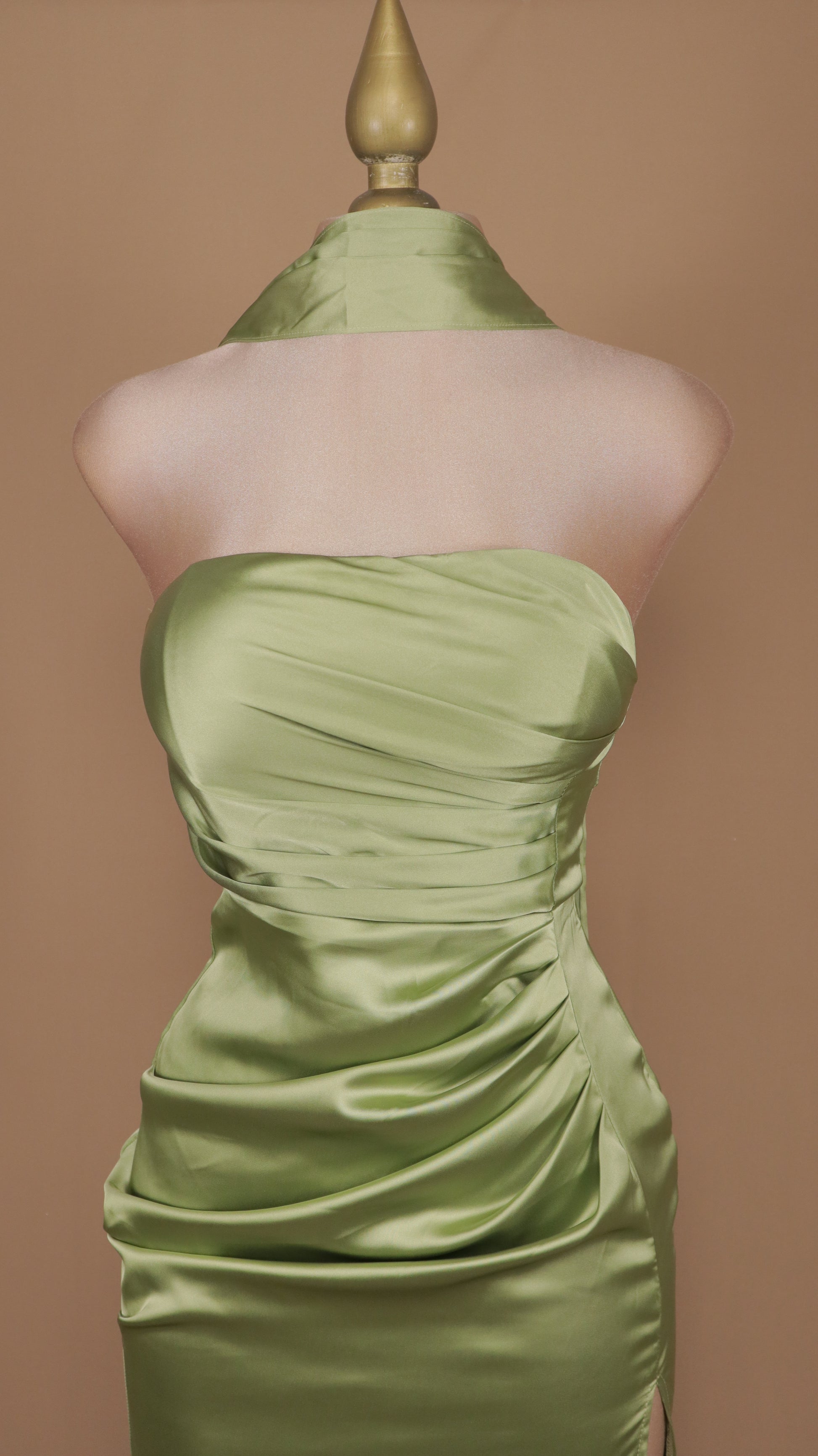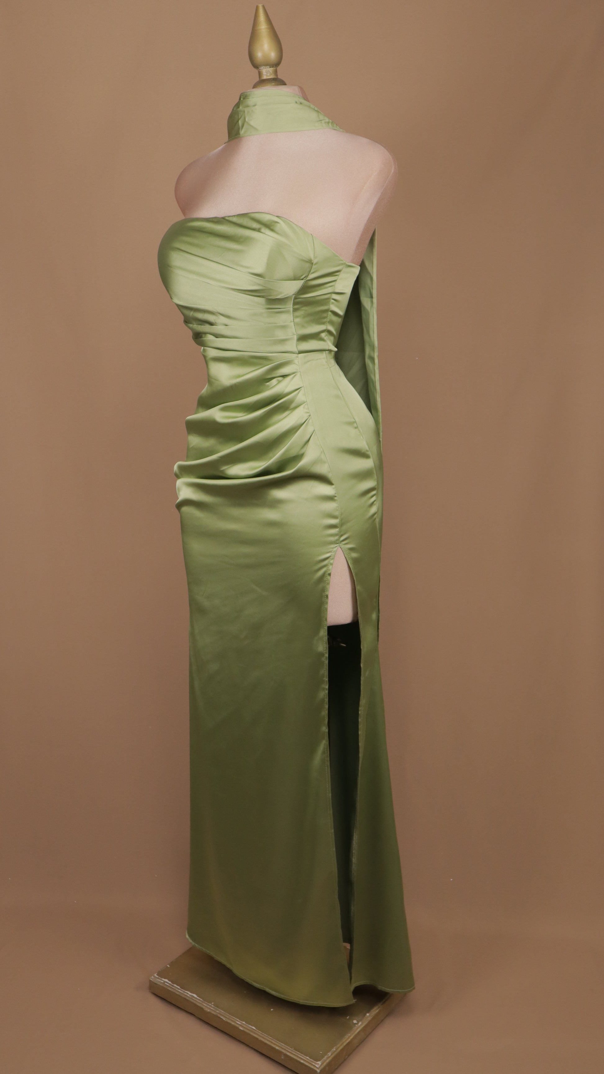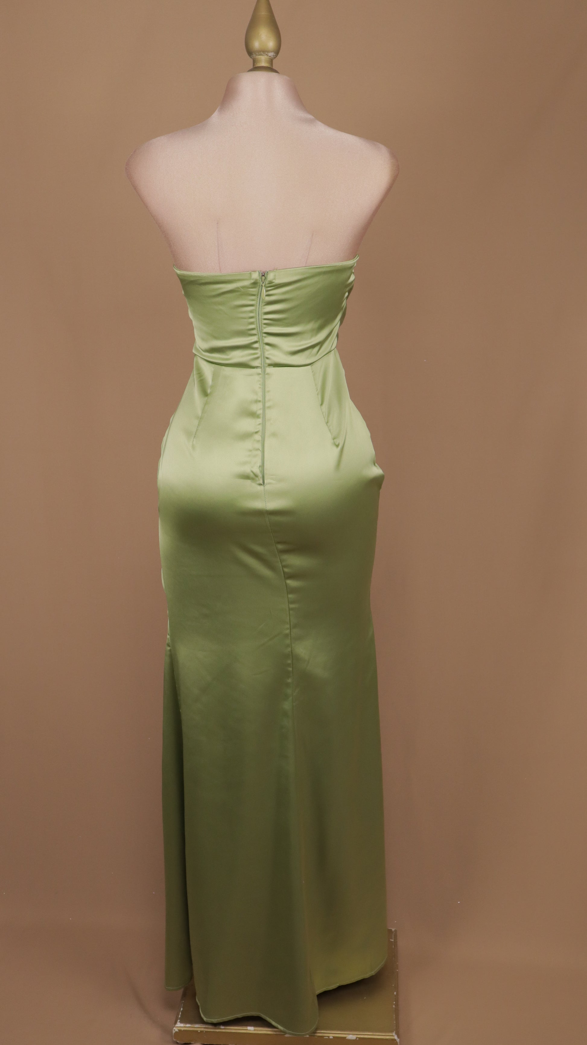 Vestido largo estraple de satín con abertura en pierna