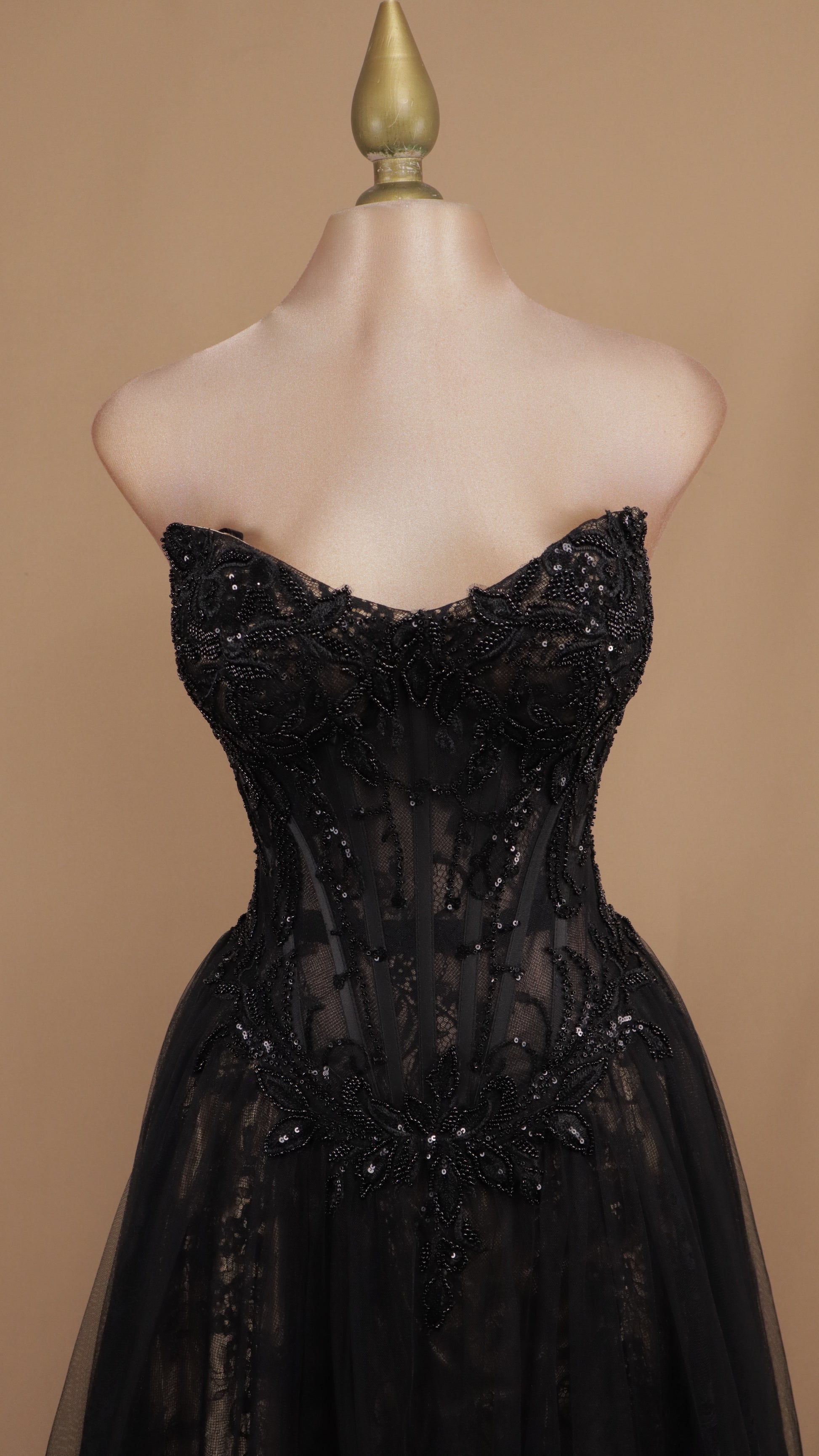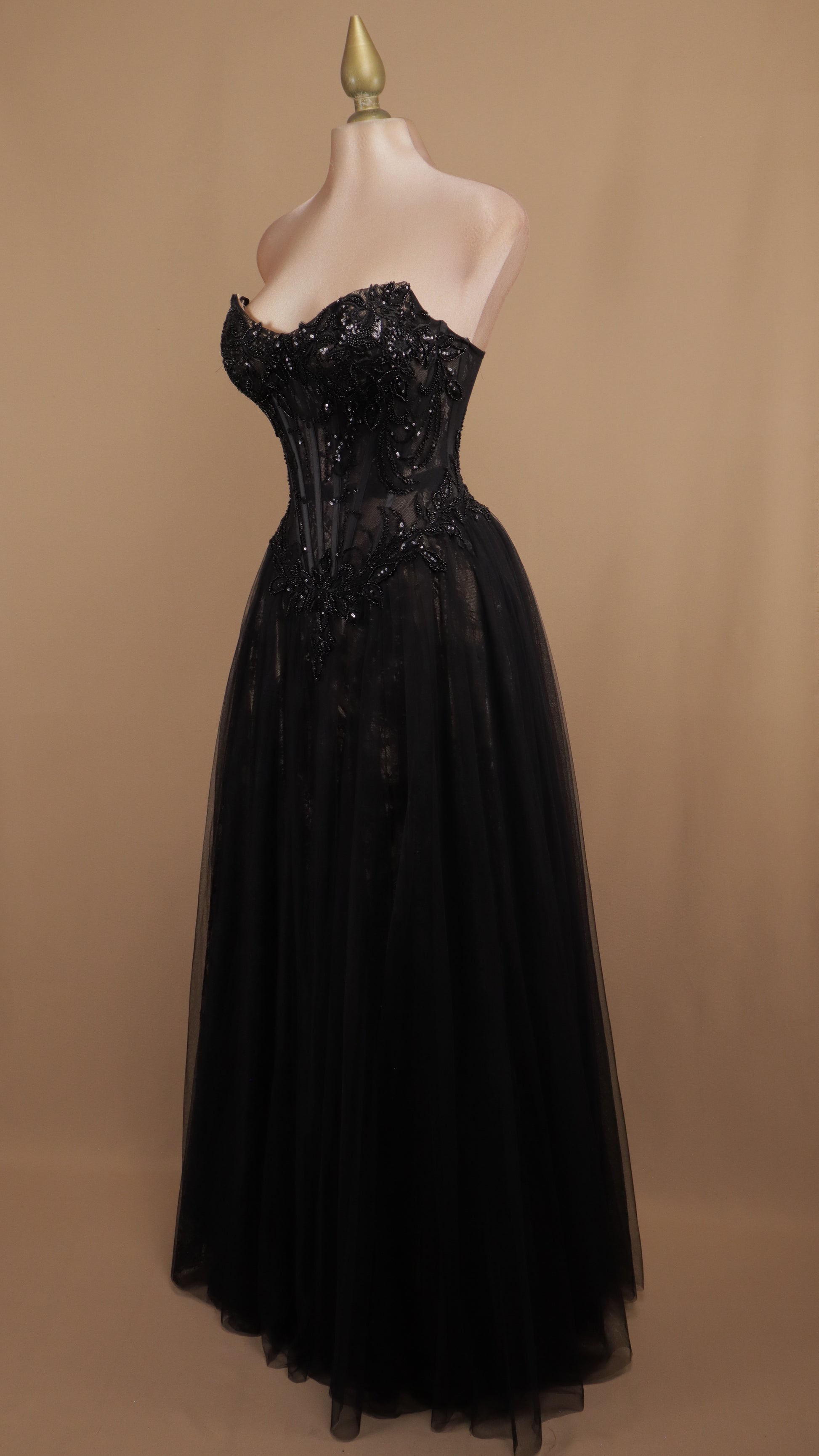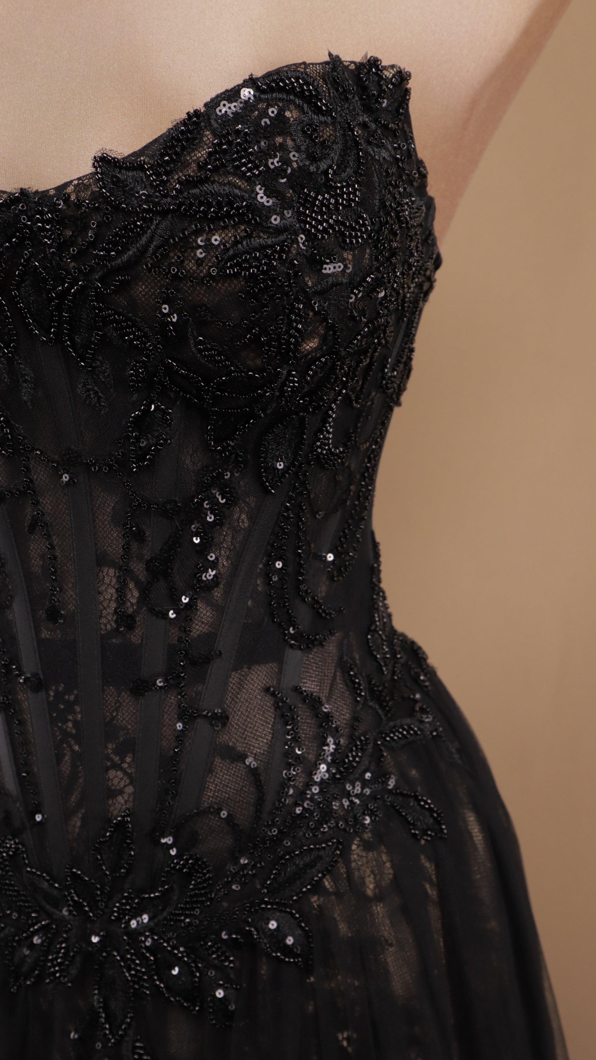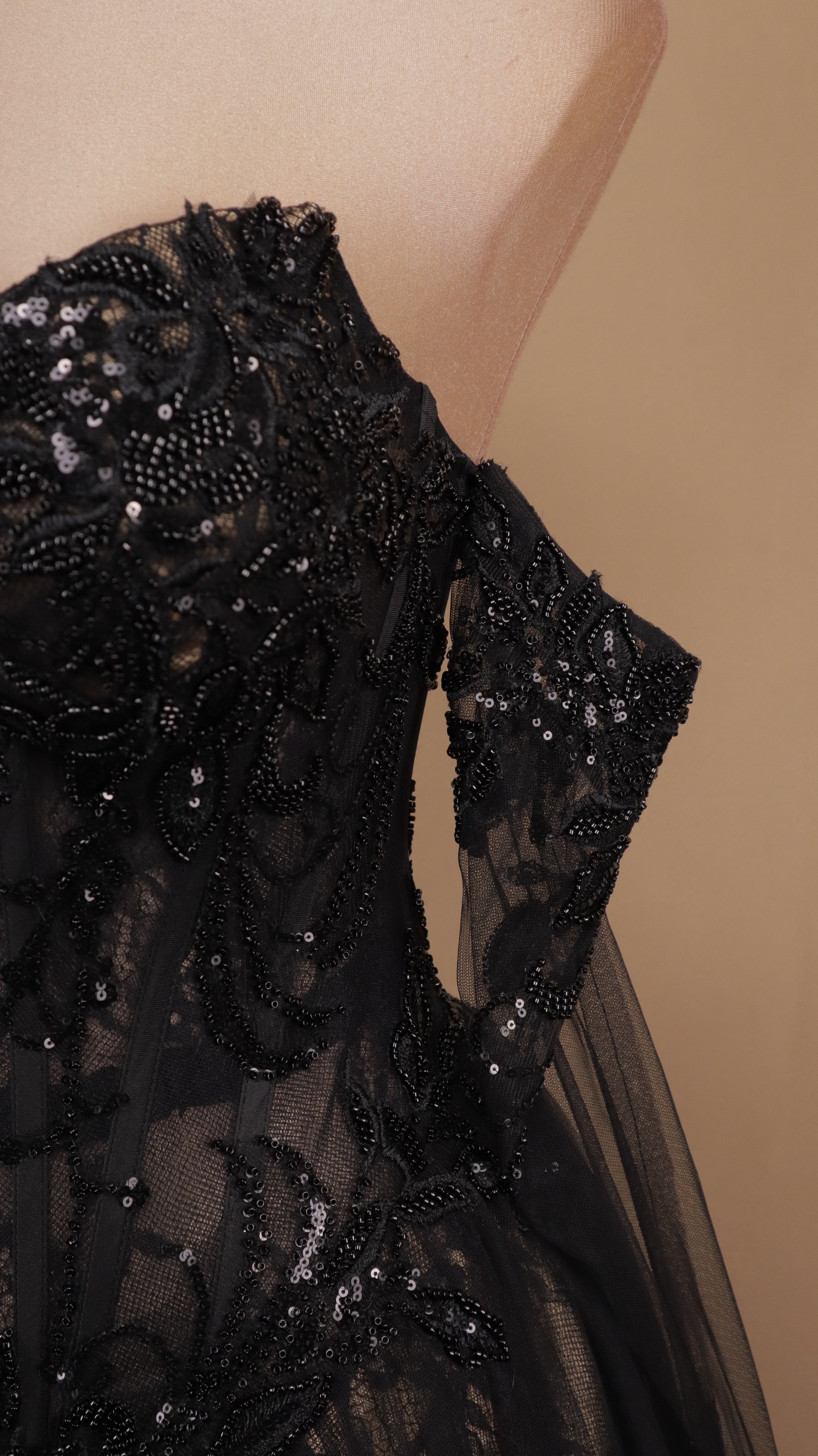 Vestido largo estraple y manga desplegable con aplicación y tull