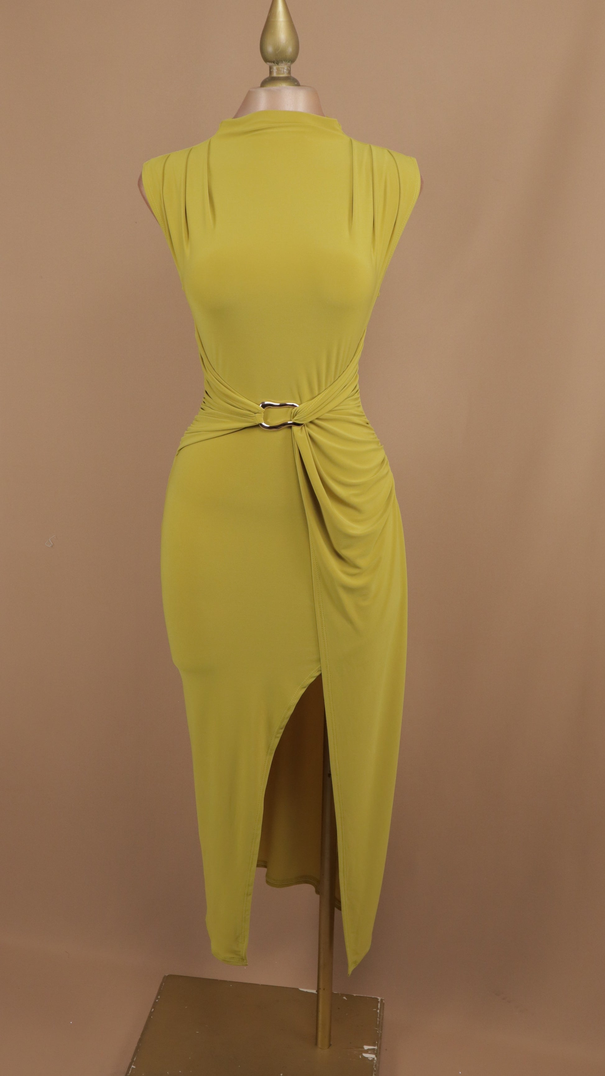 Vestido midi elegante que combina sofisticación y comodidad en una sola prenda. Diseñado con una argolla decorativa en la cintura que realza tu silueta y define tu figura de manera favorecedora. La abertura estratégica en la pierna añade un toque de sensualidad y movimiento, permitiéndote lucir segura en cualquier ocasión. Perfecto para eventos especiales, cenas o salidas nocturnas donde quieras destacar. La tela fluida se adapta a tu cuerpo mientras mantiene la elegancia que mereces. Una inversión en estilo que te hará sentir hermosa y confiada.